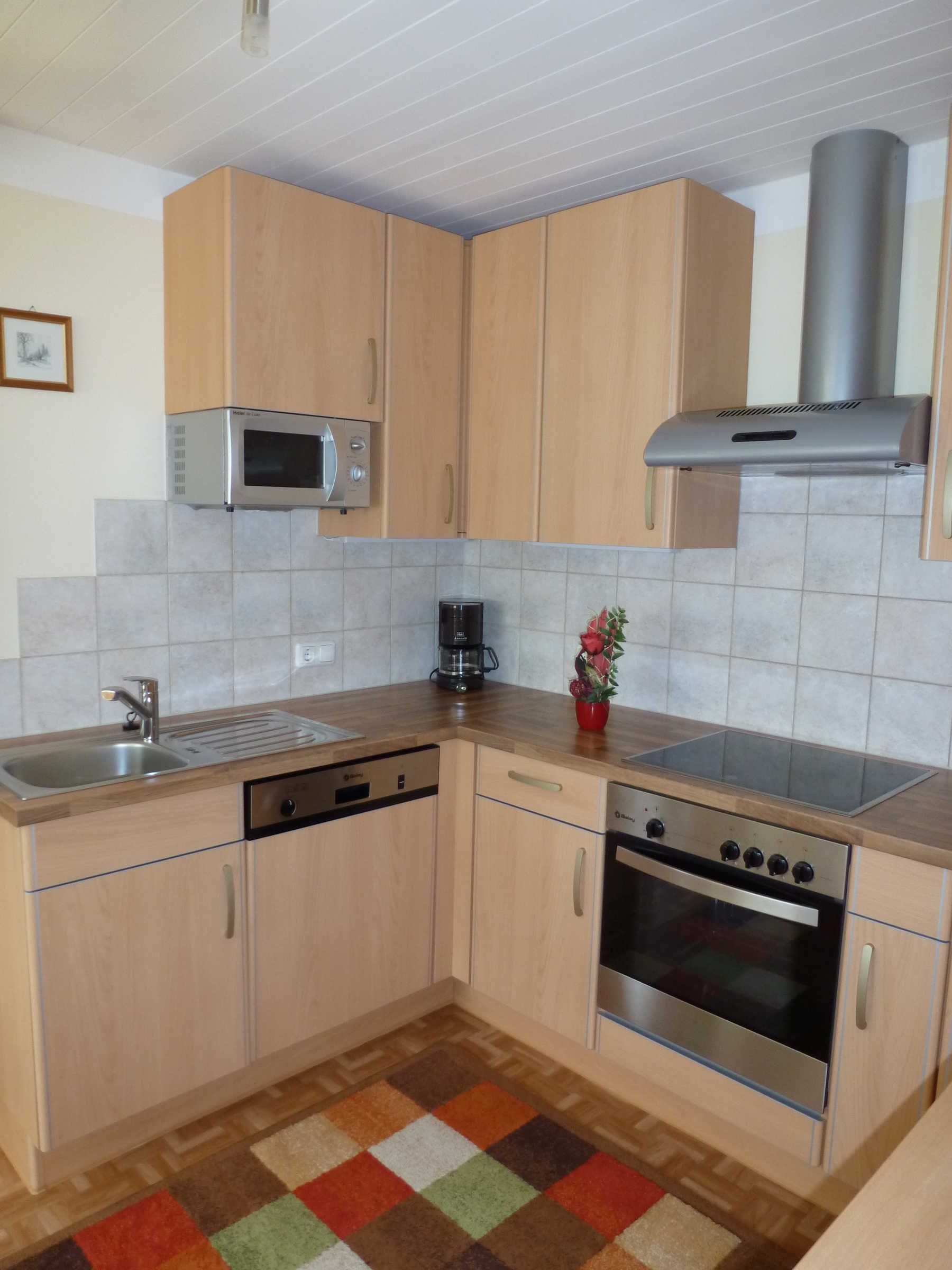 - Wohnraum mit Küchenzeile (Kühlschrank, Cerankochfeld, Backofen, Mikrowelle, Geschirrspüler) und gemütlicher Essecke mit Eckbank