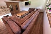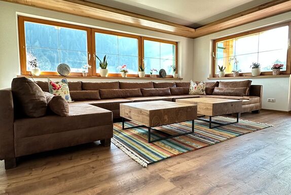 - Wohnzimmer mit großer Couch, Kachelofen (nur zur Dekoration) und Flat-TV