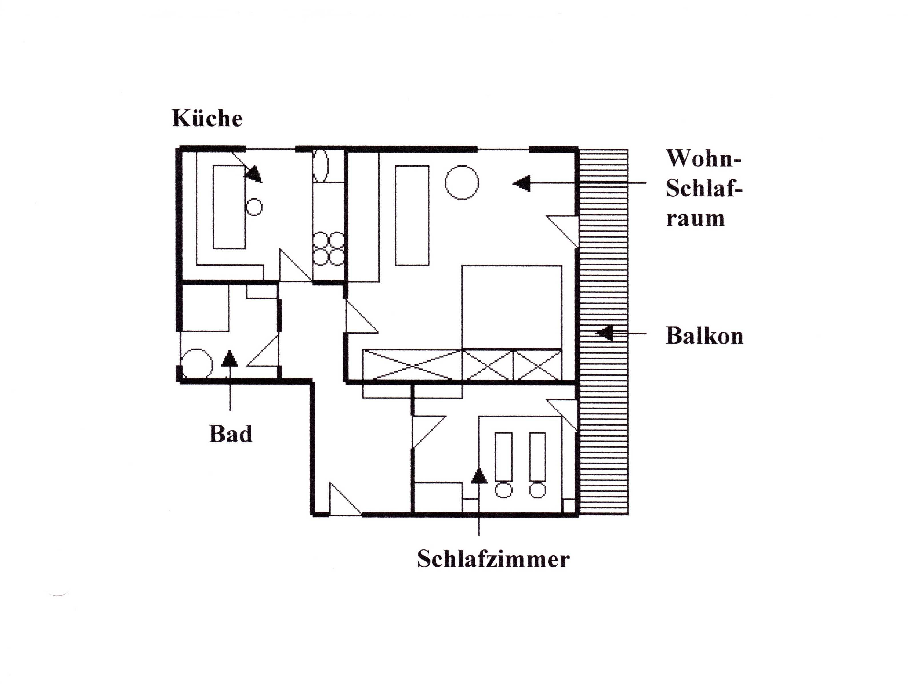 Wir bieten Ihnen eine gemütliche Ferienwohnung mit Bad (WC, Dusche und Waschbecken), komplett eingerichteter Küche mit Essecke, Wohn-Schlafraum, Schlafzimmer und eigenem Balkon.