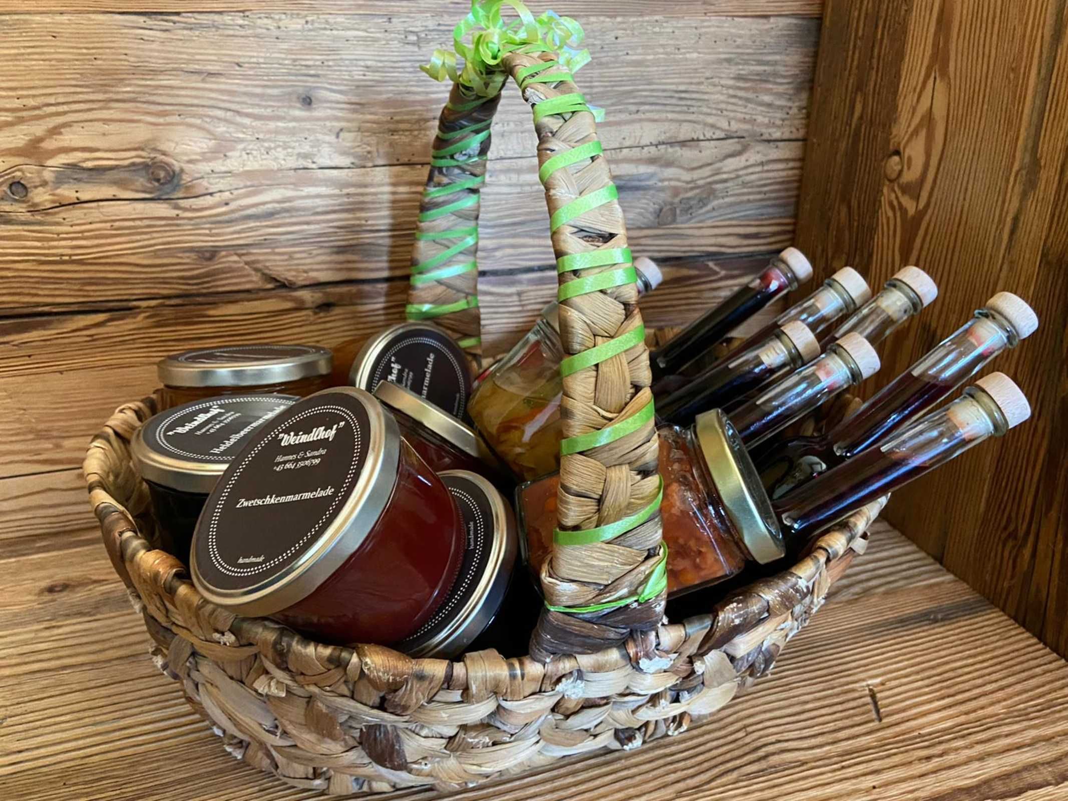 Wir bieten auch Schnäpse, die wir eigens für sie am Hof brennen, sowie Liköre, Wurstprodukte, Marmeladen uvm. zum Kauf an.