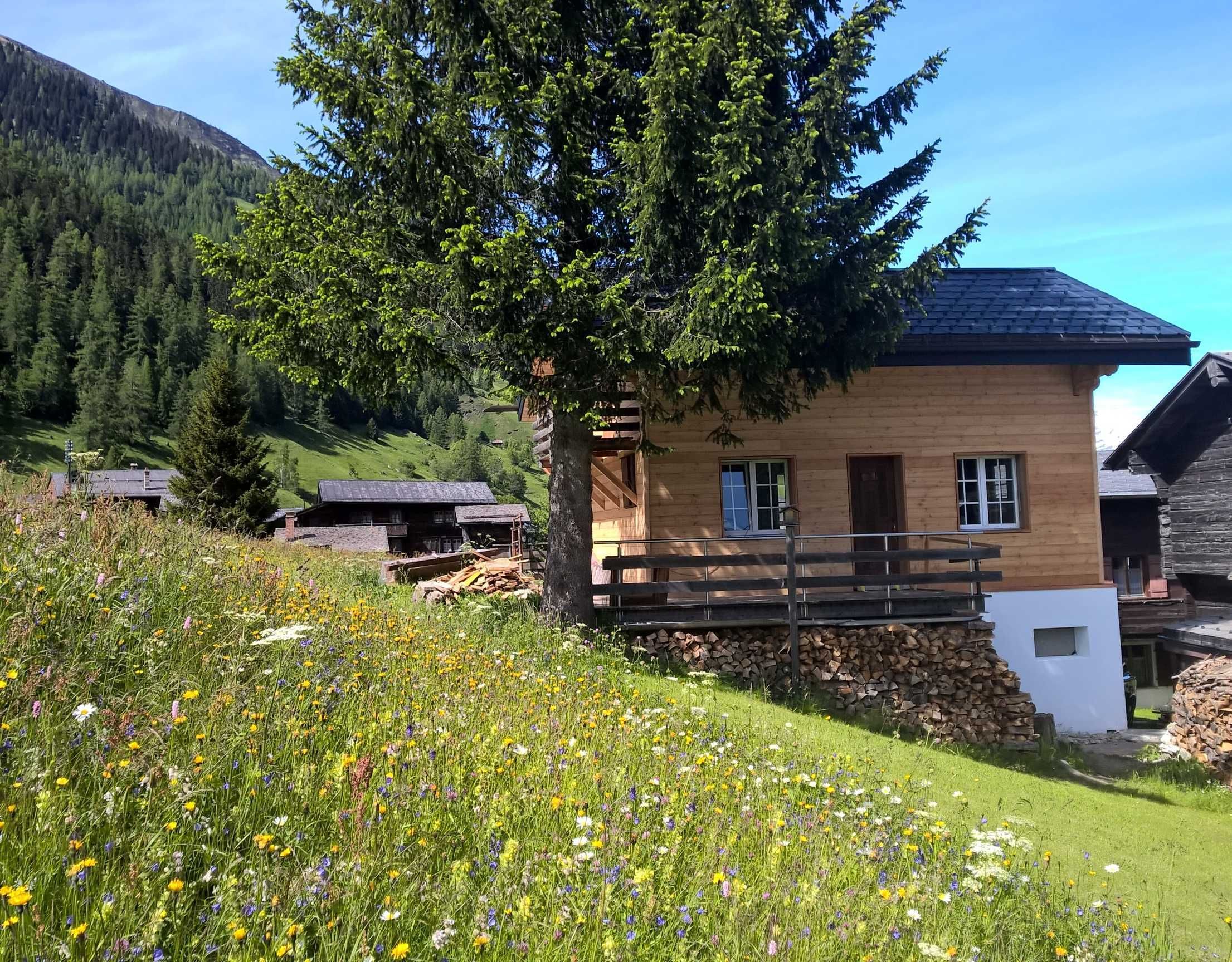 Das Chalet liegt am Dorfrand von Gluringen und ist umgeben von blühenden Bergwiesen.