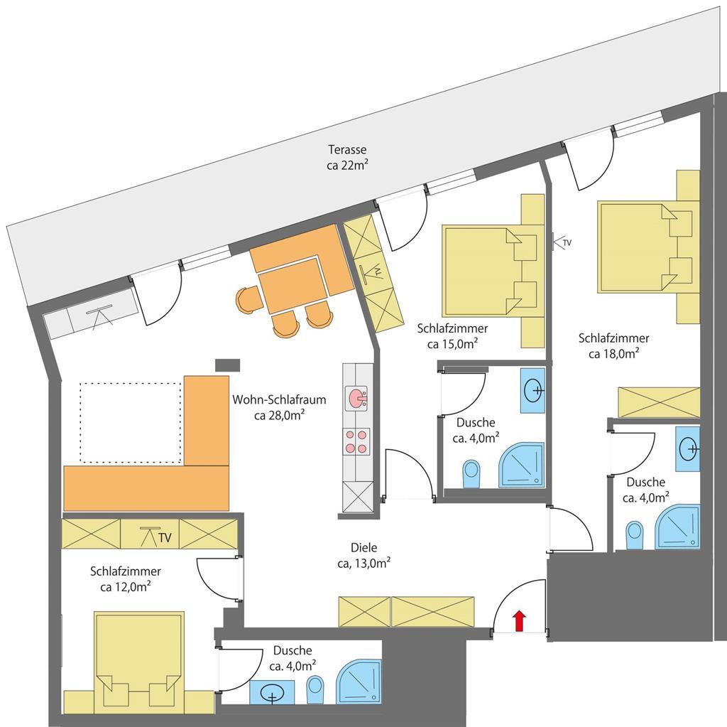 4 Zimmer-Wohnung , ca. 95 m², 3 Doppelzimmer mit jeweils Dusche/WC, Flur mit Garderobe, gemütliche Wohnküche mit Couch, Essecke mit Küchenblock (Backrohr, Ceranfeld, Dunstabzug, Kühl-Gefrierschrank, Mikrowelle, Geschirrspüler, Kaffeemaschine, Wasserkocher, Toaster), 4x Digital-Flat-TV mit Radio, Balkon, Aufzug