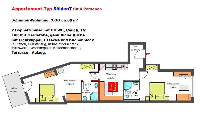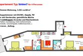 3 Zimmer-Wohnung, ca. 60 m², 2 Doppelzimmer mit Dusche/WC, kleine Wohnküche mit Essecke und Küchenblock (Backrohr, Ceranfeld, Dunstabzug, Kühl-Gefrierschrank, Mikrowelle, Geschirrspüler, Kaffeemaschine, Wasserkocher, Toaster), 2x Digital-Flat-TV mit Radio, Balkon, Aufzug