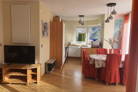 Die neue Ferienwohnung mit eigenem Eingang ist ca. 65 m2 groß und verfügt über 2 Schlafzimmer, großen Wohn-Essbereich sowie integrierter Wohnküche. Sie ist mit Laminatböden in den Wohn- und Schlafzimmern sowie Fliesen im Eingangsbereich und im Badezimmer ausgestattet. Die großen Terrassentüren und der Esserker gestatten einen herrlichen Panoramablick auf den Acherkogl und das Skigebiet Hochoetz. Die Küche ist komplett ausgestattet mit Geschirrspülmaschine, Mikrowelle, Backofen, Kaffeemaschine, Kühlschrank, Geschirr und Geschirrtüchern, im Wohnzimmer mit Smart-TV und mit einer Waschmaschine im Badezimmer.
