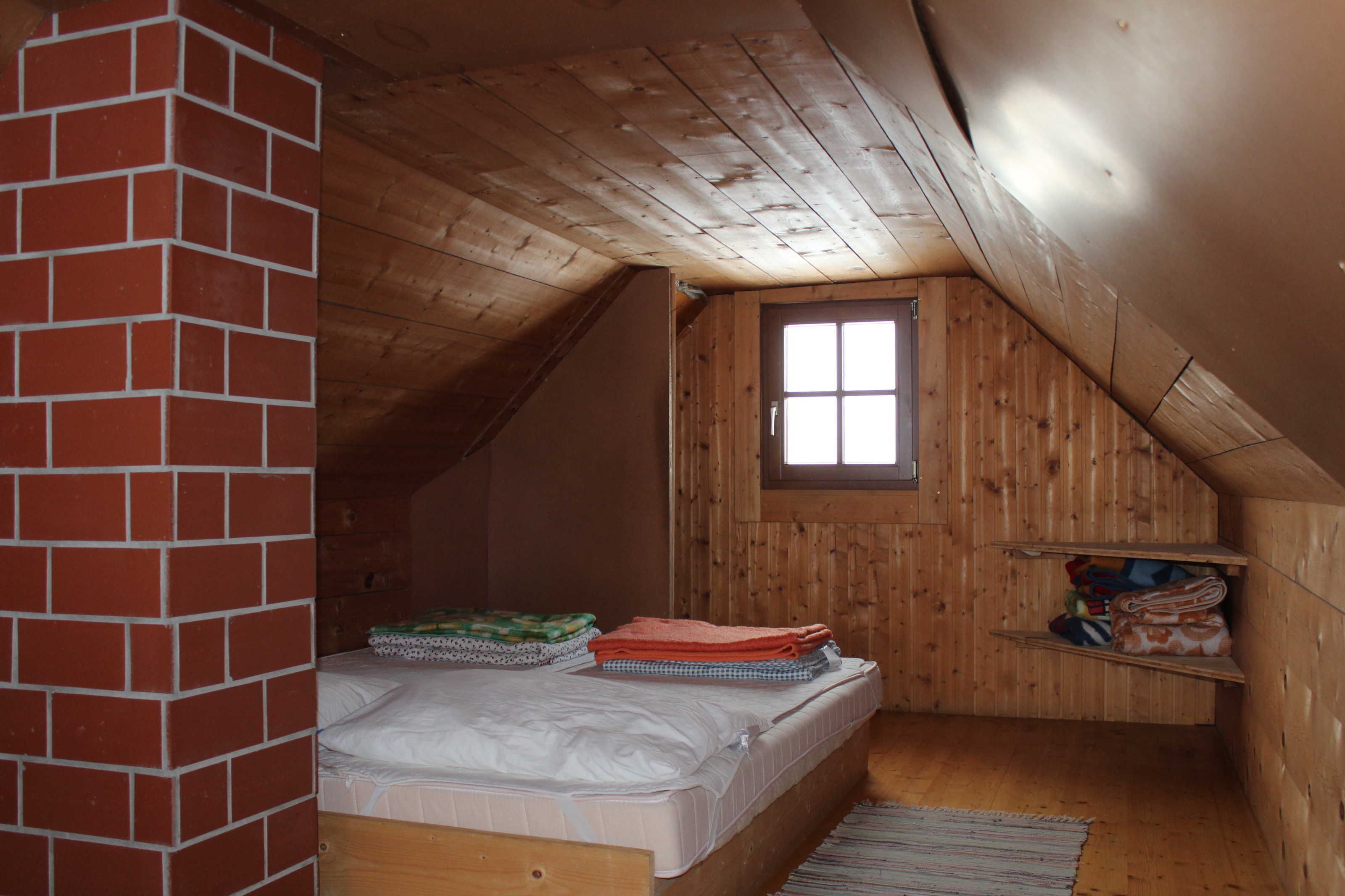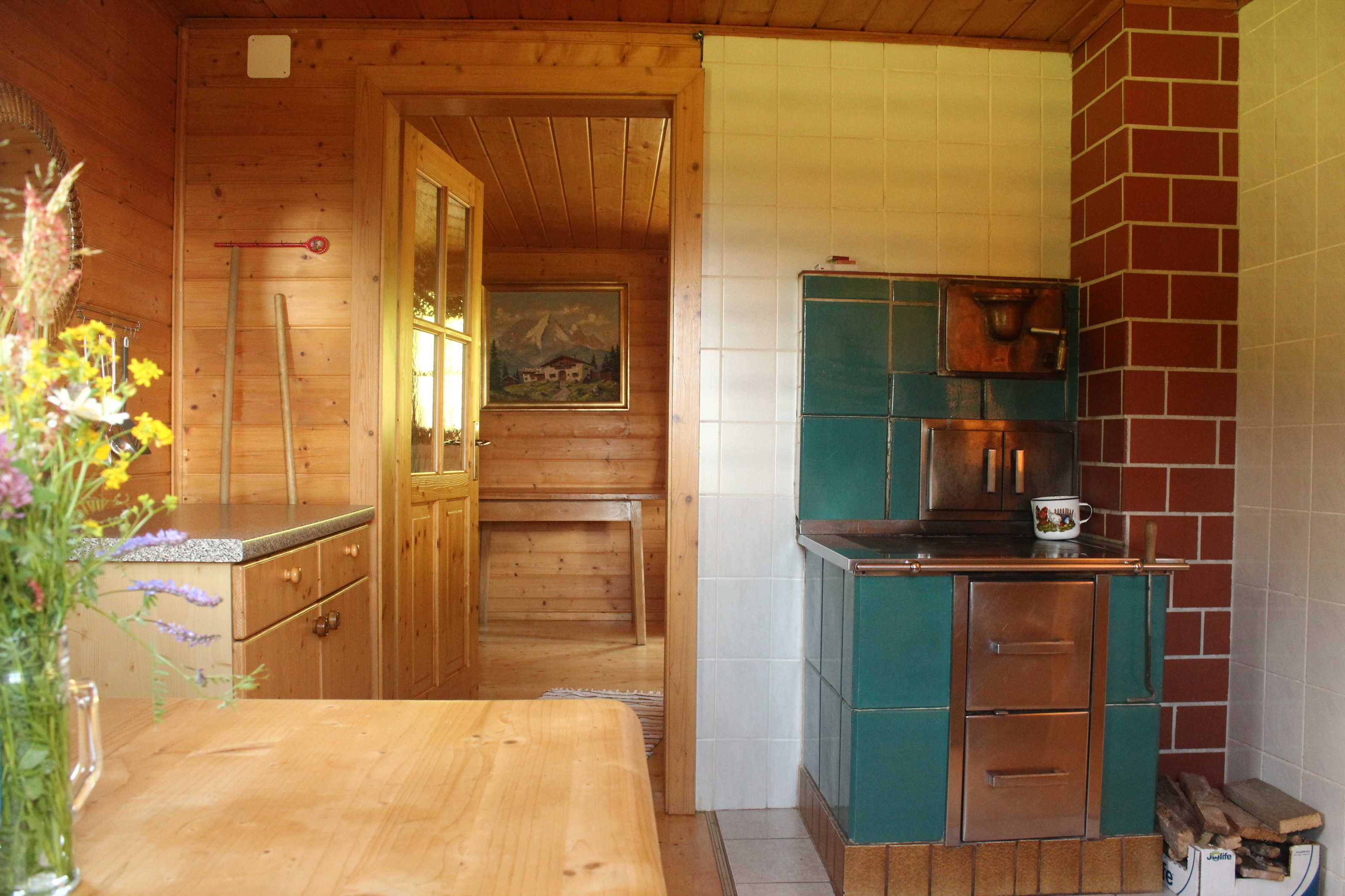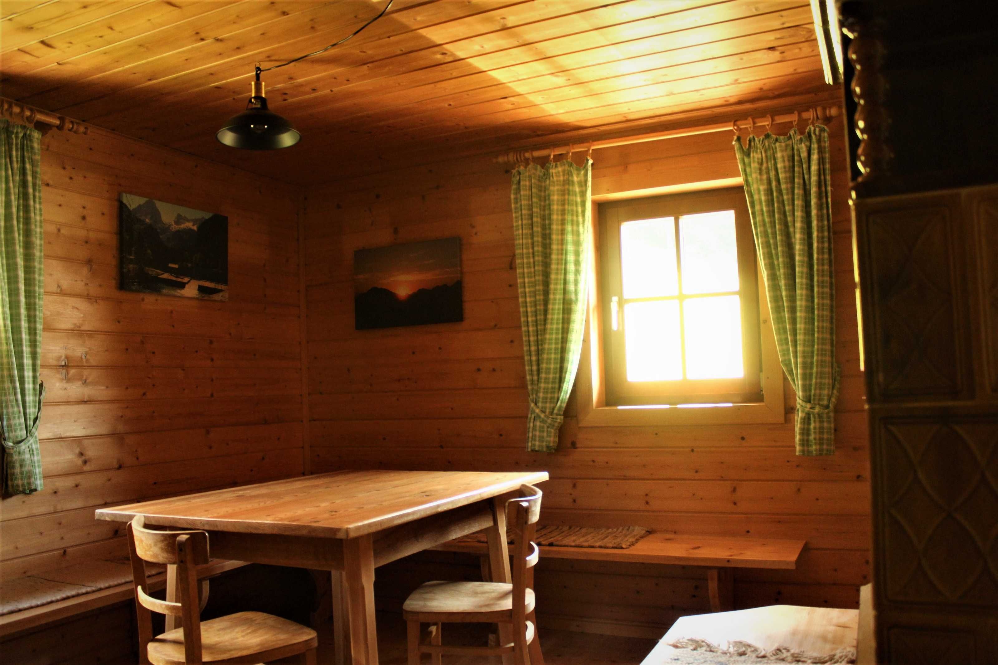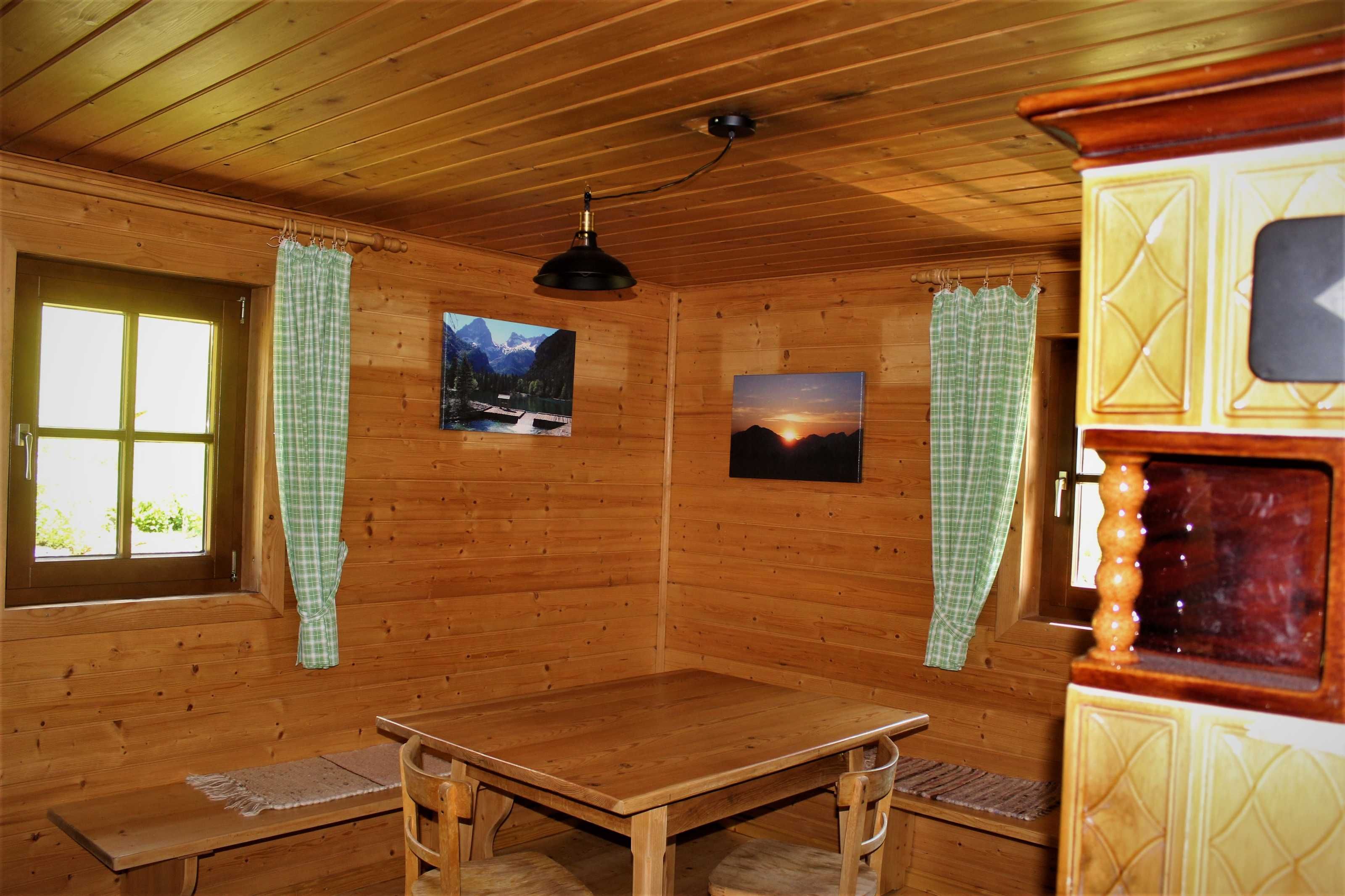 Es gibt bei uns auf der Almhütte einen kleinen Vorraum sowie ein seperates WC, in der gemütlichen Küche gibt es einen Tischherd der mit Holz zu heizen ist und eine vollausgestattete Küche mit fließend Wasser sowie eine Sitzecke. Im danebenliegenden Wohnstube steht ein schöner Kachelofen der von der Küche aus mitgeheizt wird. Die große Sitzecke und die Coach laden ein für gemütliche Abendstunden. Im oberen Stock befindet sich der Schlaufraum mit einem Doppelbett und einem Schlaflager für 5 Personen.