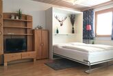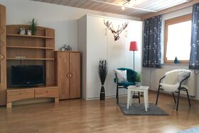 Unsere Ferienwohnung „Wiesenruh“ bietet ihnen auf 65m² ein großes Wohnzimmer mit gemütlichem Sofa und SAT-TV.