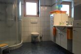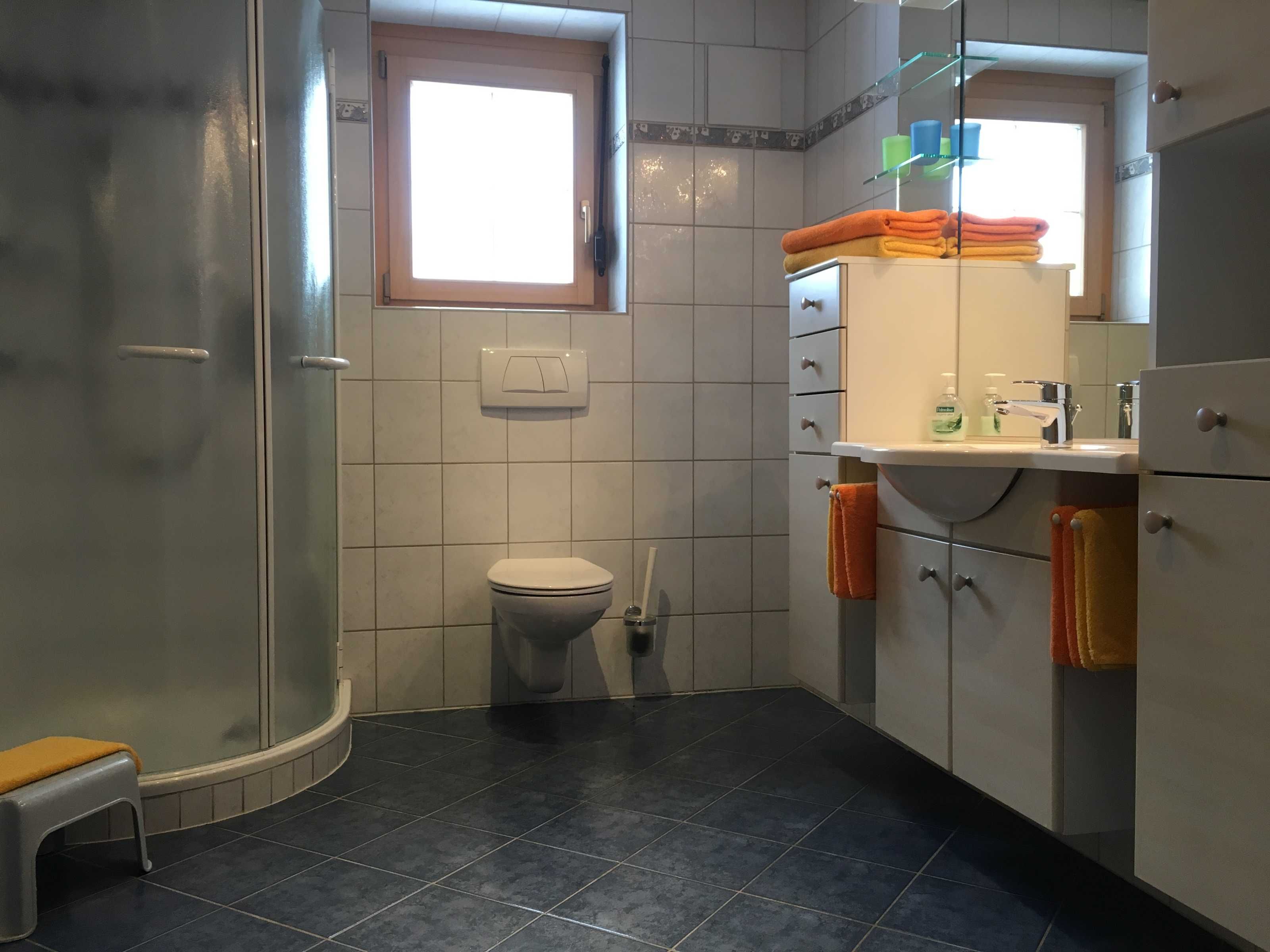 In unserem Badezimmer mit Dusche und WC sind genügend Ablagefächer und Platz vorhanden.