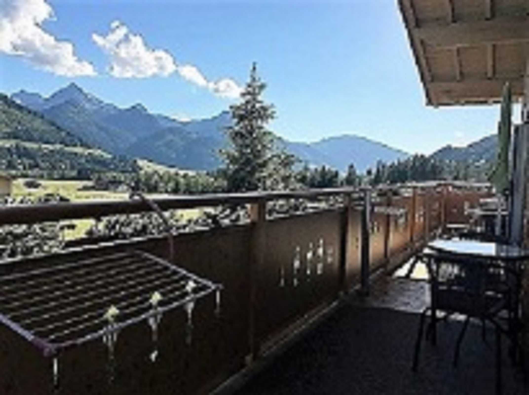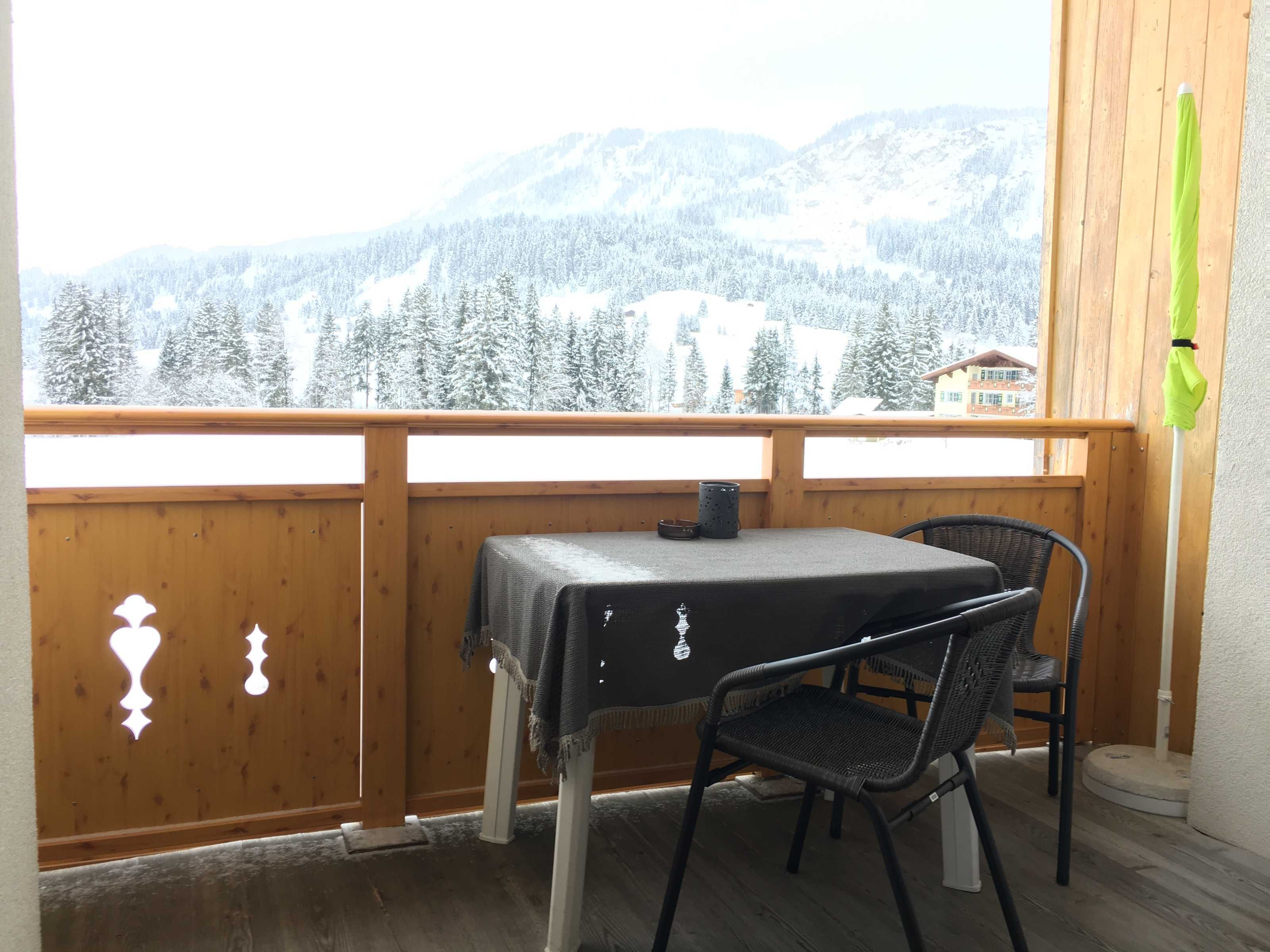 Auf dem Balkon mit Sitzgelegenheit genießen Sie die Ruhe mit unverbautem Blick auf die Tannheimer Berge.