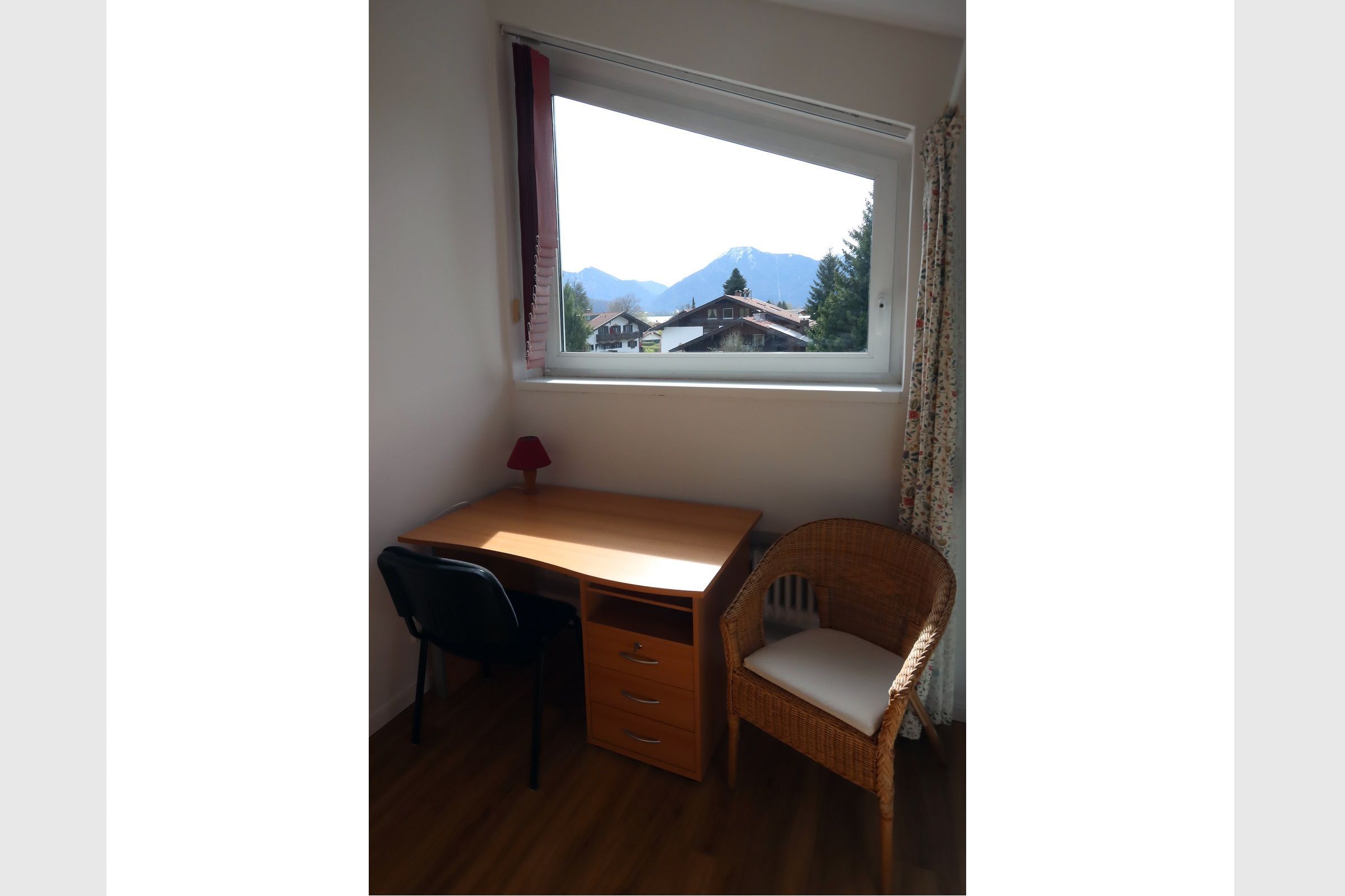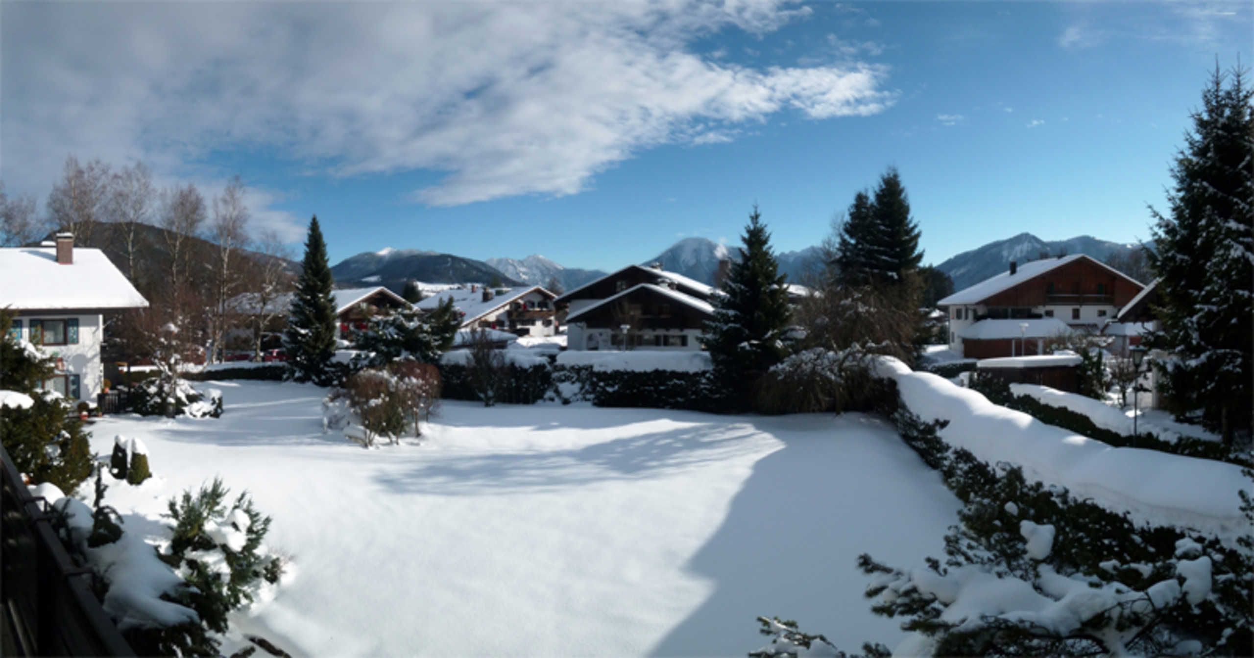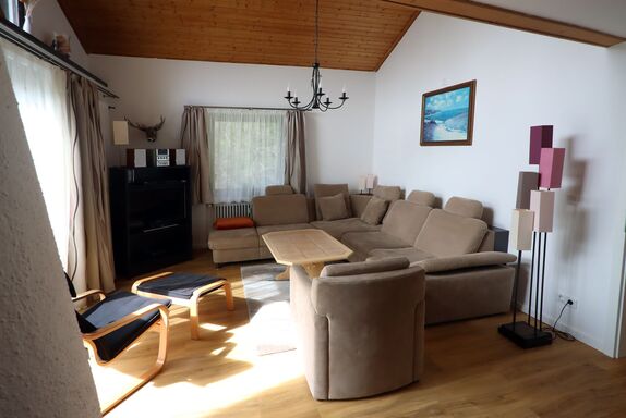 Der Wohnbereich ist mit einer bequemen Couch, Sessel und einer gemütlichen Essecke möbliert. Die grosse Fensterfront bietet Ihnen einen herrlichen Blick auf die Tegernseer Berge, wie den Wallberg, Setzberg, Blankenstein und Risserkogel. Ein Kaminofen sorgt für Behaglichkeit.