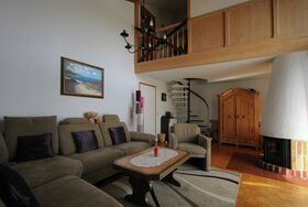 3 Zimmer Maisonettewohnung mit grossem Wohnbereich, Eltern-Schlafzimmer mit Doppelbett, Kinder-Zimmer mit 2 Stockbetten, Badezimmer mit Dusche und Toilette, zweite Toilette mit Waschbecken neben dem Kinderzimmer auf der Empore.