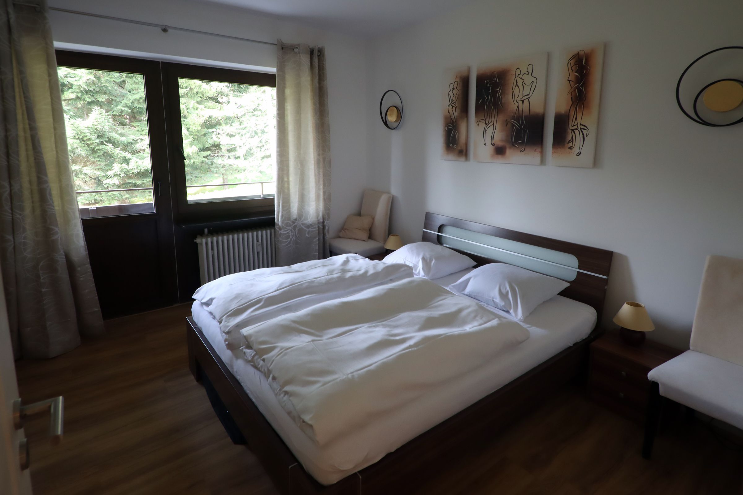 Ein Balkon ist nach Süden gerichtet und möbliert mit Stühlen und Tisch. Der zweite Balkon ist nach Westen gerichtet. Sie können die Sonne bis zum späten Nachmittag genießen.