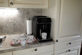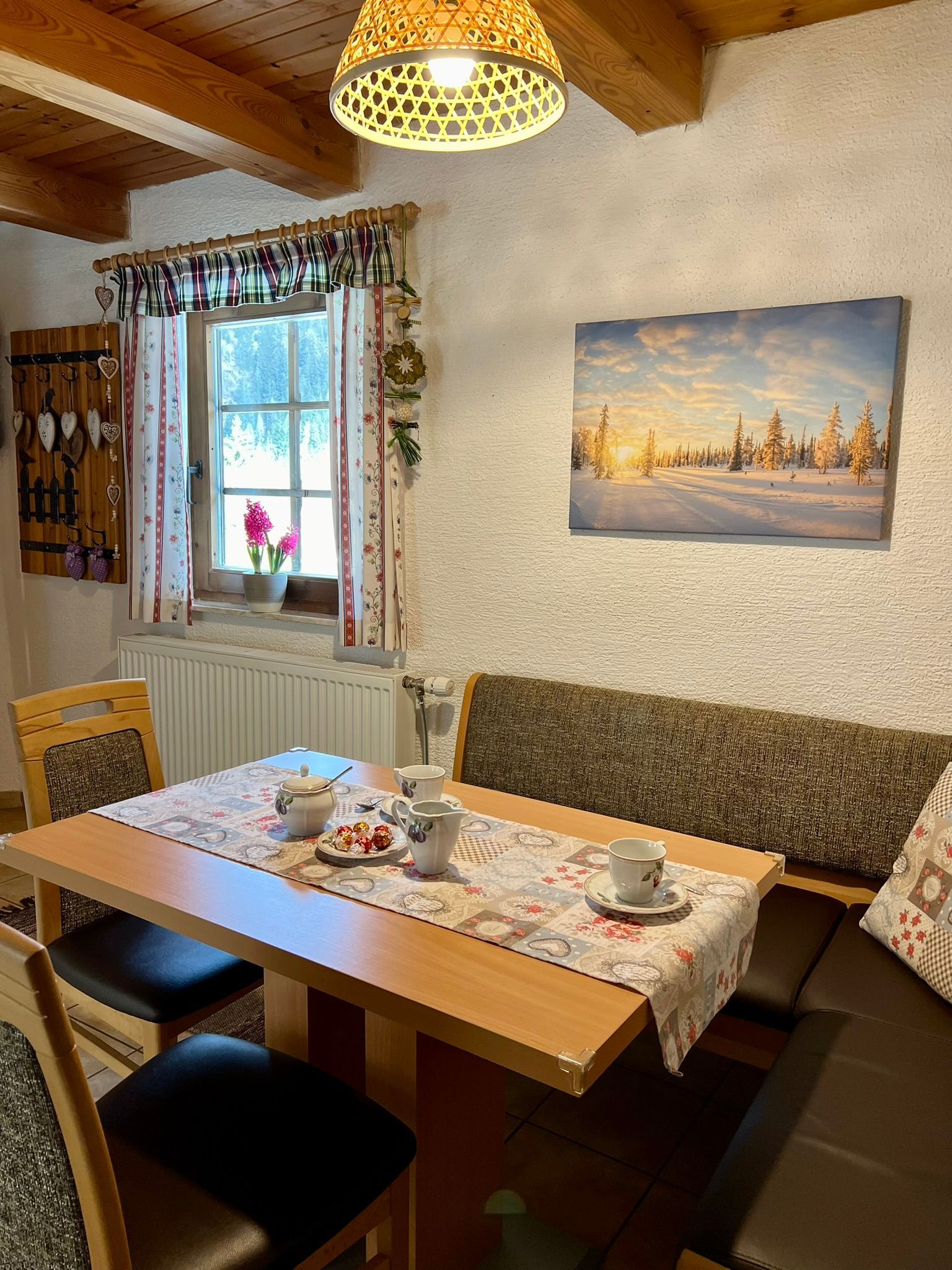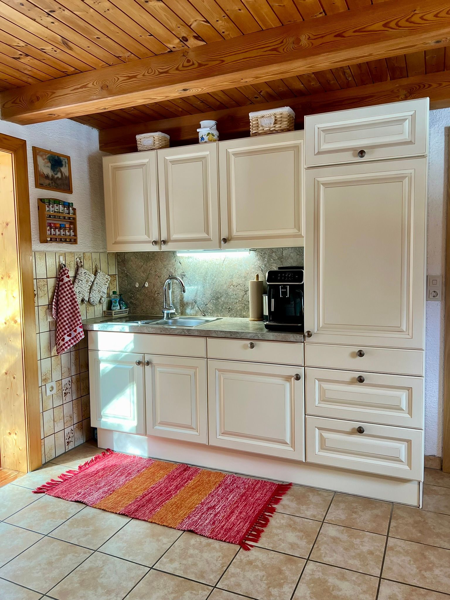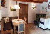 Wohnküche mit voll ausgestatteter Küchenzeile, E-Herd, Mikrowellenherd, Geschirrspüler, Kachelofen und Sitzecke. Genug Geschirr für 6 Personen.