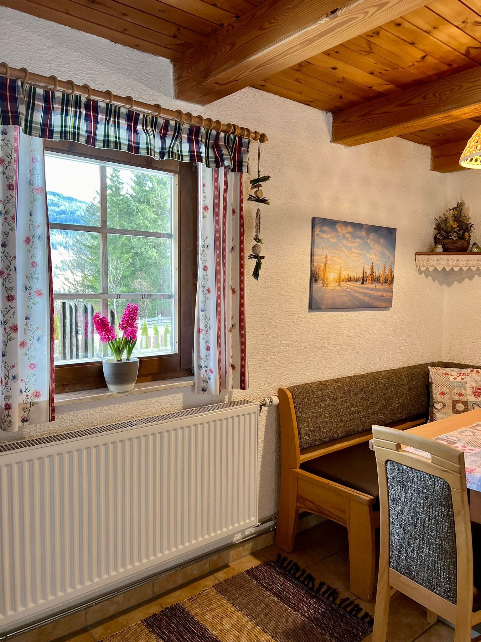 Die rustikale Hütte hat schöne Räume in Erd- und Untergeschoß, eine möblierte Terrasse, Holzkohlegrill, gratis Garage, Kachelofen, gemütlichen Wohn-Essbereich mit schönen Holzmöbeln sowie einem duftendem Zirbenbett und einem Himmelbett, Samsung Sat-TV in jedem Schlafzimmer, Bodenheizung und Zentralheizung sowie eine große barrierefreie Dusche und WLAN im gesamten Gebäude bieten allen Komfort.