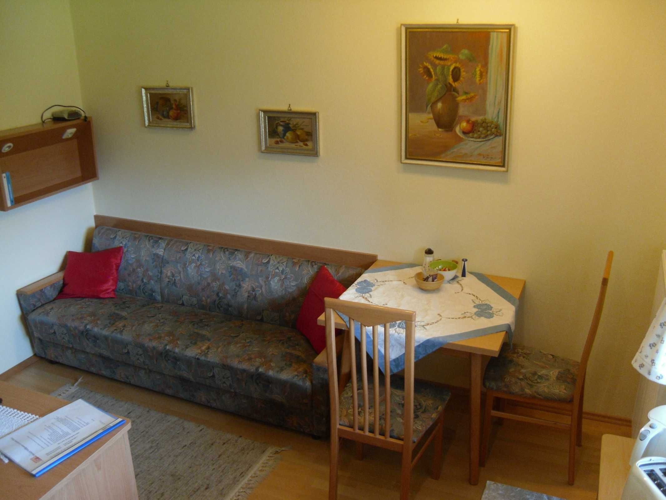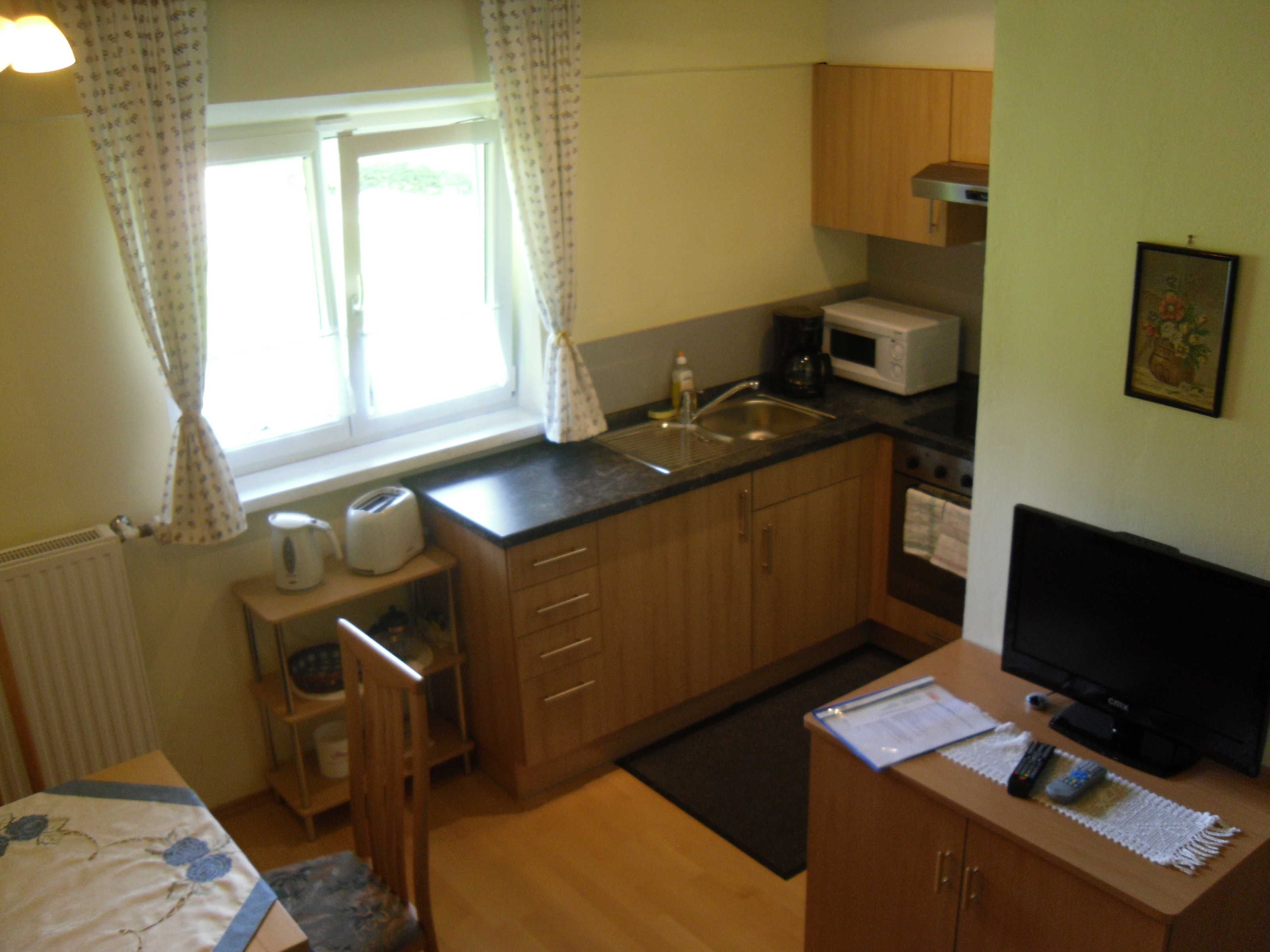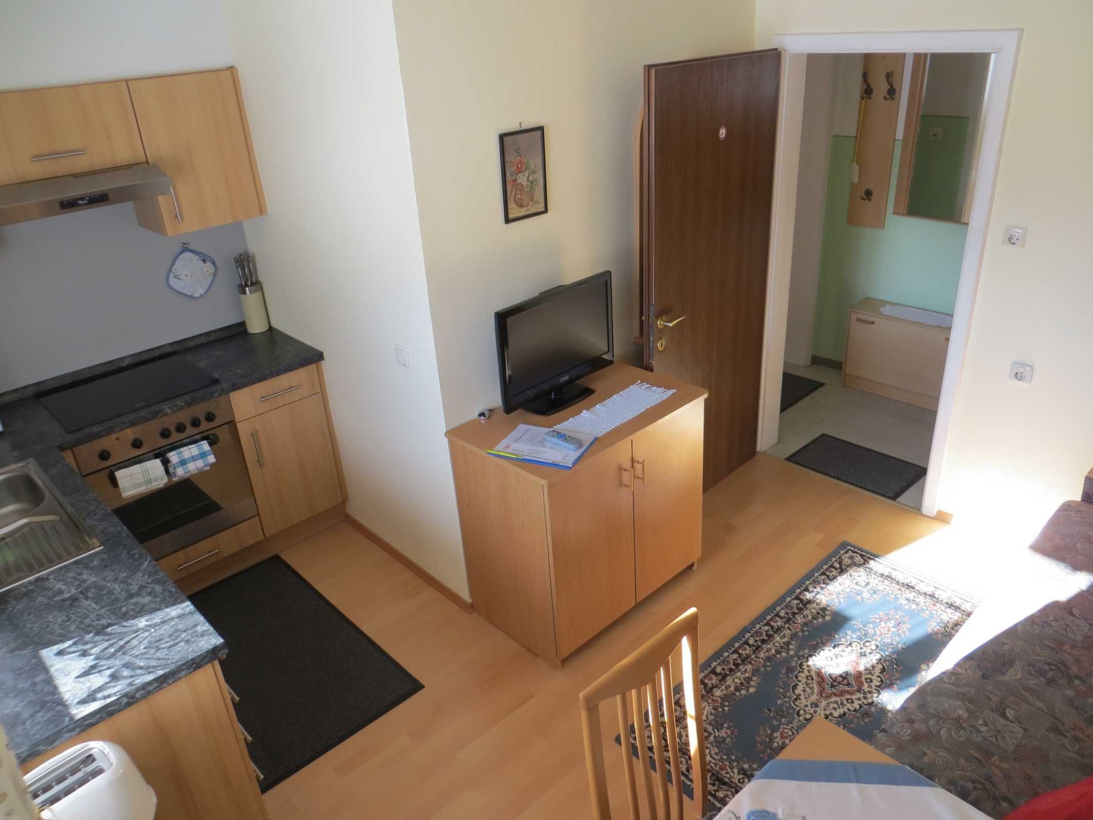 Die 34m² große Ferienwohnung läßt mit einer komplett eingerichteten Eckküche (Kaffeemaschiene, Toaster, Wasserkocher, Microwellenherd uvm.), Essplatz, Couch, Sat TV, Dusche/WC, Zimmersafe und einen südseitigen Balkon mit schöner Aussicht keine Wünsche offen.