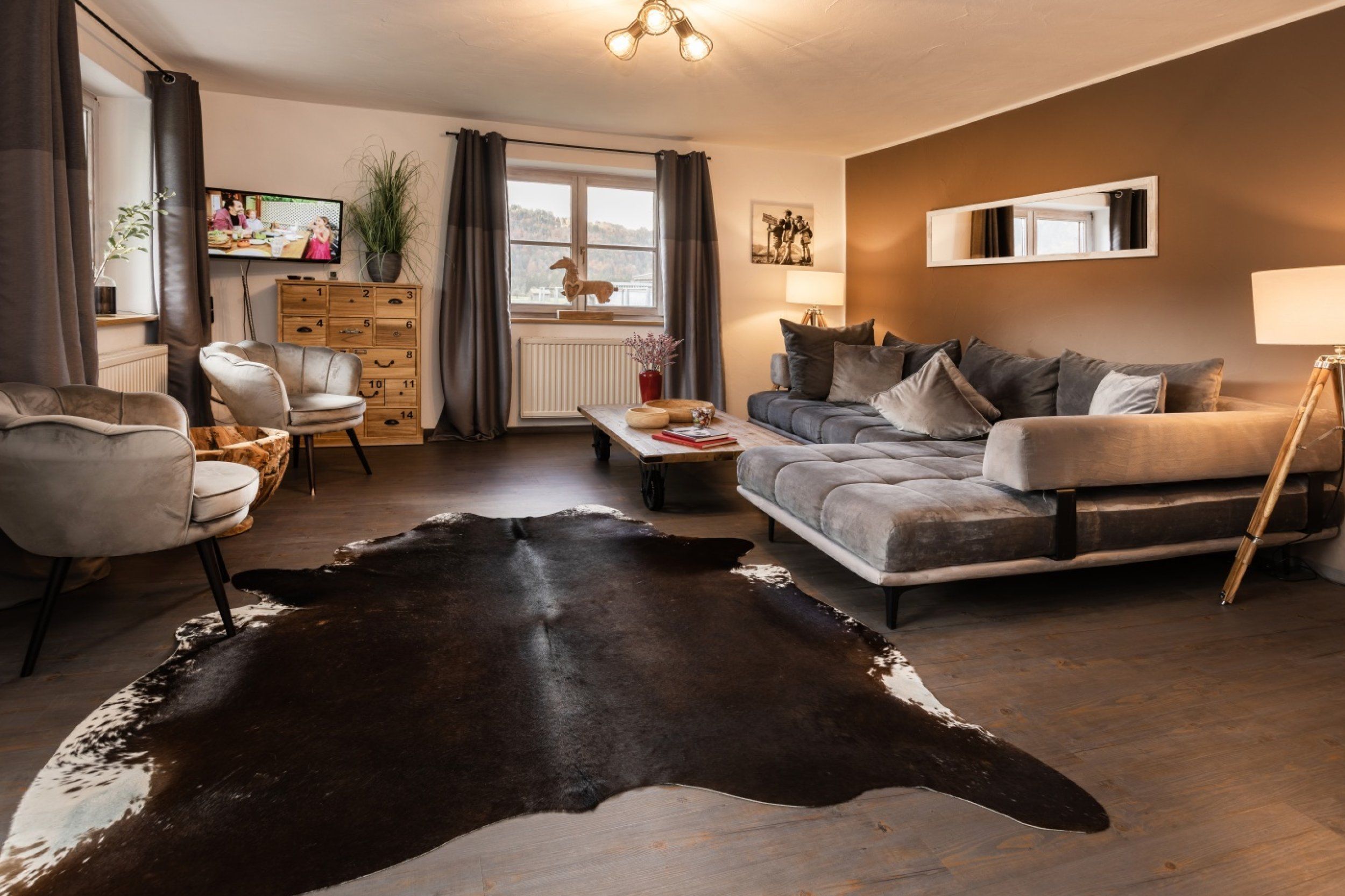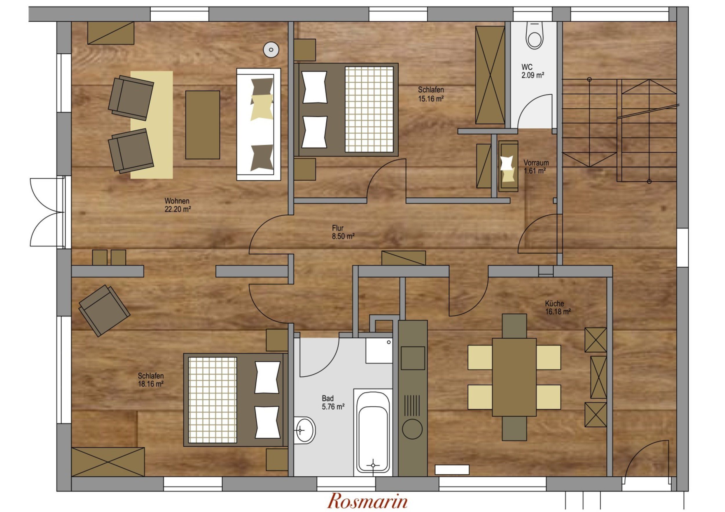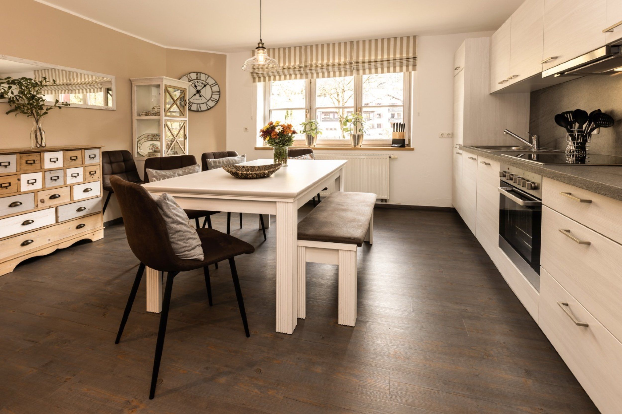 Die helle 5-Sterne-Ferienwohnung Rosmarin liegt im Erdgeschoss und hat eine sonnige Süd-Terrasse mit Blick über Wiesen bis in die Berge. Zwei Schlafzimmer und eine große Küche mit Esstisch im Landhausstil laden zum Entspannen ein.