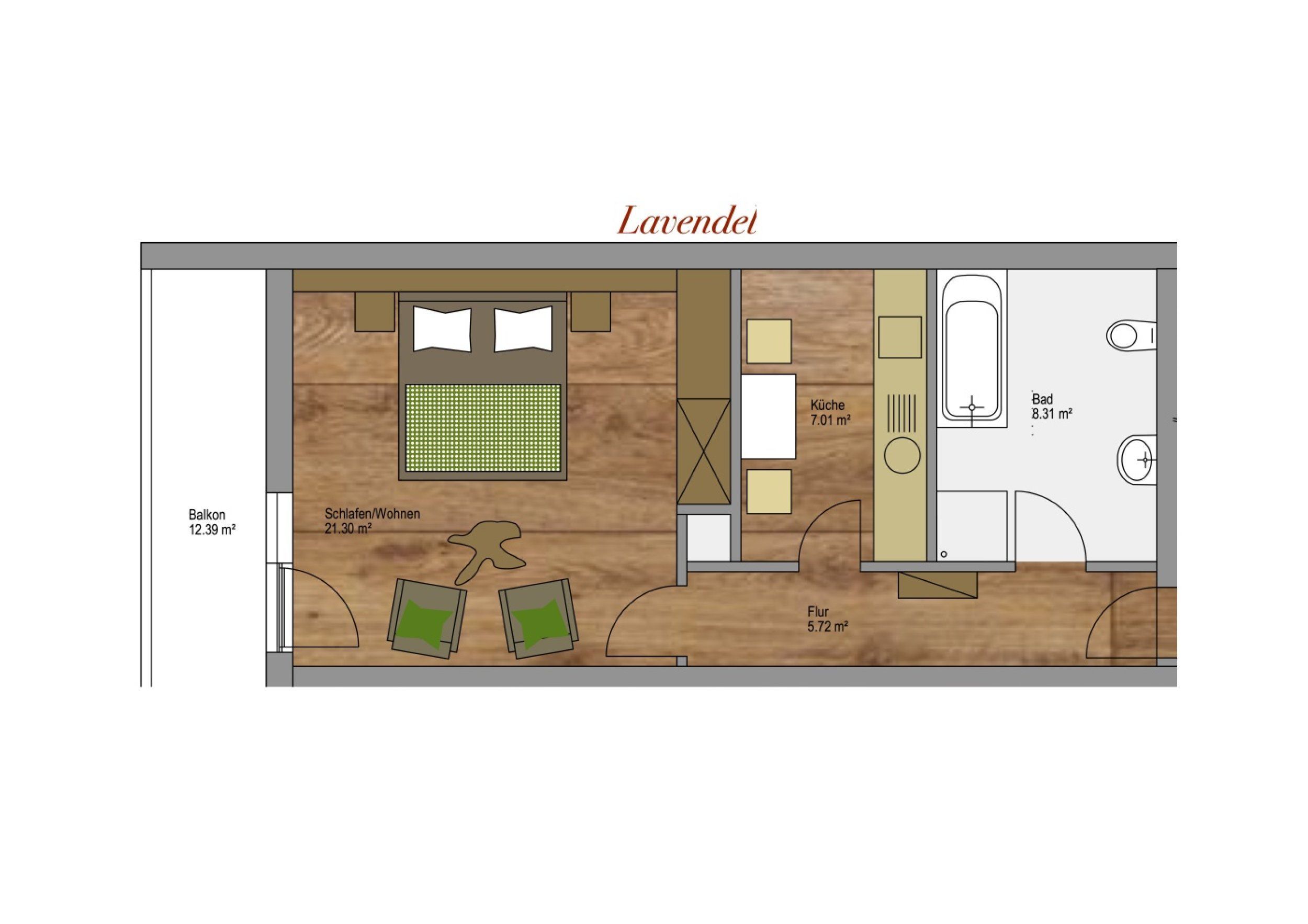 Die Dachgeschosswohnung Lavendel ist wie geschaffen zum Wohlfühlen. Hier finden Sie Gemütlichkeit und Heimeligkeit auf 42 m². Klein aber fein.Ruhe und Geborgenheit. Mit kombiniertem Wohn-/ Schlafbereich und separater Küche.