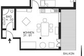 2 Zimmer Ferienwohnung mit 49 m² für 1 bis 4 Personen, 2 Räume mit 1 Schlafzimmern, 1. Obergeschoß, Balkon