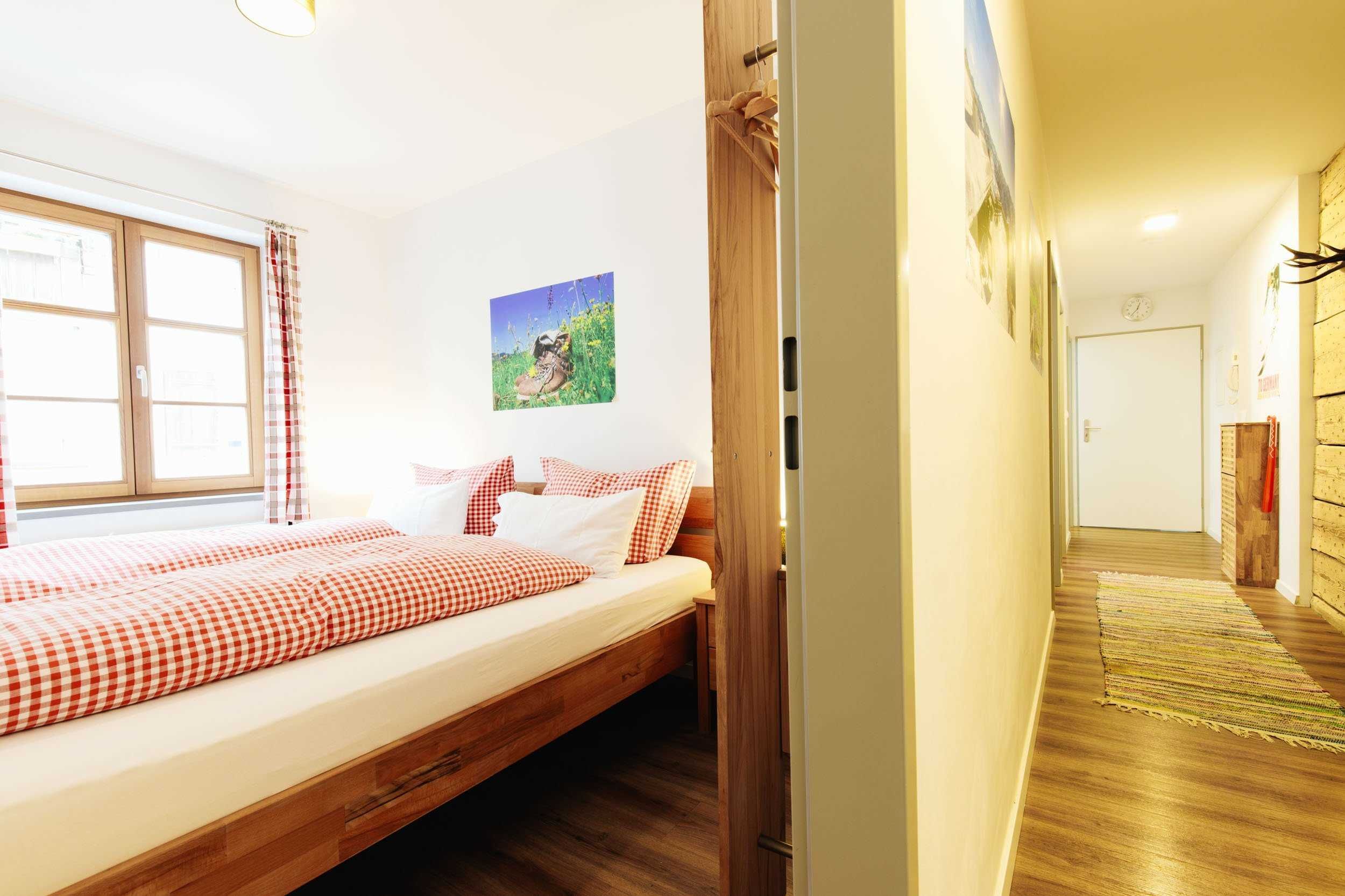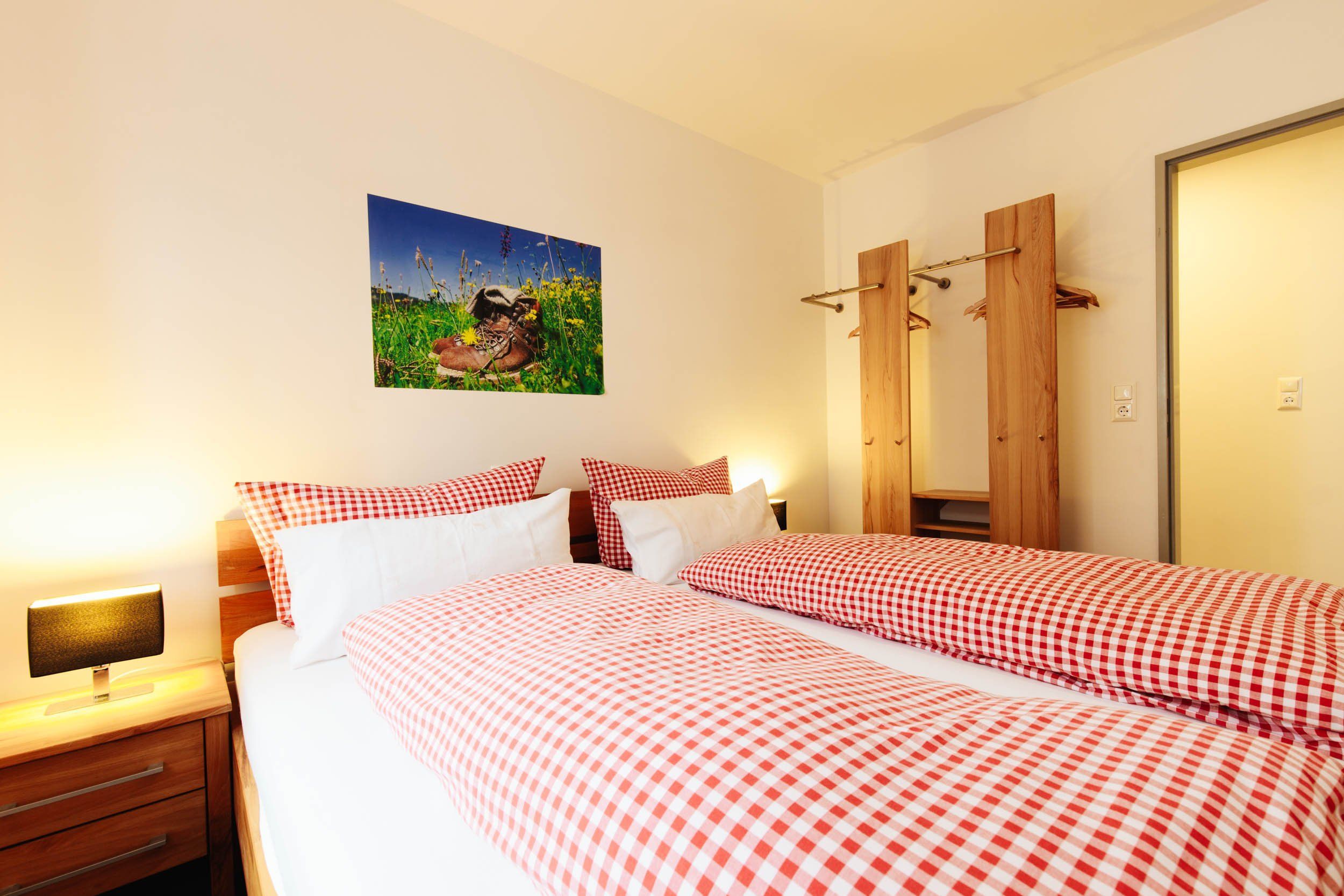 3 Zimmer, Küche, Bad Ferienwohnung mit 62 m² für 1 bis 4 Personen, großes Wohnzimmer, zwei Schlafzimmer mit Doppelbetten, separate Küche, 1. Obergeschoß, Westbalkon, Kinderzustellbett und Hochstuhl auf anfrage möglich