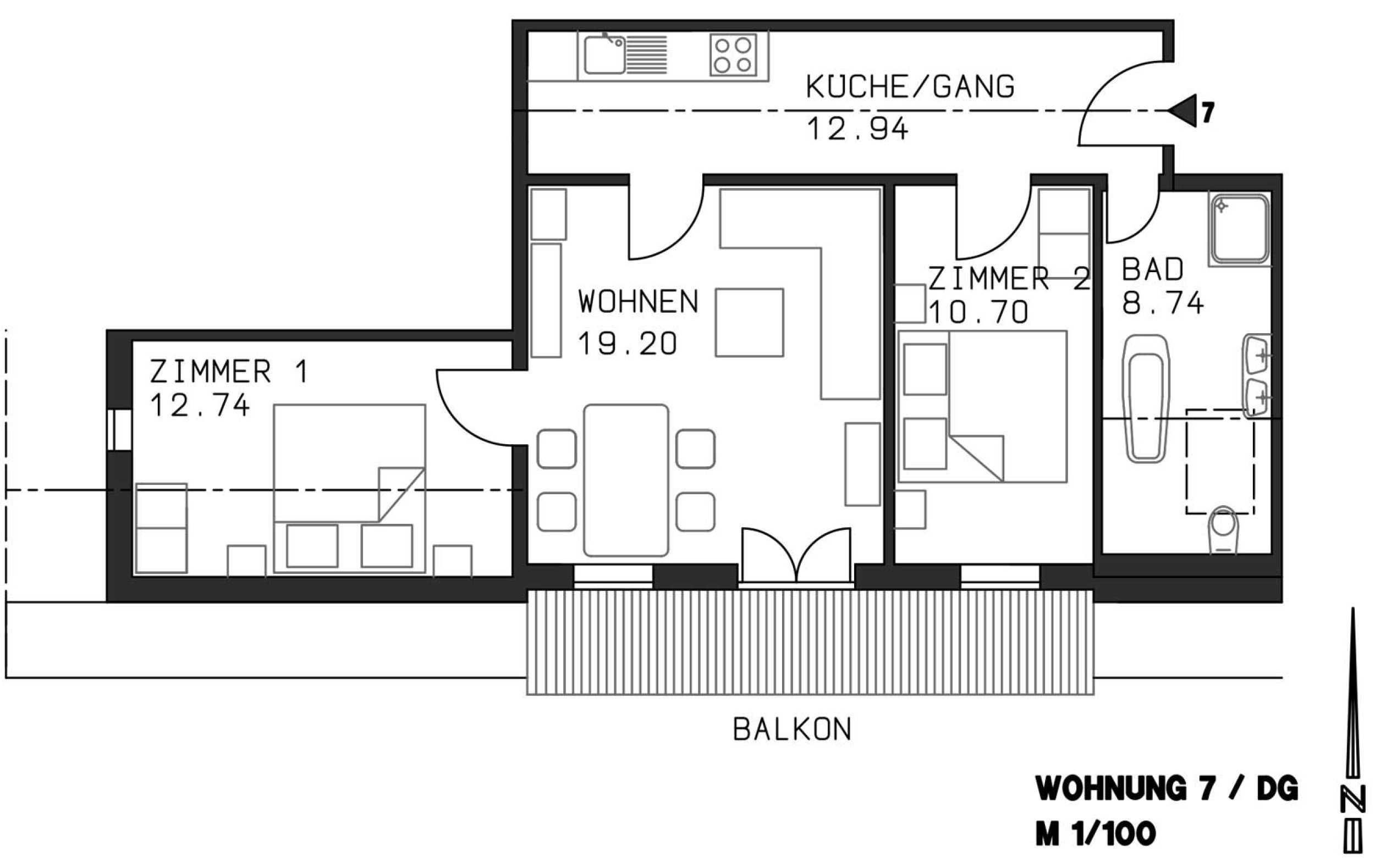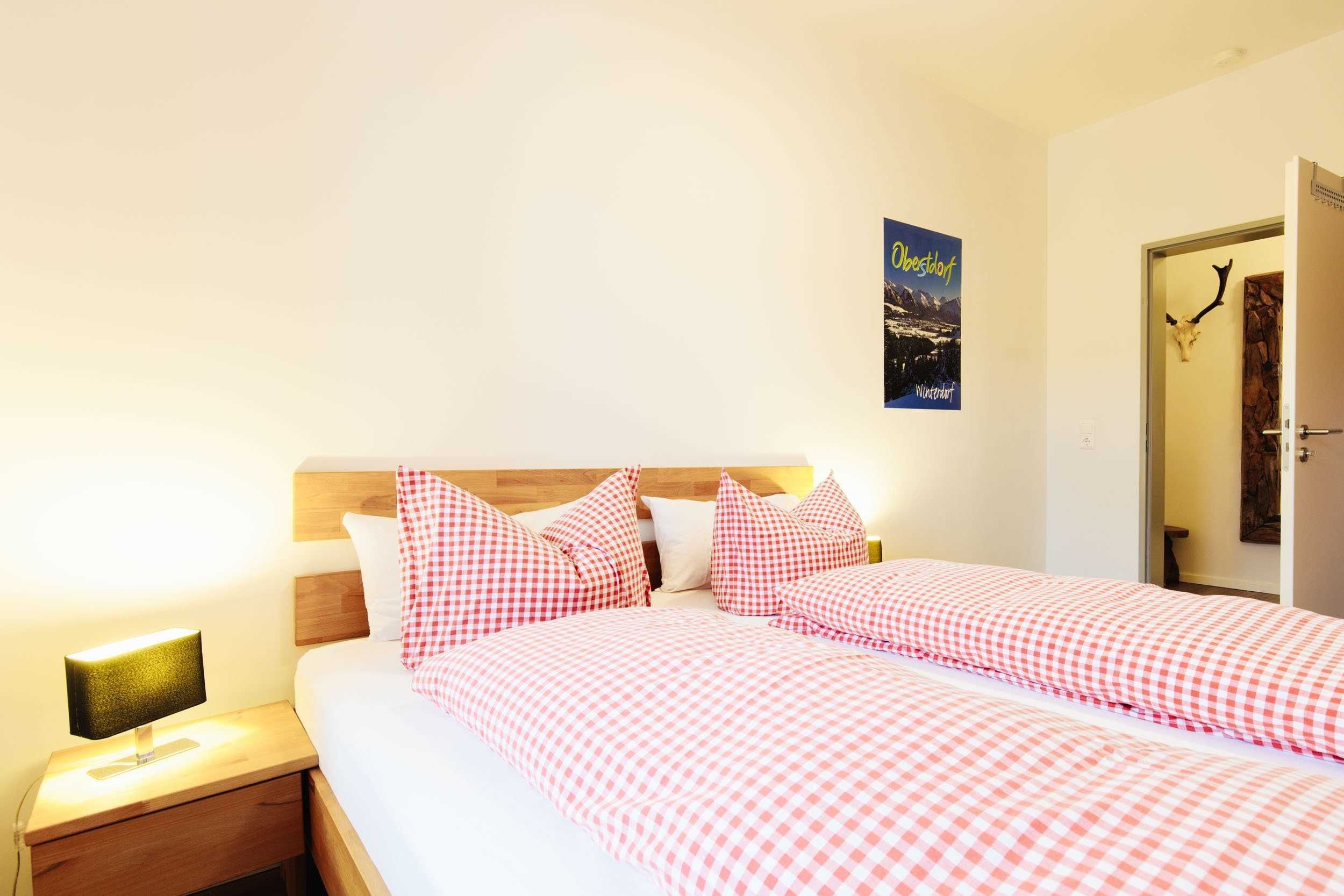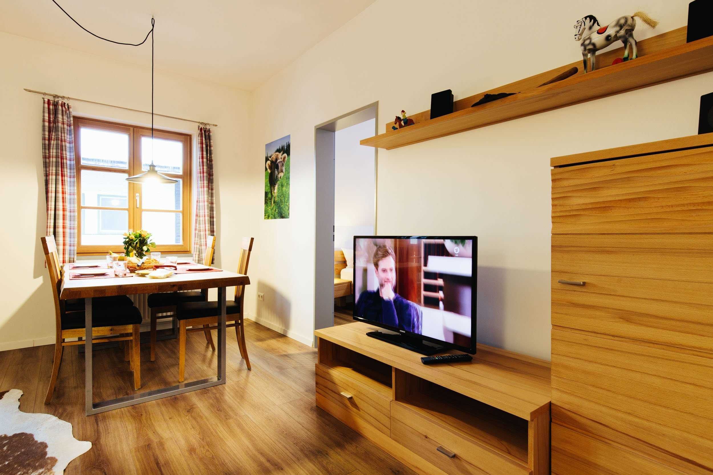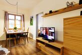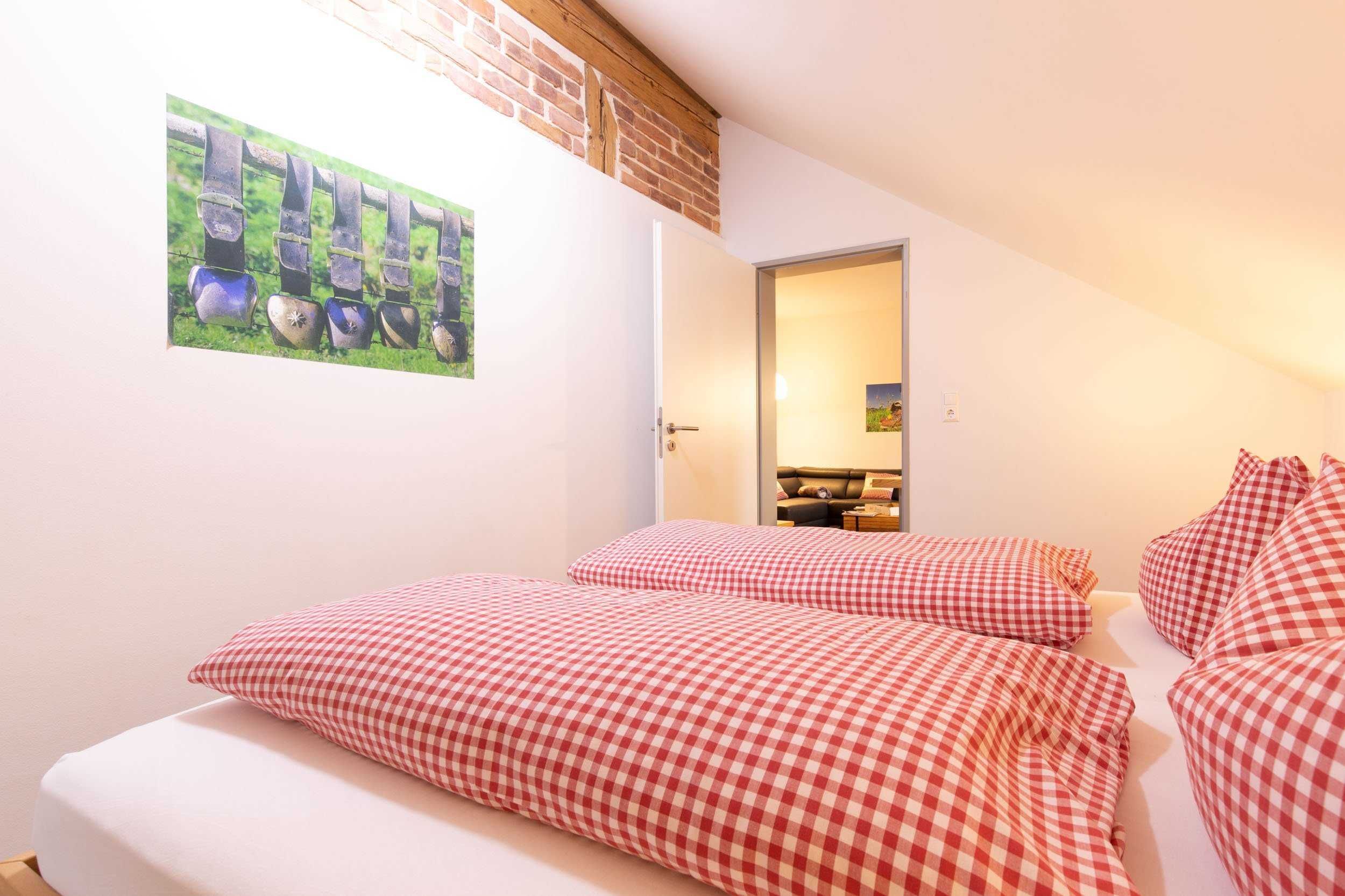 3 Zimmer Ferienwohnung mit 64 m² für 1 bis 4 Personen, 3 Räume mit 2 Schlafzimmern, Wohnzimmer, Küchenzeile in der geräumigen Diele, 2. Obergeschoß/Dachgeschoß, Südbalkon, Bergblick, Kinderzustellbett/-hochstuhl auf Anfrage möglich