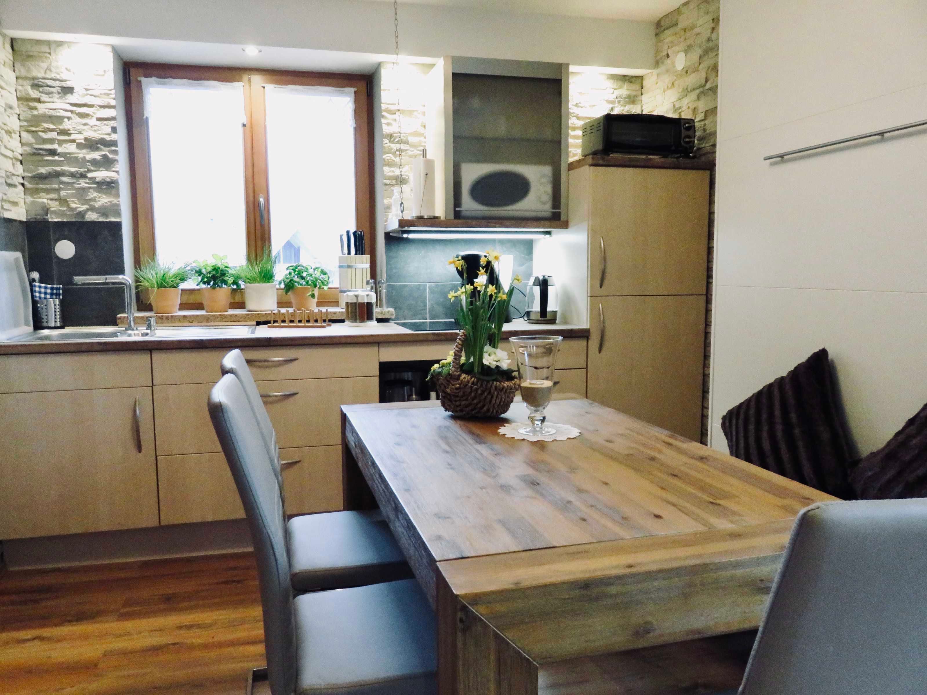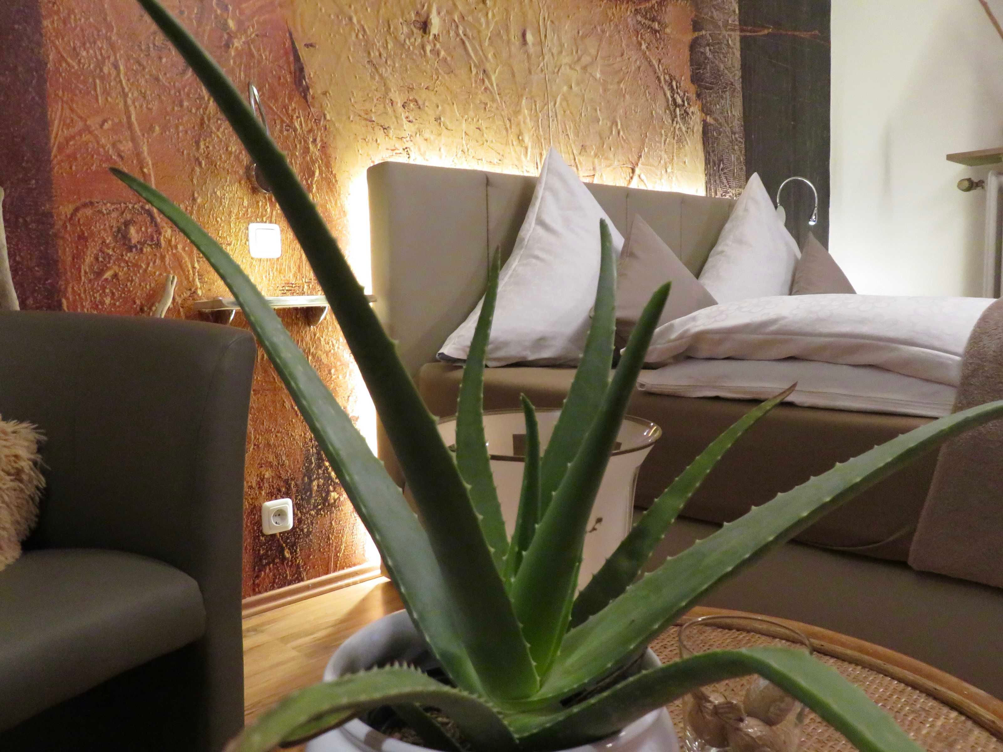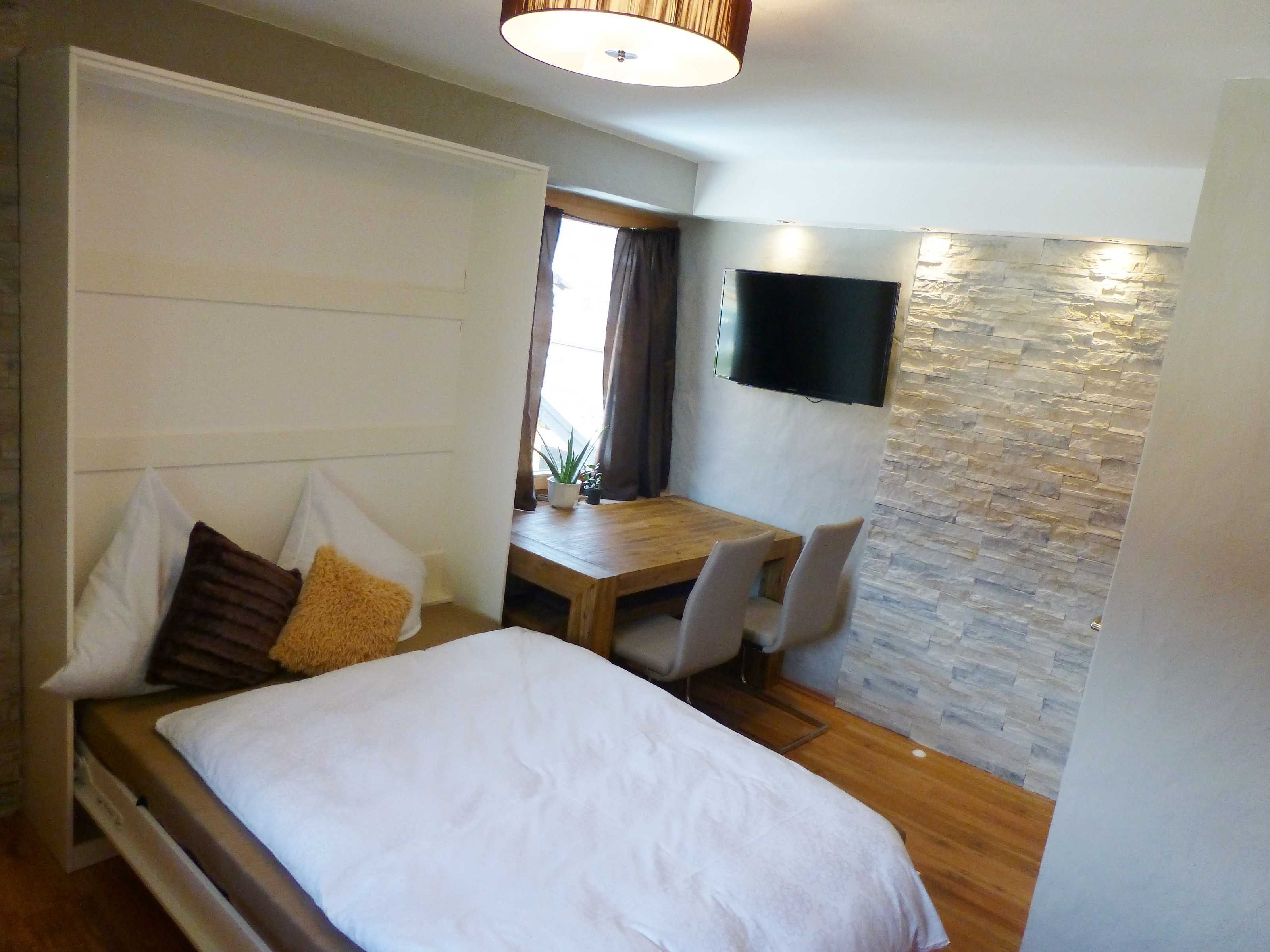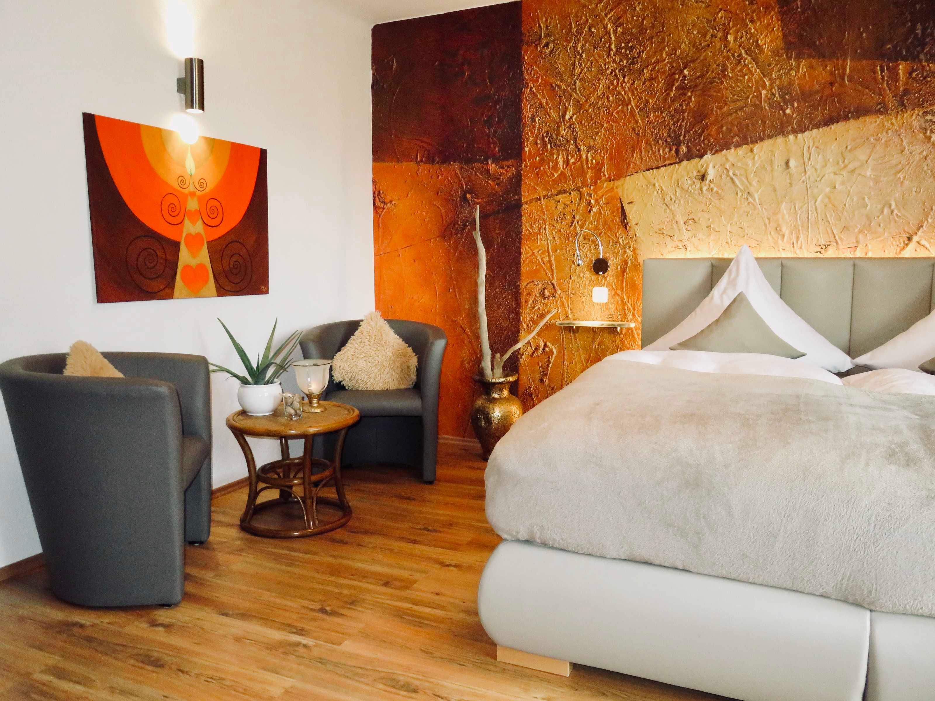 Unsere Ferienwohnung „Feelings“ verfügt über zwei helle separate Räume, Flur und WC. Sie ist grundsätzlich ausgelegt für 1-2 Gäste, kann jedoch nach Absprache auch noch zwei weitere kleinere Gäste beherbergen. Ein großes Schlafzimmer mit einem Boxspring- Doppelbett, eingebauter Dusche und Waschtisch. Zwei Lounge-Sessel mit kleinem Beistelltisch wurden zu einer kleinen Sitzgruppe arrangiert und laden zum Ausruhen ein. Vom Schlafzimmer treten sie auch hinaus auf den überdachten Balkon mit traumhafter Aussicht. In der gemütlichen Wohnküche finden sie die Küchenzeile, eine Sitzgruppe und einen großen Flat-TV. Ein großzügiges Schrankbett mit 140 cm Breite bietet u.U. zusätzlich Platz für 1 bis 2 weitere Personen. Dazu gibt es auch in diesem Raum eine eingebaute Dusche mit Waschtisch und ausreichend Stauraum für die Kleidung.