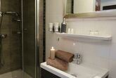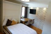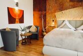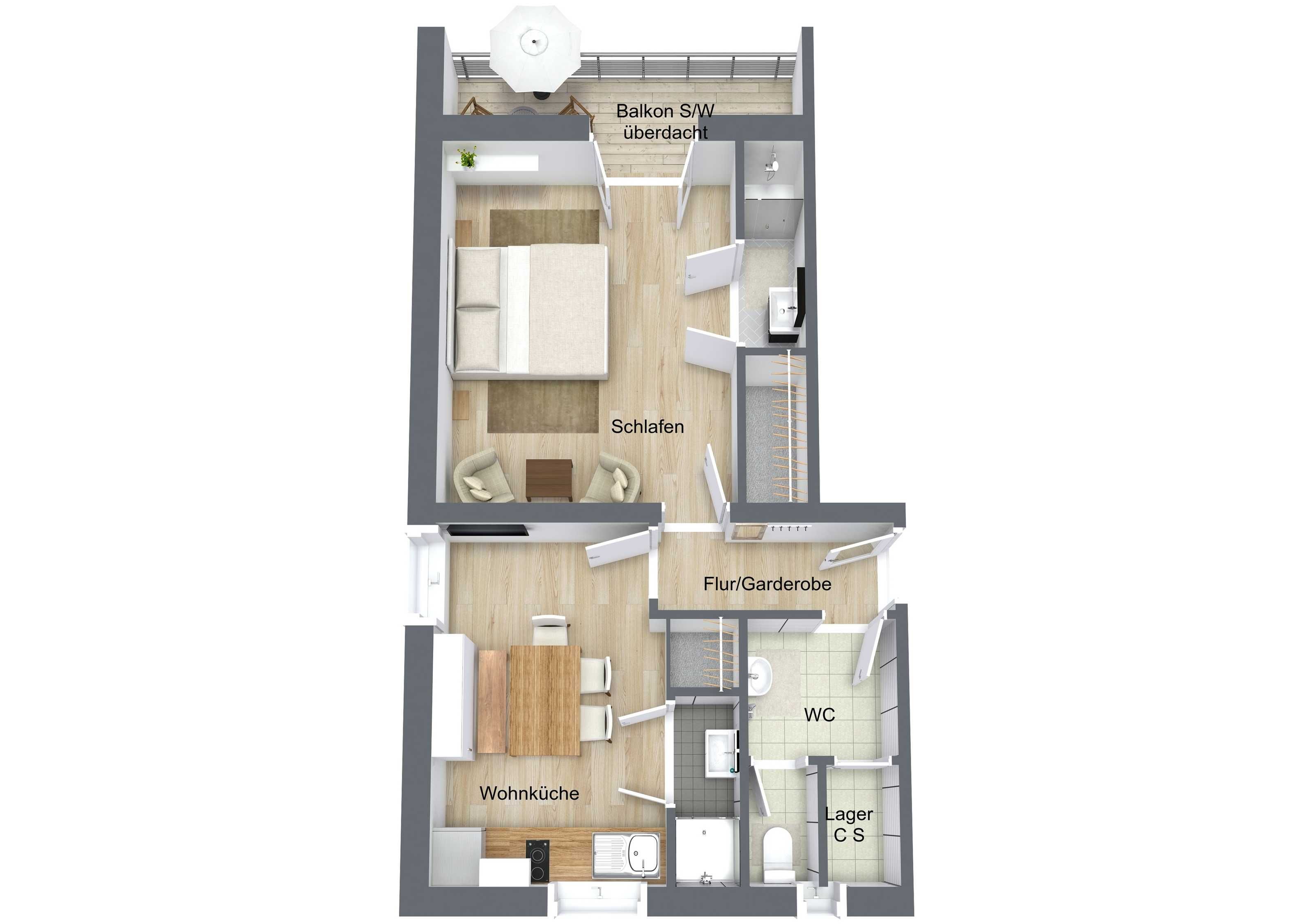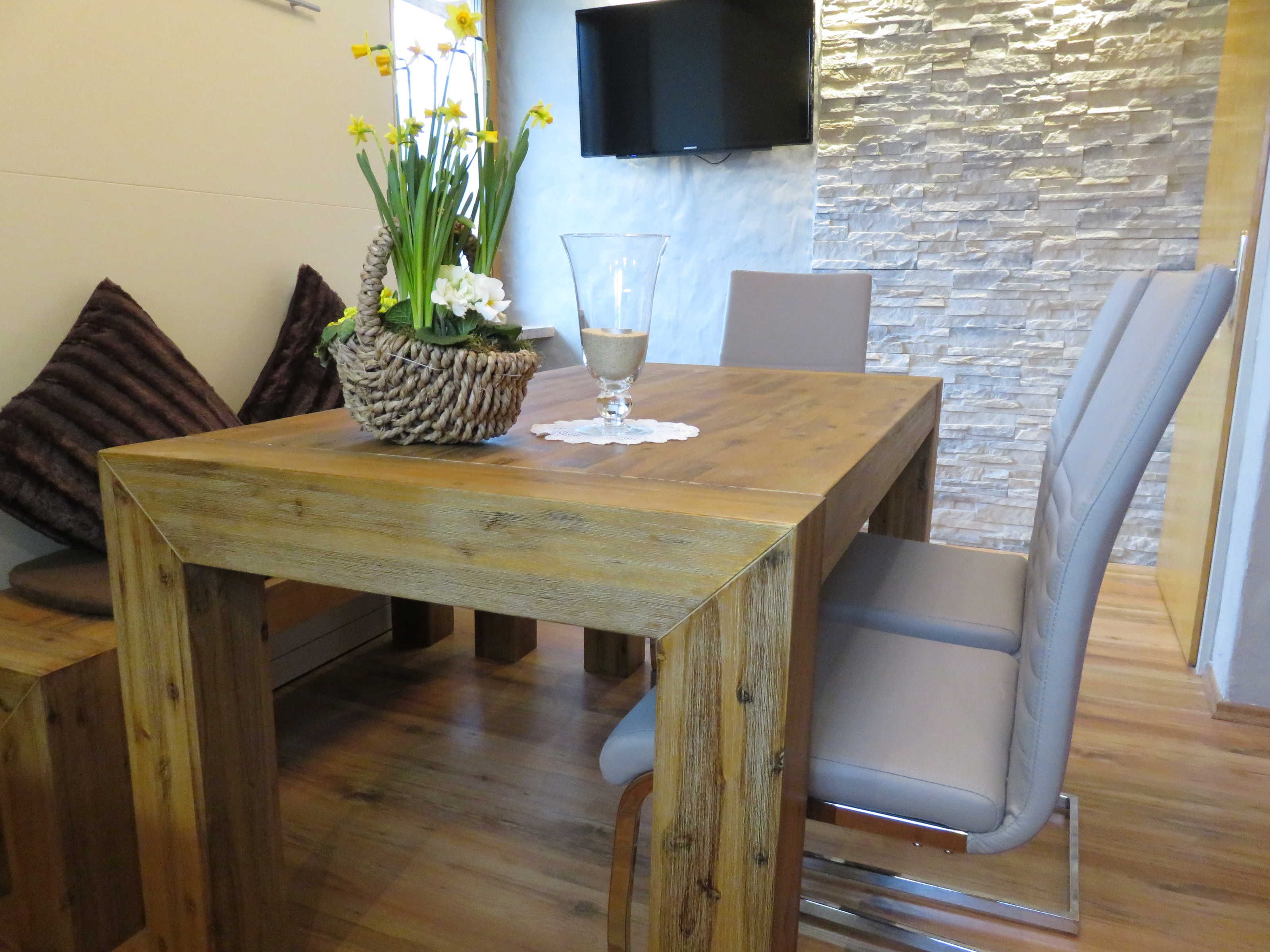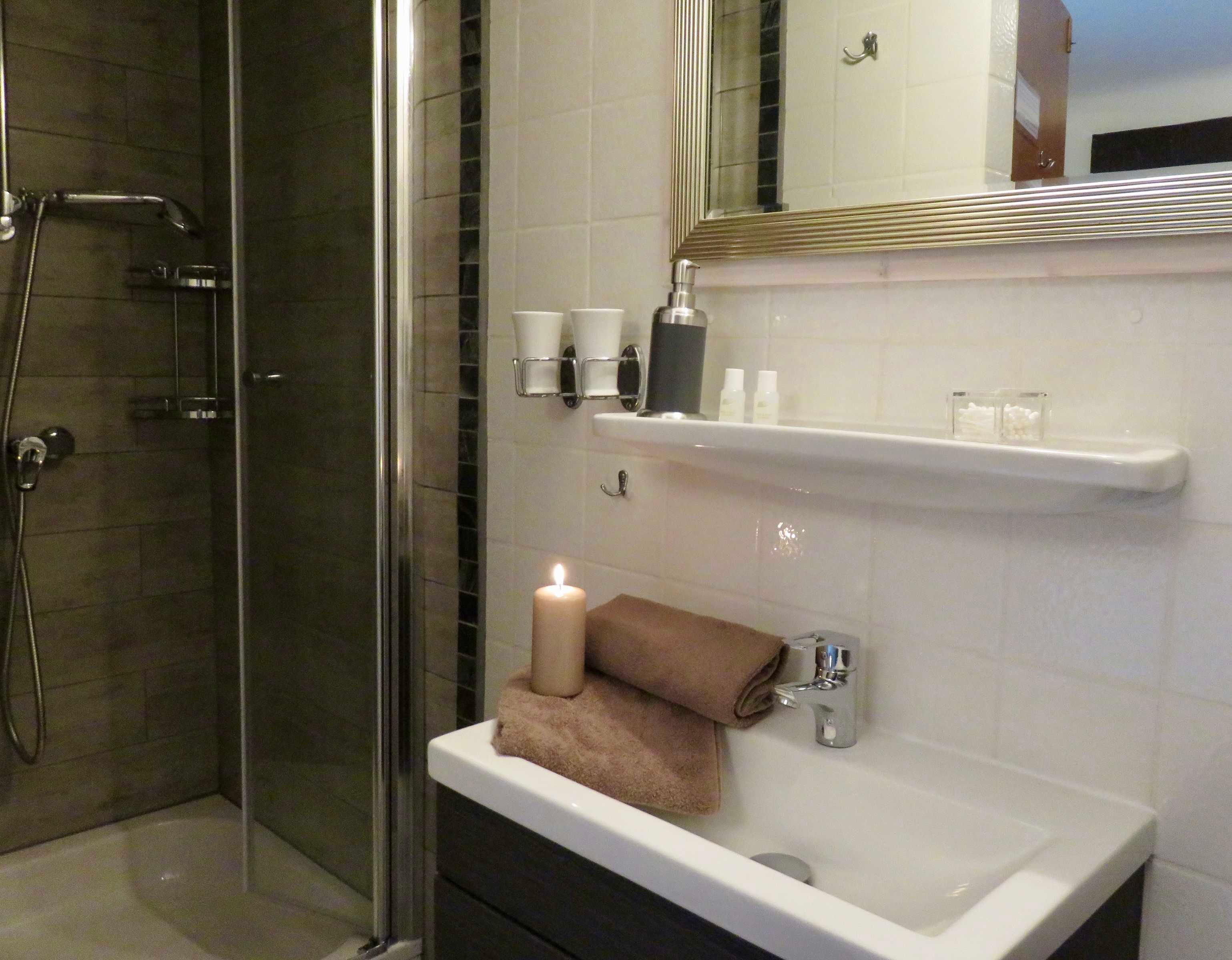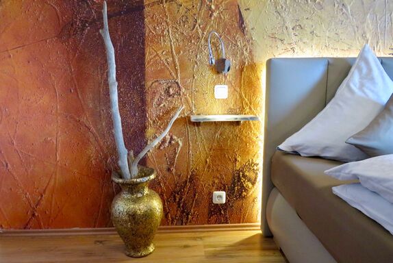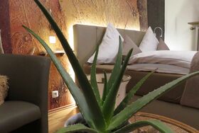 Unsere Ferienwohnung „Feelings“ verfügt über zwei helle separate Räume, Flur und WC. Sie ist grundsätzlich ausgelegt für 1-2 Gäste, kann jedoch nach Absprache auch noch zwei weitere kleinere Gäste beherbergen. Ein großes Schlafzimmer mit einem Boxspring- Doppelbett, eingebauter Dusche und Waschtisch. Zwei Lounge-Sessel mit kleinem Beistelltisch wurden zu einer kleinen Sitzgruppe arrangiert und laden zum Ausruhen ein. Vom Schlafzimmer treten sie auch hinaus auf den überdachten Balkon mit traumhafter Aussicht. In der gemütlichen Wohnküche finden sie die Küchenzeile, eine Sitzgruppe und einen großen Flat-TV. Ein großzügiges Schrankbett mit 140 cm Breite bietet u.U. zusätzlich Platz für 1 bis 2 weitere Personen. Dazu gibt es auch in diesem Raum eine eingebaute Dusche mit Waschtisch und ausreichend Stauraum für die Kleidung.