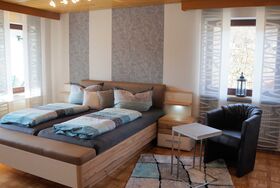 Die Wohnung liegt direkt am Rad- und Wanderweg und der Einstieg zu den drei Mountainbike-Strecken befindet sich in der Nähe (ca.1km). Ein Kinderspiel- und Fußballplatz können problemlos zu Fuß erreicht werden. Die 95m² große Ferienwohnung im Erdgeschoss verfügt über zwei Doppel-Schlafzimmer, Wohnzimmer, Essküche, Bad und Balkon. Kinder- oder Zustellbett können auf Wunsch bereitgestellt werden. Parkplätze befinden sich direkt am Haus und Fahrräder können verschlossen eingestellt werden. WLAN selbstverständlich kostenlos. Gerne können Sie auch unseren großen Garten nutzen, zum Entspannen oder für einen Grillabend mit überdachtem Bereich. WIr freuen uns Sie als unsere Gäste begrüßen zu dürfen.