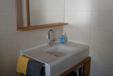 Im Bad befindet sich eine begehbare Dusche, WC und ein Waschtisch. Ein Föhn und Handtücher sind auch vorhanden.