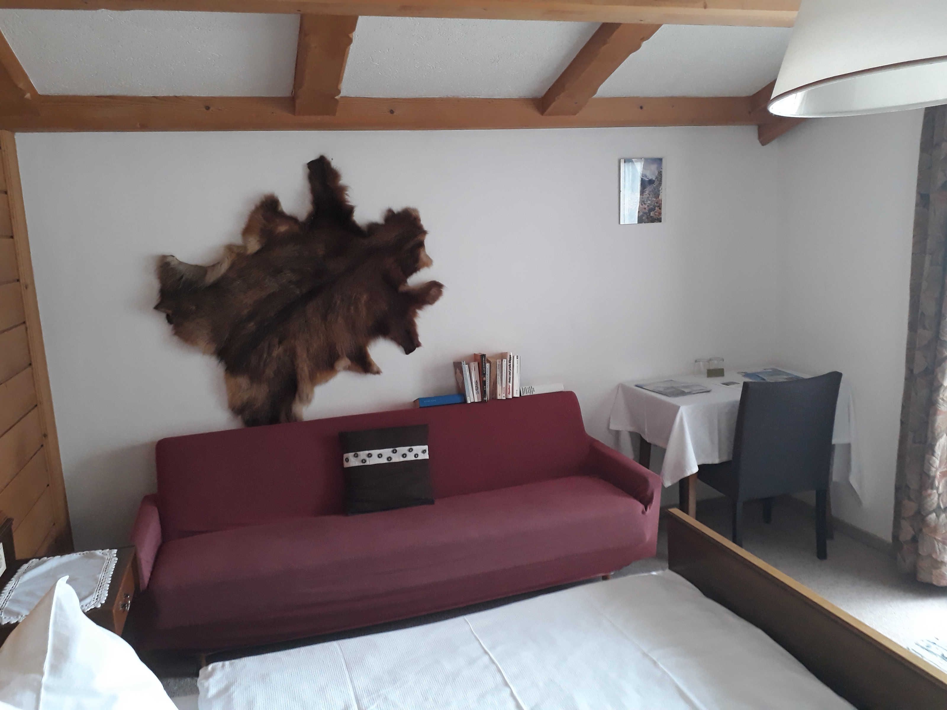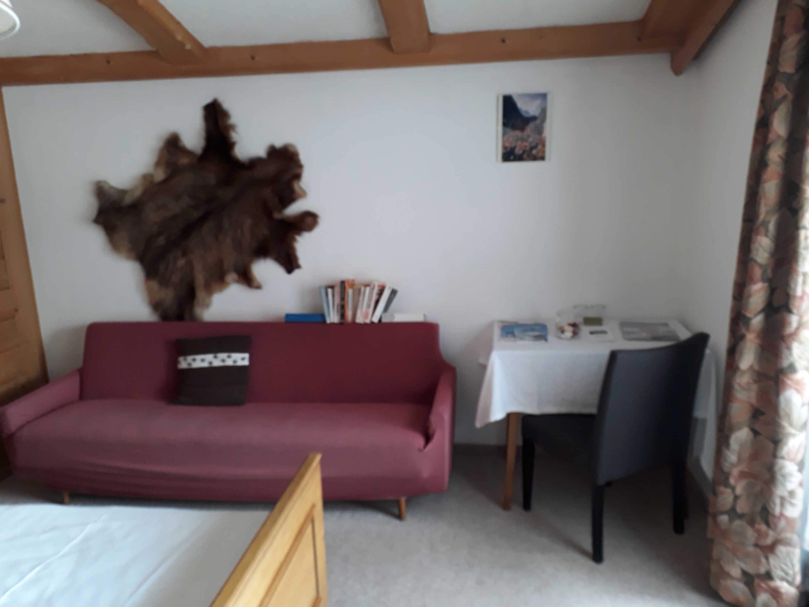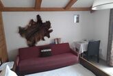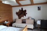 • Eine Couch mit bequemen Polsterstühlen und 1 Tisch sind vorhanden.