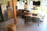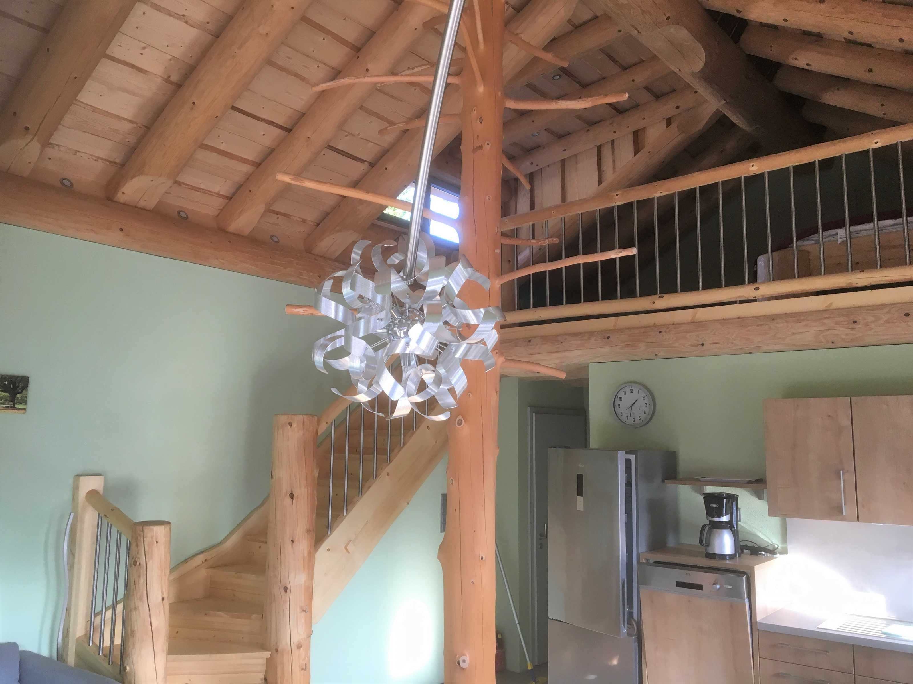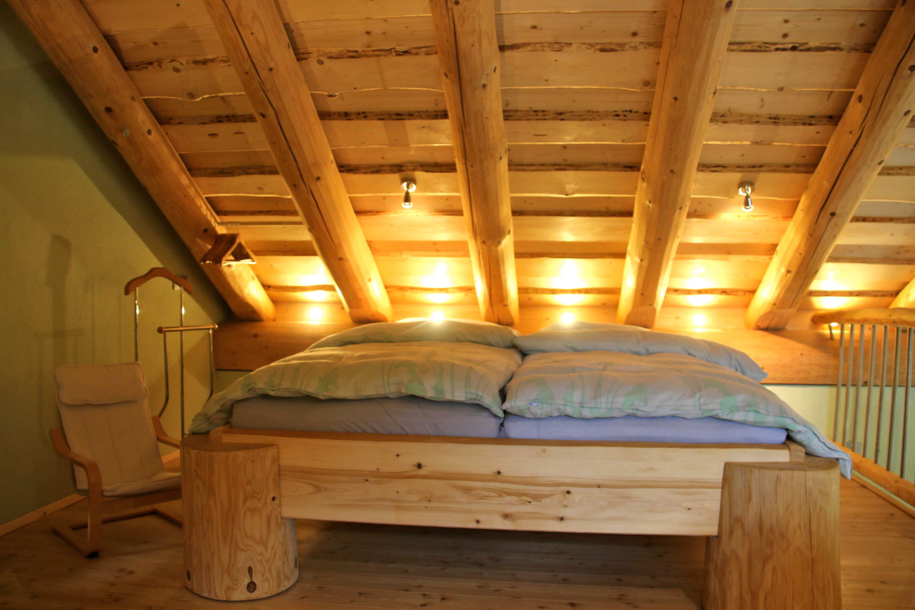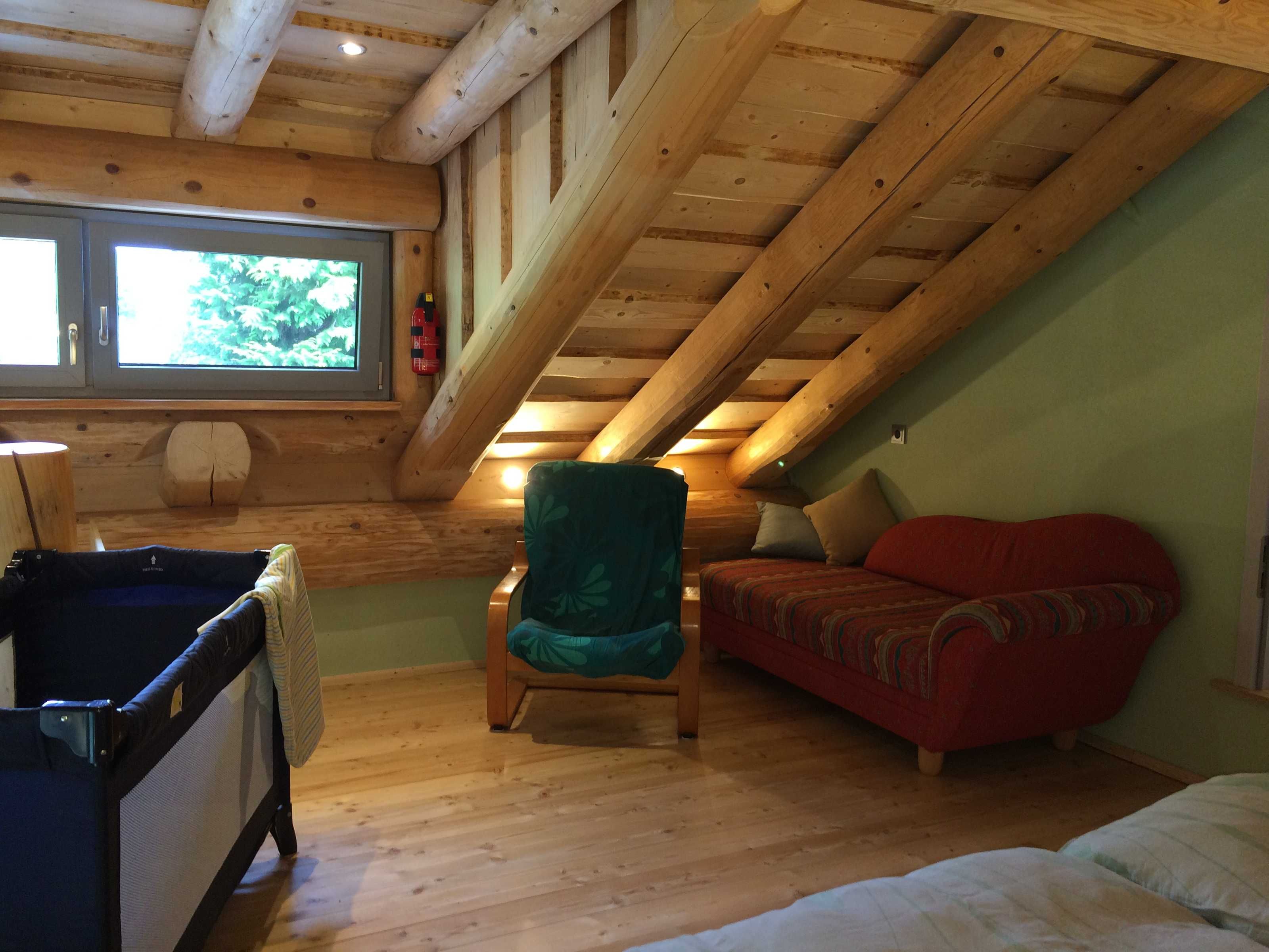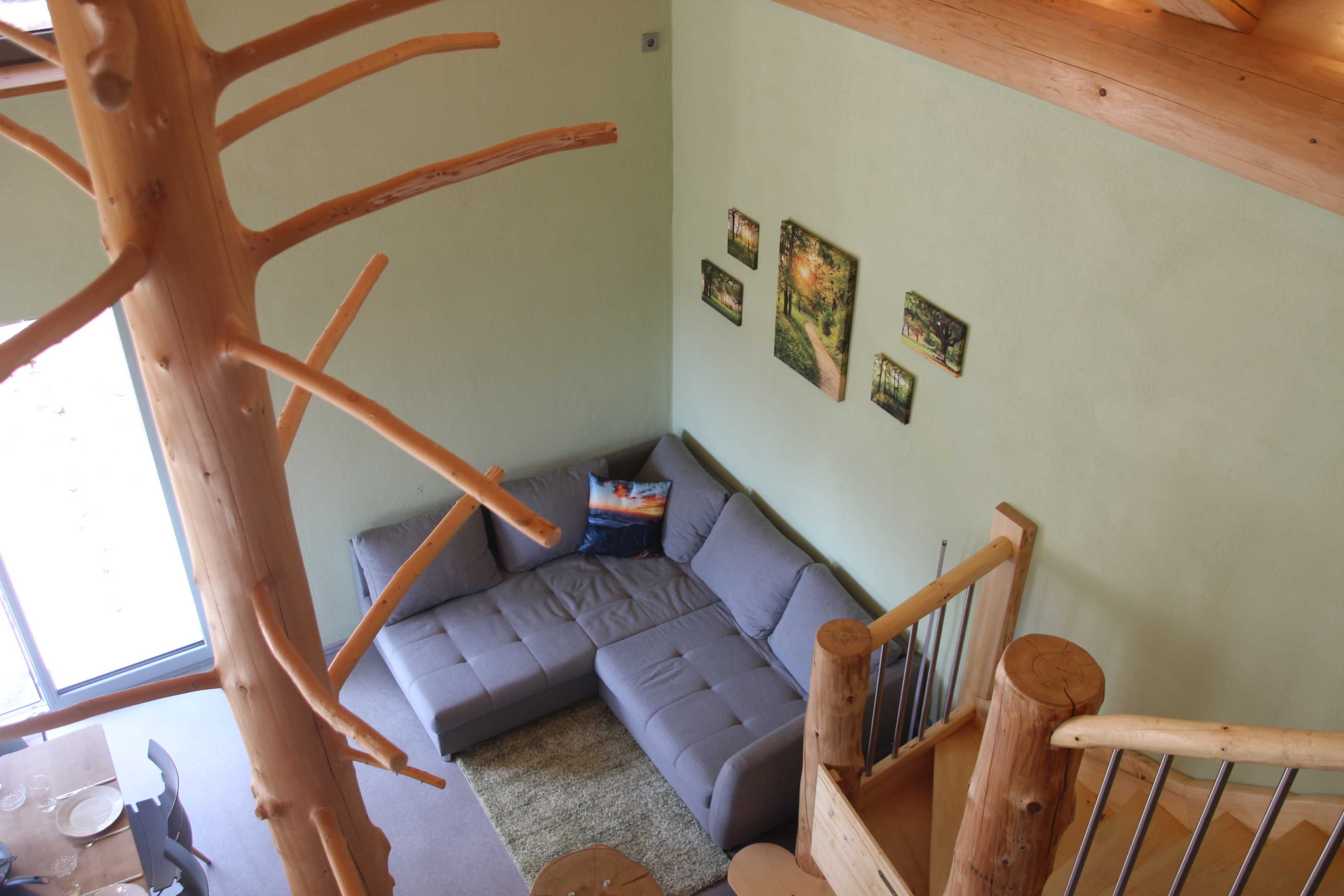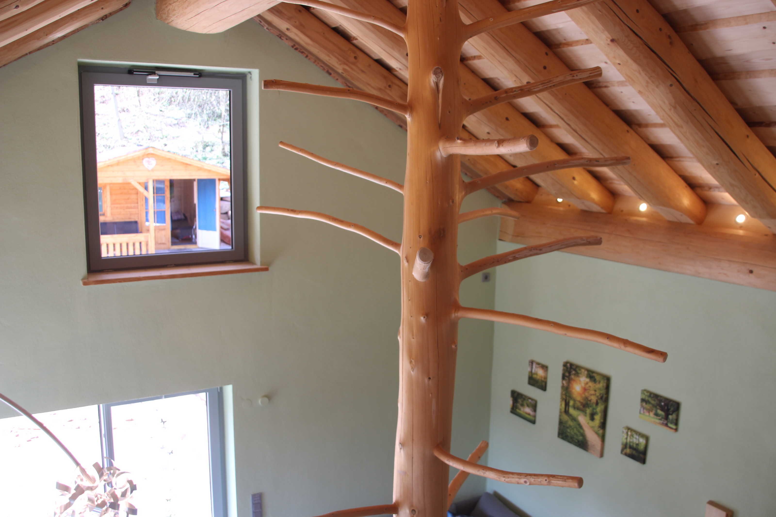 Die urige Außenansicht der großen Tannenstämme und der Lärchenverschalung gibt der Holzhauszeit einen Hüttencharakter. Innen setzt sich dieser mit einem offenen Dachstuhl mit Schwadenbrettern fort. Der zentral in der Mitte des Raumes stehende Stamm mit Ästen vermittelt den Eindruck einer Forsthütte. Die offene Galerie mit Fenster zum Wald ist ein bevorzugter Platz zum Lesen und Entspannen, oder einfach nur Musikhören.