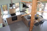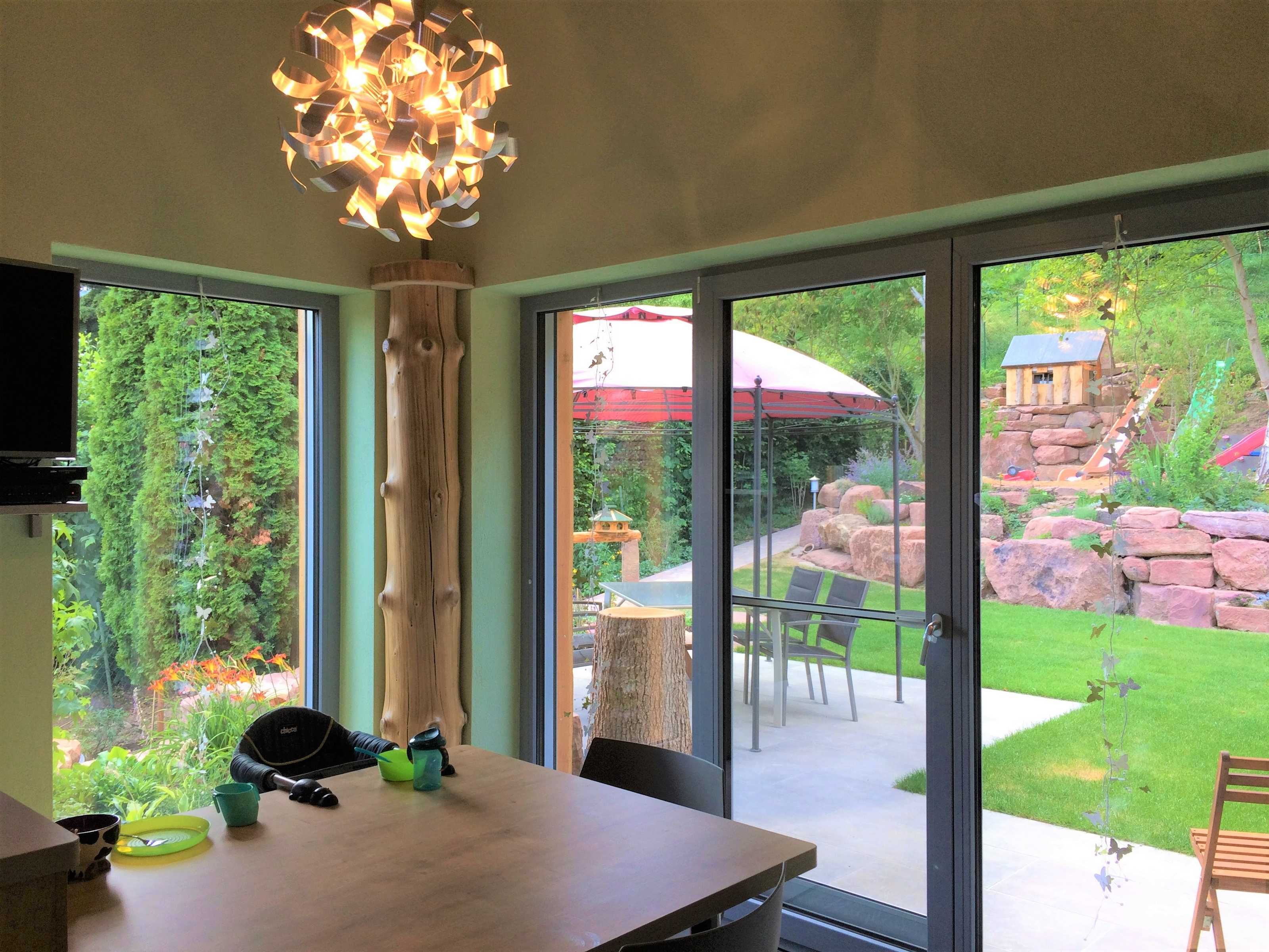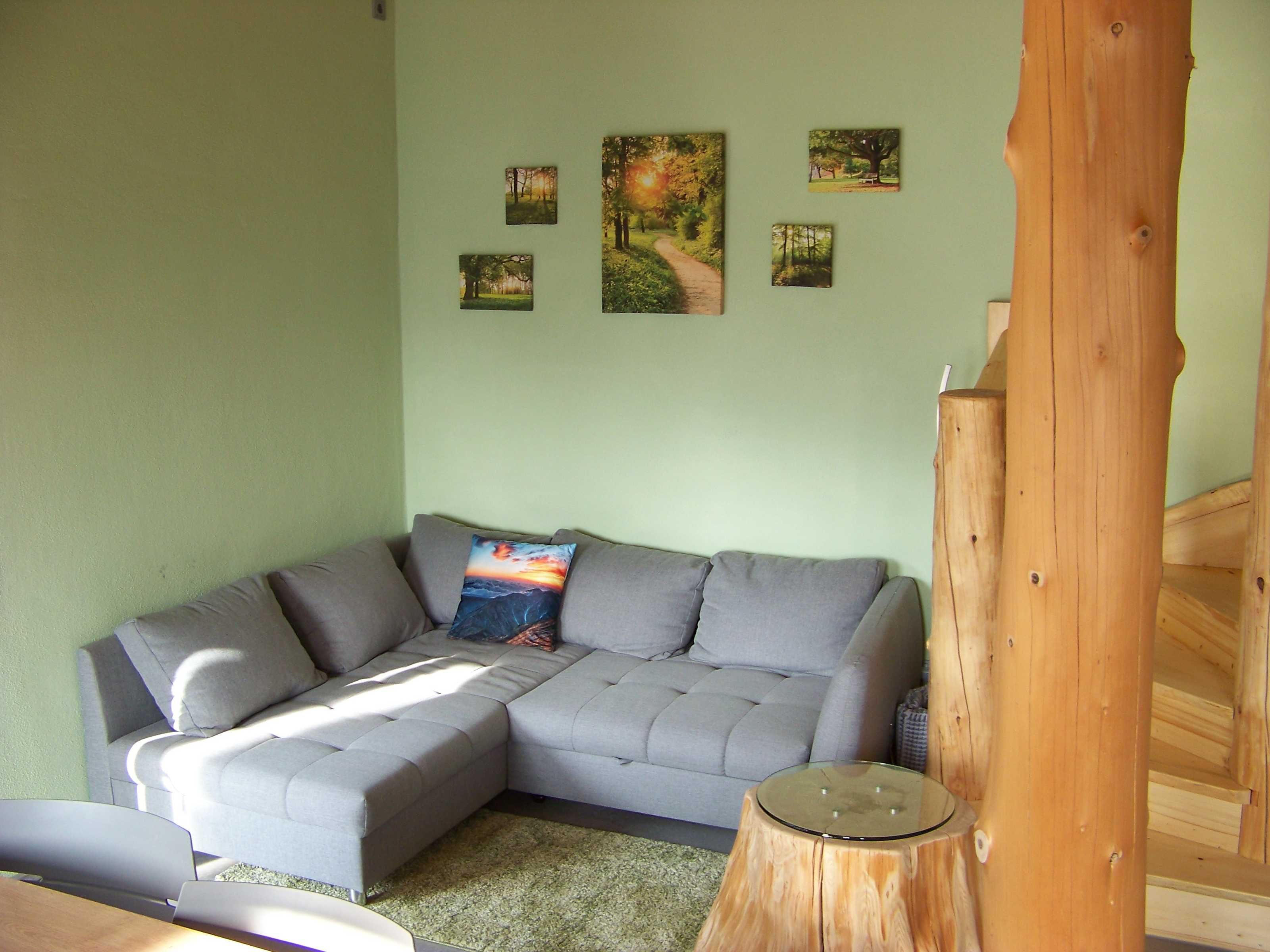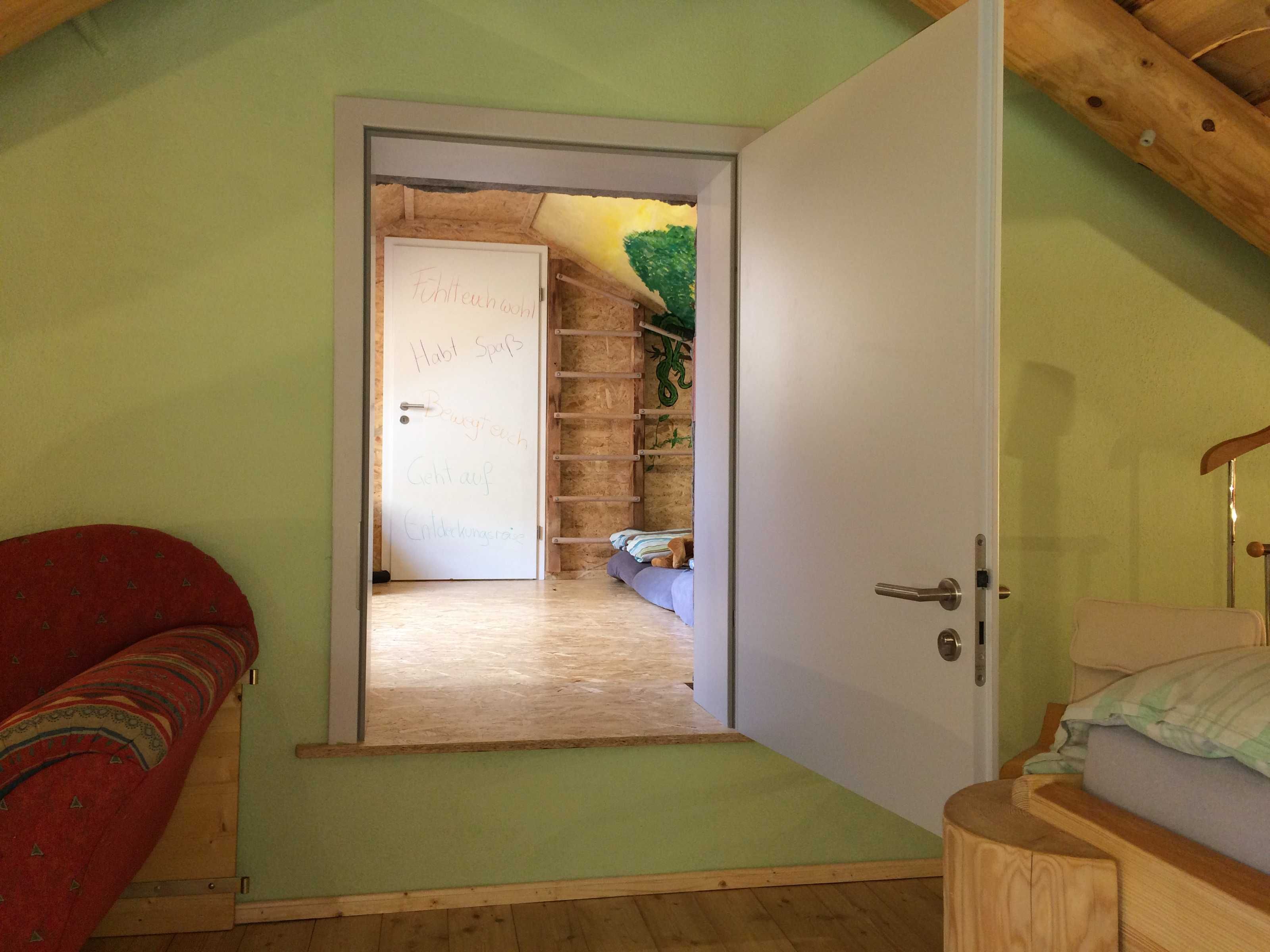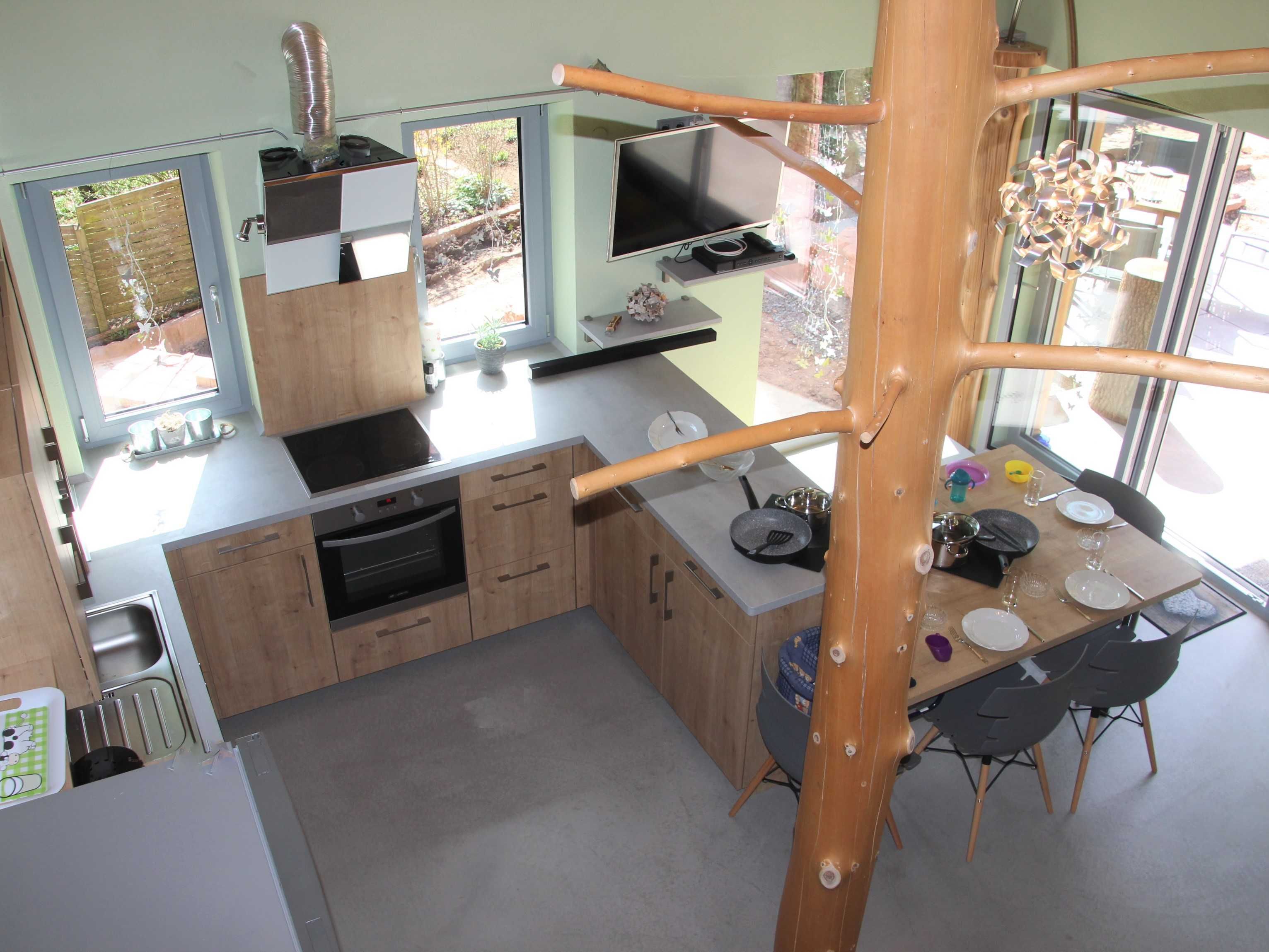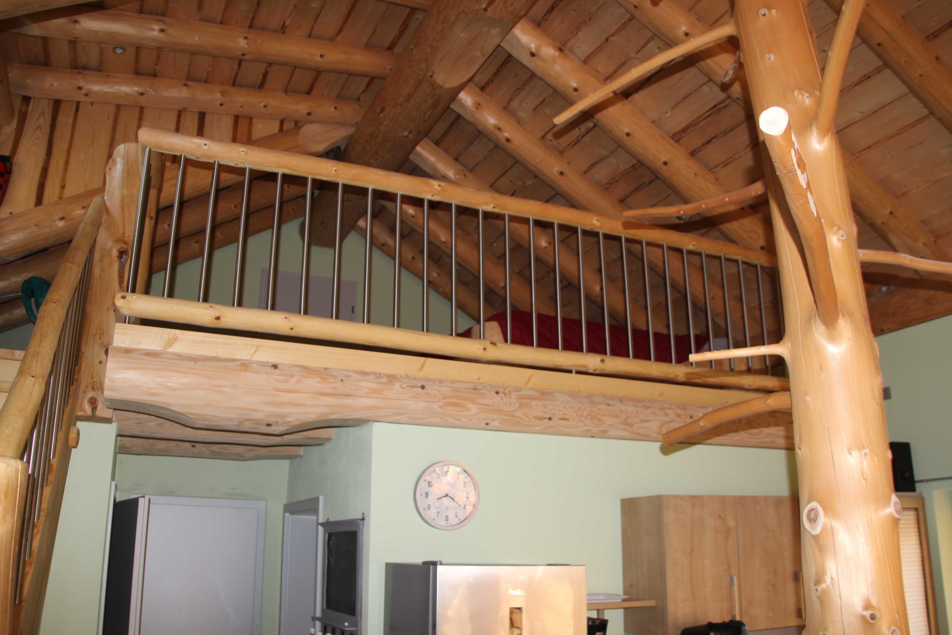 Die urige Außenansicht der großen Tannenstämme und der Lärchenverschalung gibt der Holzhauszeit einen Hüttencharakter. Innen setzt sich dieser mit einem offenen Dachstuhl mit Schwadenbrettern fort. Der zentral in der Mitte des Raumes stehende Stamm mit Ästen vermittelt den Eindruck einer Forsthütte. Die offene Galerie mit Fenster zum Wald ist ein bevorzugter Platz zum Lesen und Entspannen, oder einfach nur Musikhören.