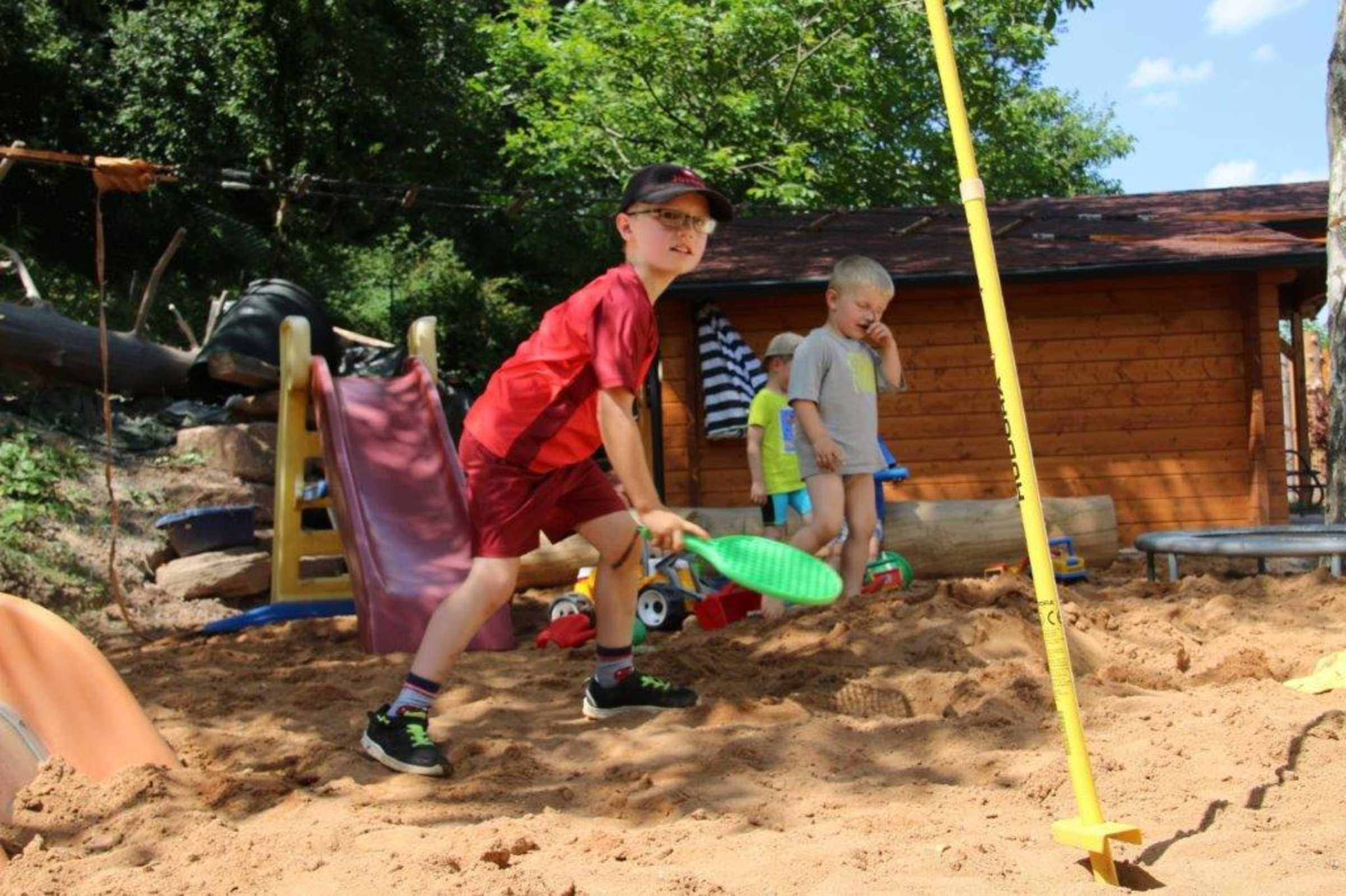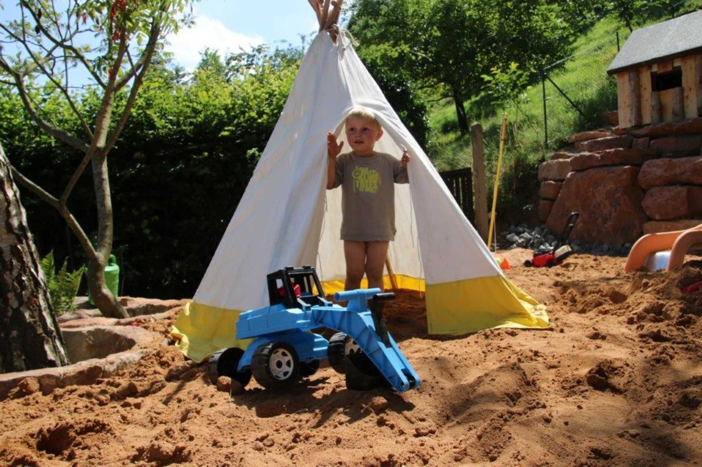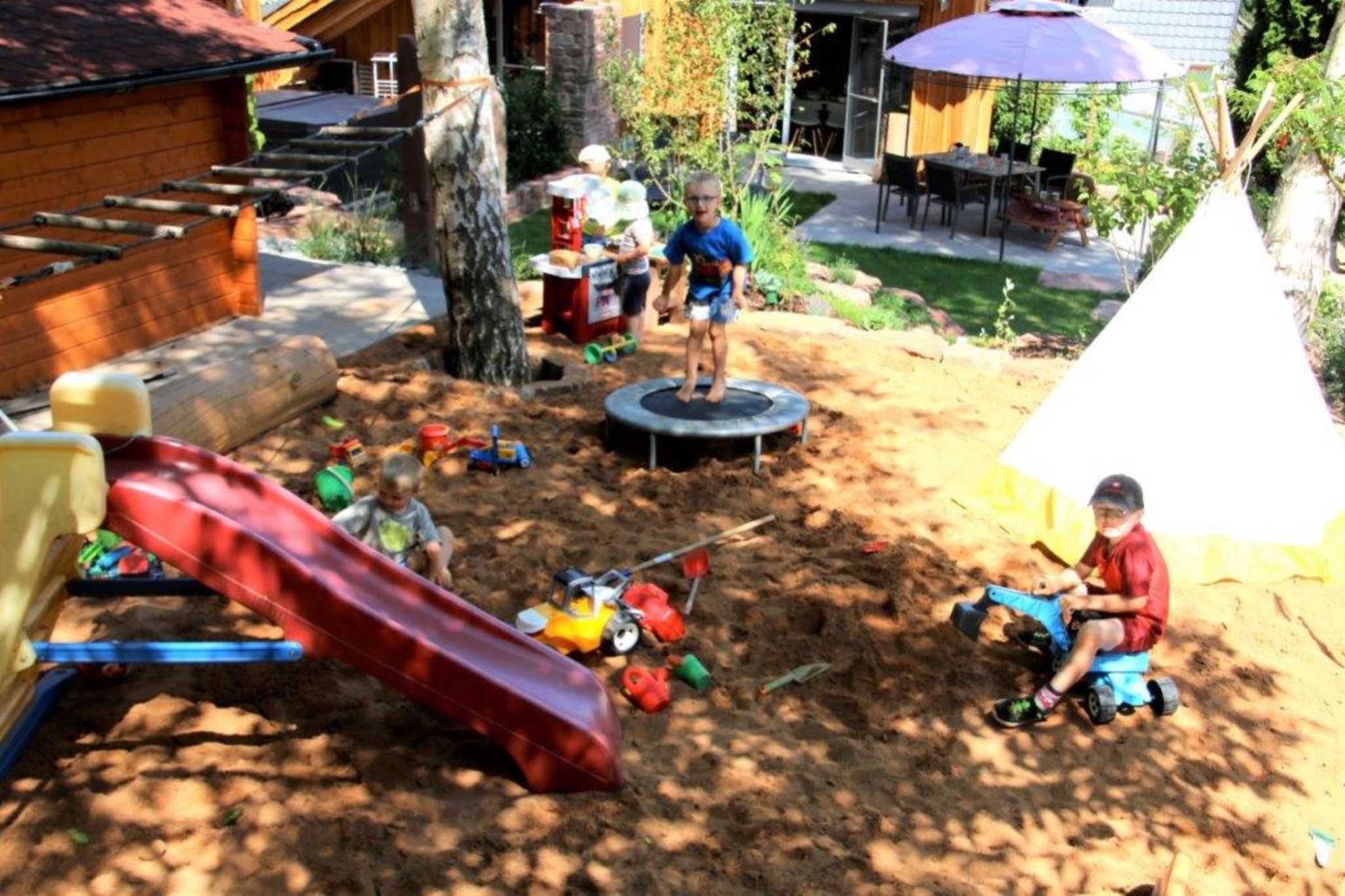Auf dem großen Spielplatz mit Megarutsche und ganz viel Sand für die größten Burgen, die je gebaut worden sind die Kleinen und Großen direkt in Sichtweite zum Haus. Bei Regen haben die Kinder auf Wunsch einen „Indoor“ Spielplatz mit Namen „Abenteuerland“. Im Haus ist alles kindersicher und dennoch kinderfreundlich. Die große Terrasse lädt im Sommer wie auch im Winter zum Grillen ein, auf Wunsch mit Gas, Holzkohle oder ganz zünftig mit offenem Feuer. Vom offenen Whirlpool aus haben die Eltern Ihre Kinder während dem Spielen immer voll im Blick. Oder Sie können auch abends in der Blockhaus-Sauna ganz entspannt genießen, und haben Ihre Schützlinge über Babyphone am Ohr.