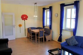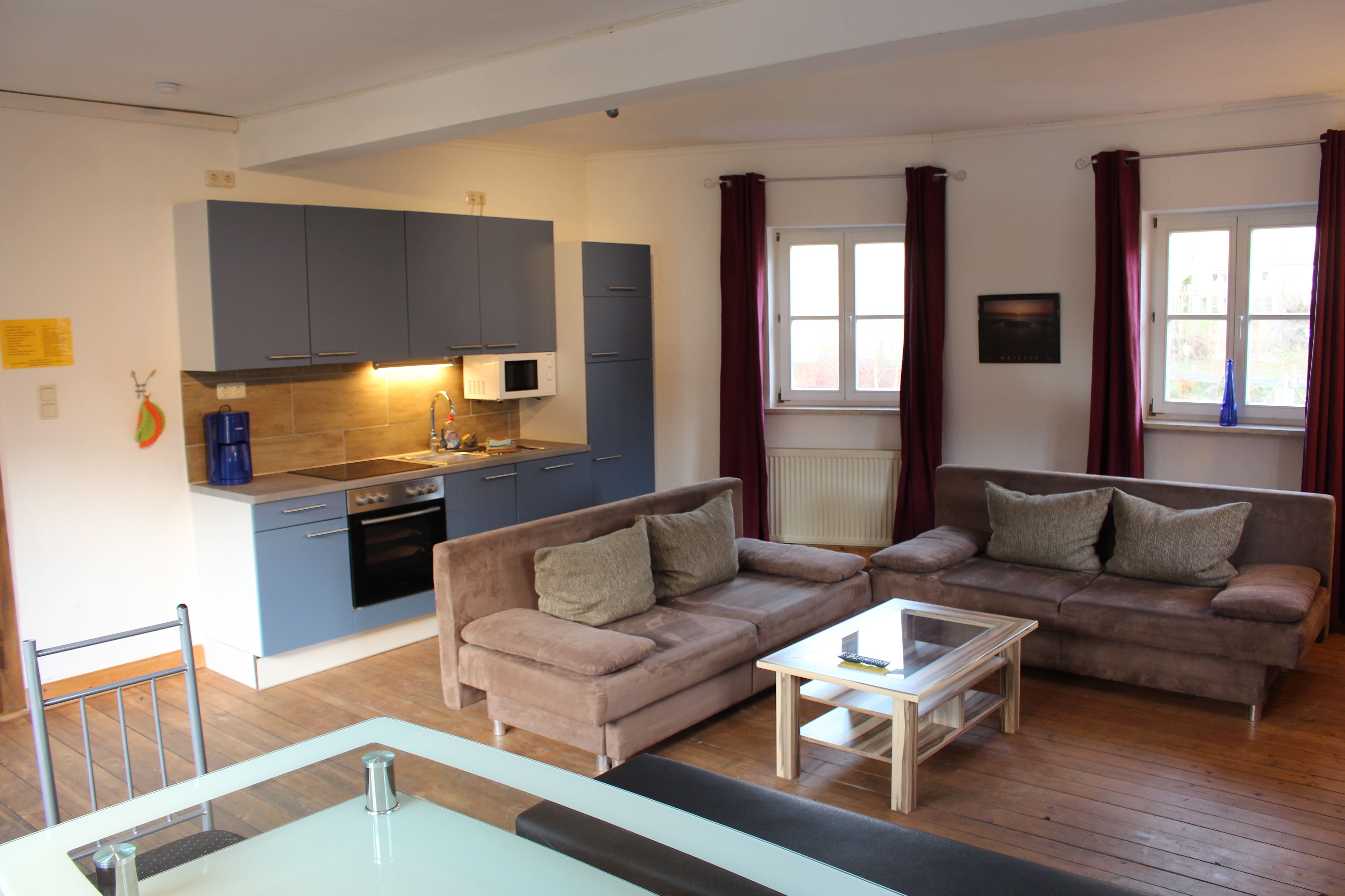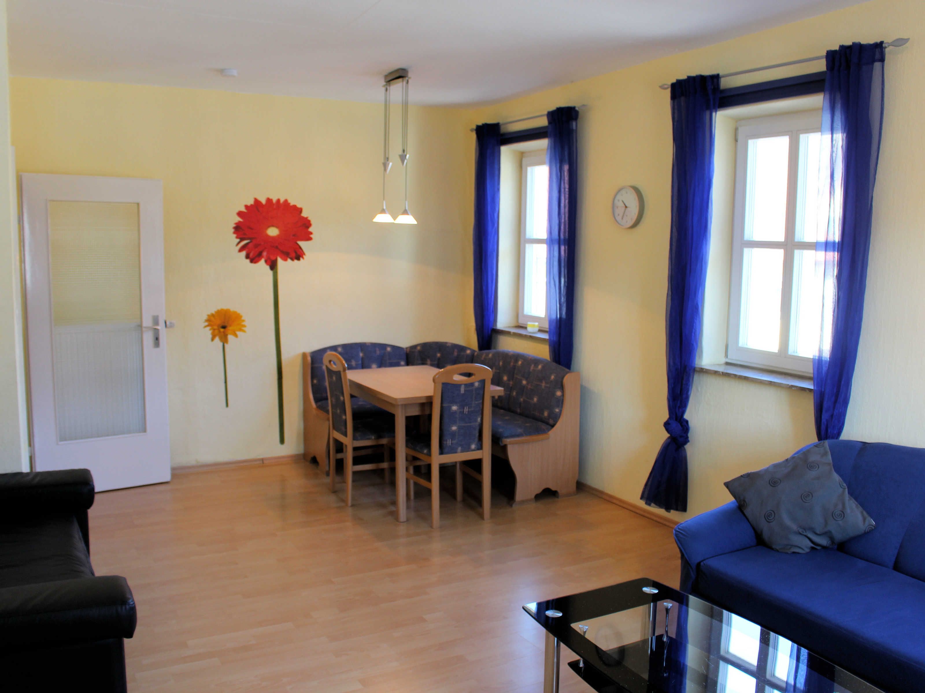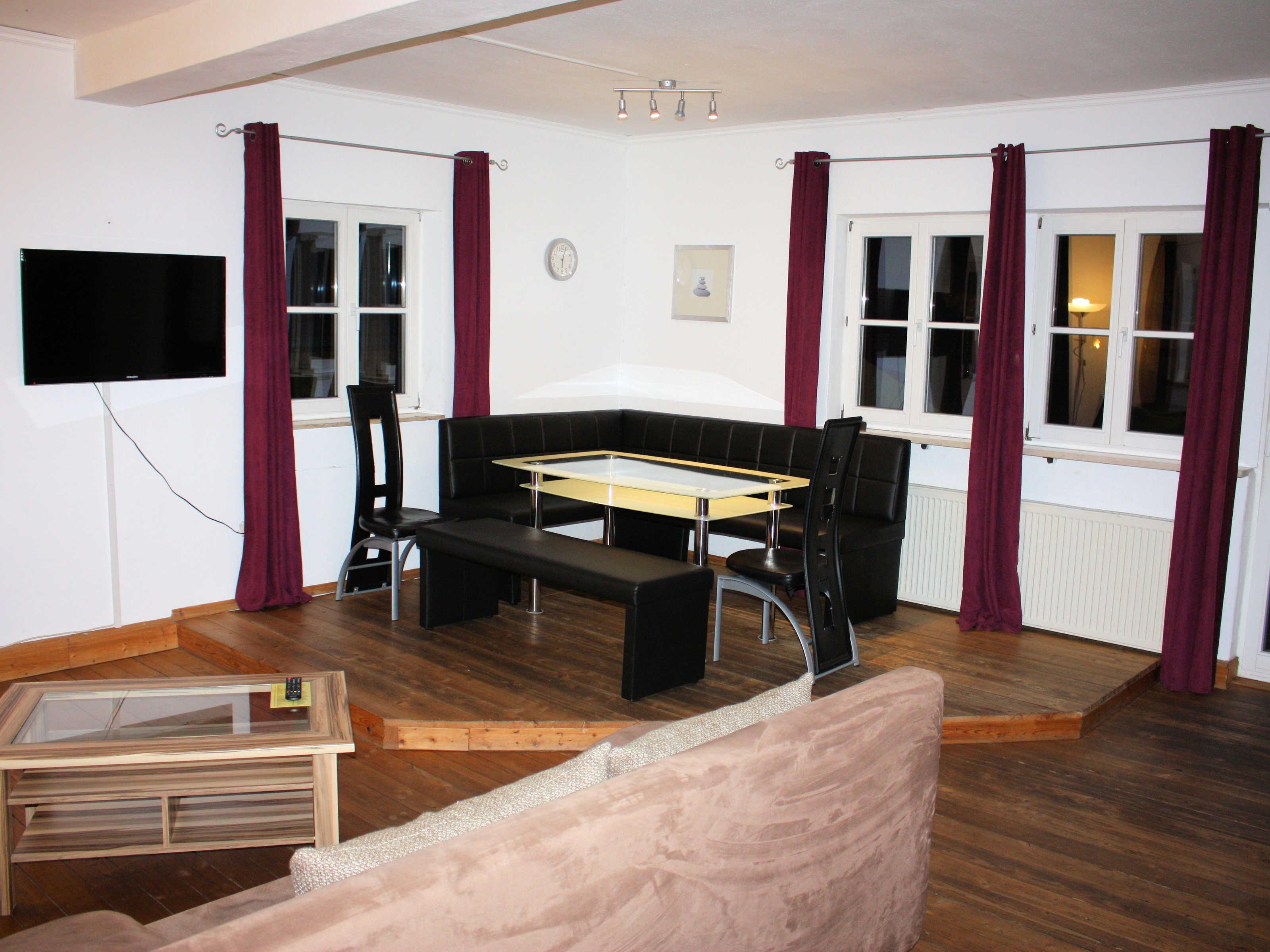 Die Wohnung besteht aus 3 Schlafzimmern mit je 2 Betten und separatem Wohnzimmer sowie einer Küche. In der Küche ist ein 4 Plattenherd, Mikrowelle, Kaffeemaschine, Wasserkocher, Toaster, Geschirr für 12 Personen usw. Im Wohnzimmer sind 2 Sofas, ein Esstisch und ein 40 Zoll Flat-TV mit Kabelanschluss, zusätzlich sind in den Schlafzimmern noch kleinere TV´s. Die Betten sind bezogen, Handtücher sind kostenlos.Im Haus steht ein Getränkeangebot zum Selbstkostenpreis bereit. Gegen Gebühr ist die Nutzung der hauseigenen Sauna und unseres Fahrradverleihs sowie Elektrofahrräder möglich.Neu ist unsere Medi Stream Massageliege, 20 Minuten kosten 10,- Euro. Auf Wunsch kann ein reichhaltiges Frühstück vom Buffet dazugebucht werden. Dabei verwöhnen wir Sie mit duftendem Kaffee, knusprigen Brötchen aus der angrenzenden Bäckerei sowie mit selbstgemachten Marmeladen. Die Wohnung ist ca. 50 bzw. 30 m von unserem Hauptgebäude entfernt. Entweder im Neumeyerhaus, oder im Färberhaus. Gegen Aufpreis können noch Sofa´s aufgebettet werden. Kinderbett und Hochstuhl kann ebenfalls unter Zusatzleistungen kostenlos dazugebucht werden.
