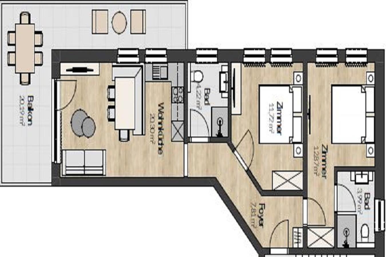Top 4 mit ca. 61 m²: 2 Doppelzimmer, 2 Badezimmer mit Dusche und WC, vollausgestattete Wohnküche mit Essbereich und einem Schlafsofa für 2 weitere Personen und Balkon.