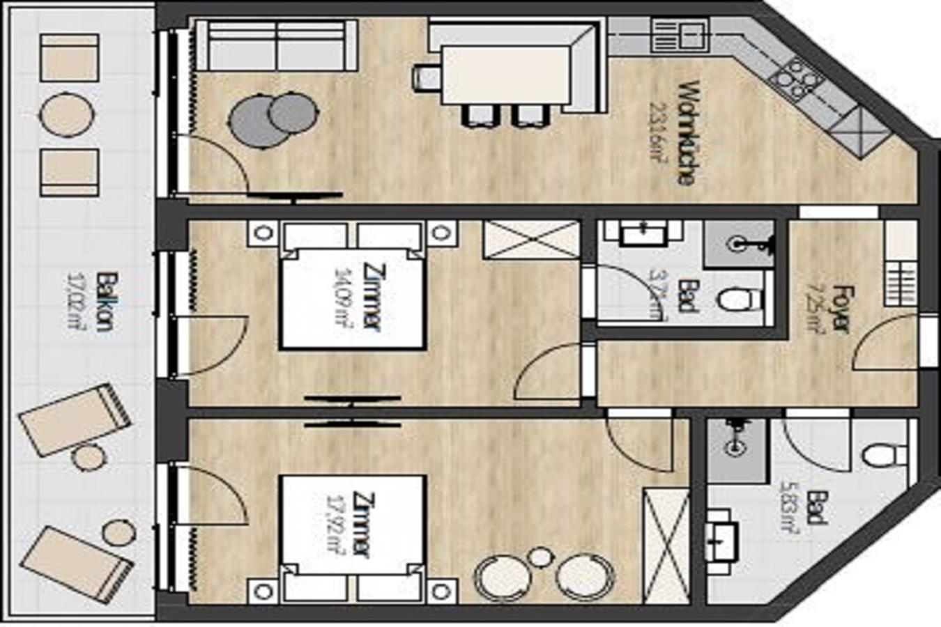 Top 5 mit ca. 73 m²: 2 Doppelzimmer, 2 Badezimmer mit Dusche und WC, vollausgestattete Wohnküche mit Essbereich und einem Schlafsofa für 2 weitere Personen und Balkon.