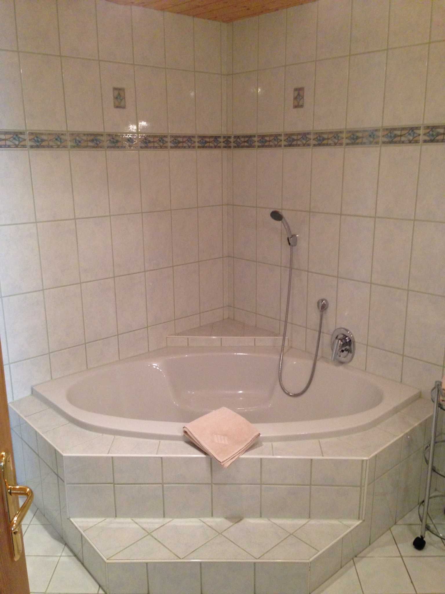 eine voll ausgestattete Kücke mit Essplatz, ein Badezimmer mit Eckbadewanne und