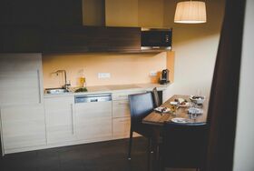 Voll ausgestattete Küche mit Essplatz, kombinierter Wohn-Schlafraum, Schlafzimmer mit Doppelbett, Schlafzimmer mit Doppelbett und multifunktionalem Zusatzbett, zwei Bäder mit großer Dusche, separates WC und möblierte Terrasse im zweiten Stock. 50'' Flatscreen, Nespressomaschine, kostenloses WLAN, Safe und Föhn. Größe ca. 61 m² mit Westblick.