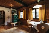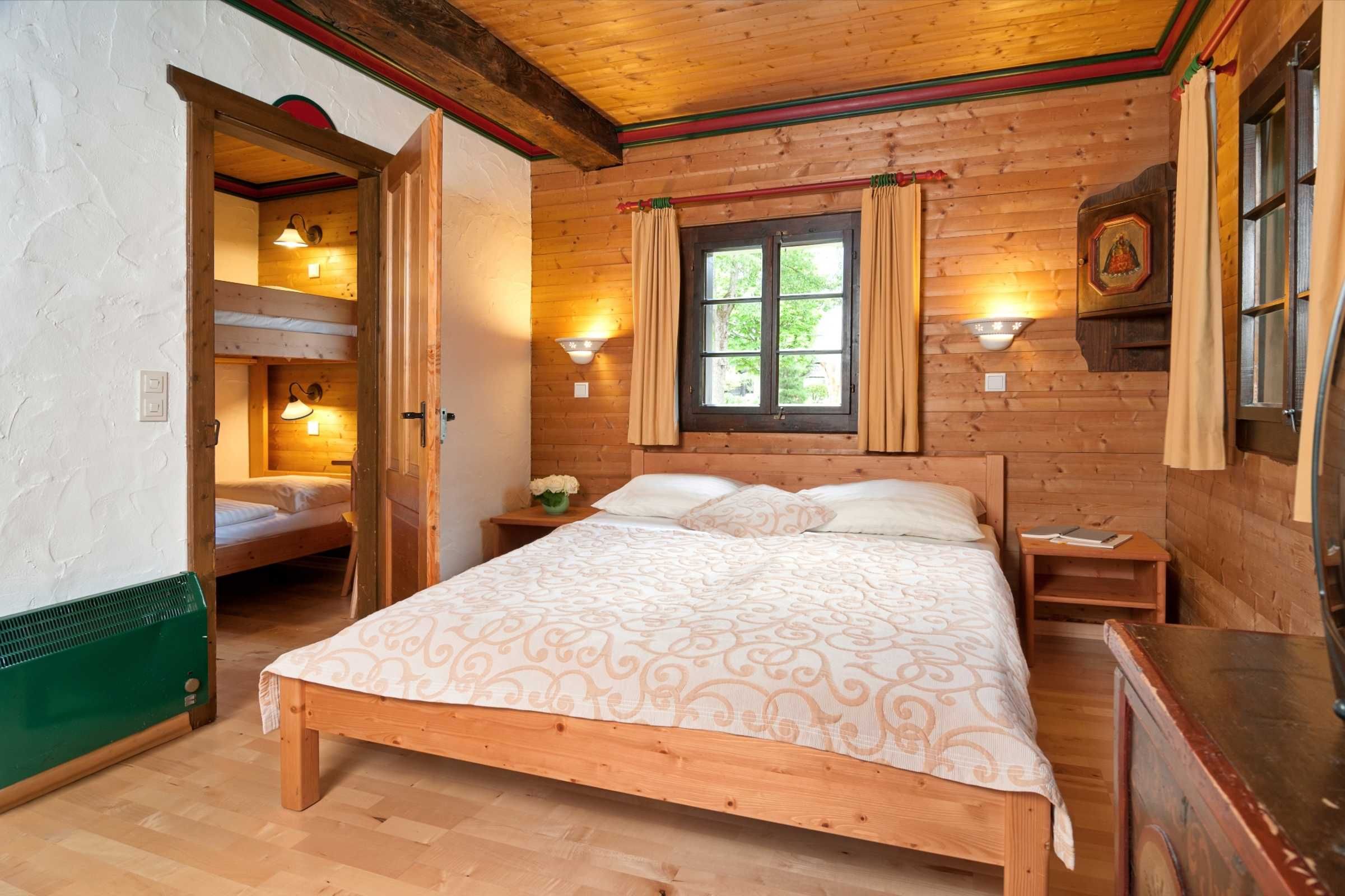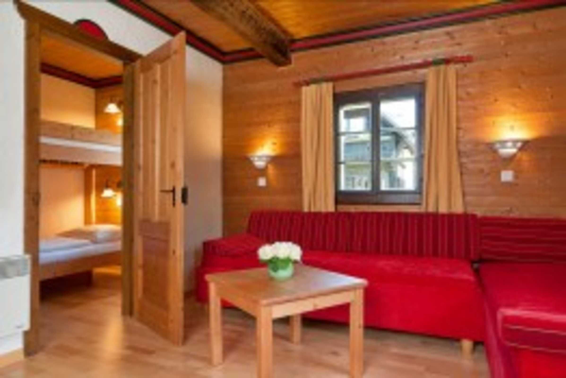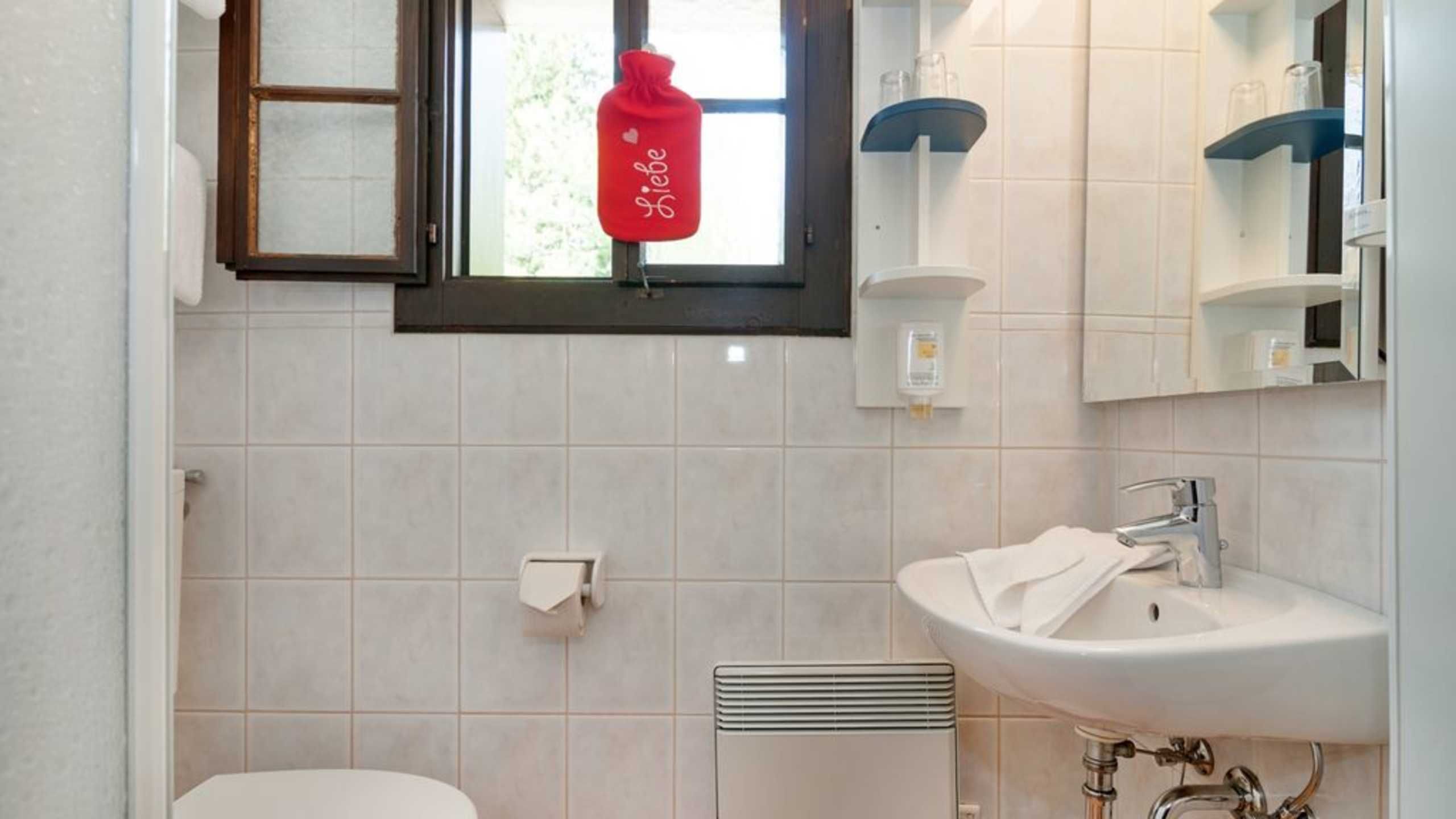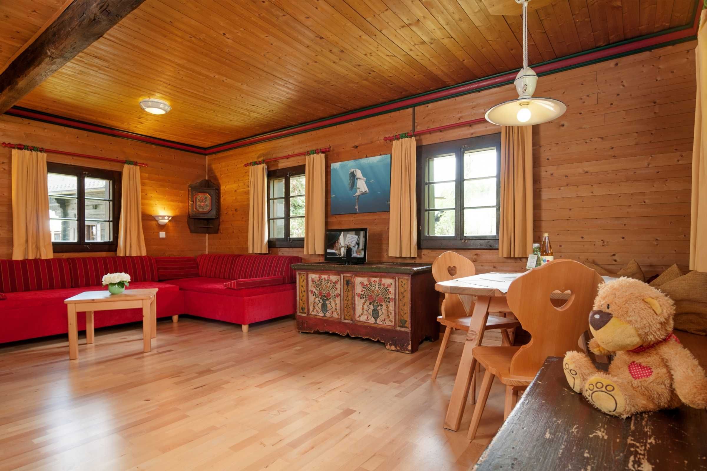 Im Parterre mit einer Wohnfläche von ca. 35 m², augestattet mit Küchenzeile, Wohnraum mit Sitzgruppe (2 Sitz-/Schlafcouches), Kachelofen und Essecke, kleines Schlafzimmer mit Etagenbett, Dusche, WC.