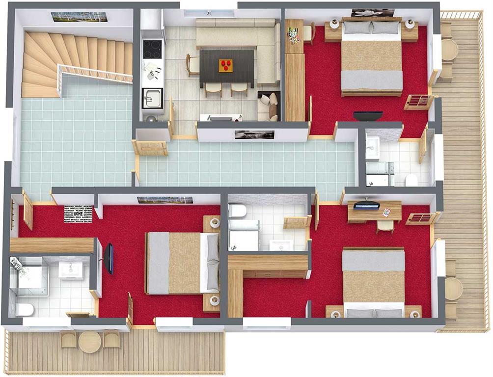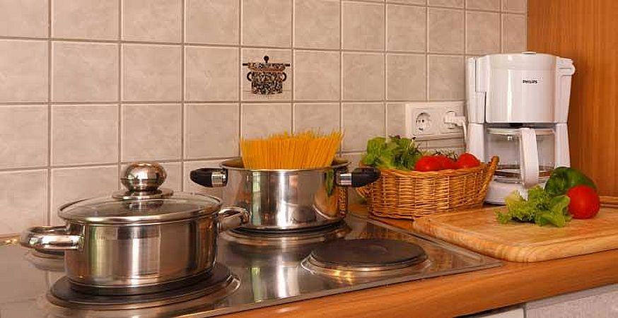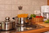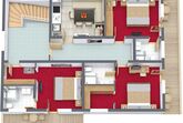 Appartement im 1. oder 2. Stock mit großer, vollausgestatteter Wohnküche mit Kaffeemaschine, 4-Plattenherd, Backofen, Geschirrspüler, Geschirr, Kühlschrank, großer Essecke und gemütlicher Wohnecke. 3 Doppelzimmer mit je einem Badezimmer mit Dusche/WC. Jedes Schlafzimmer mit Radio, Safe, Kabel-TV und einem Balkon. Größe ca. 70 m²