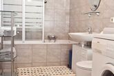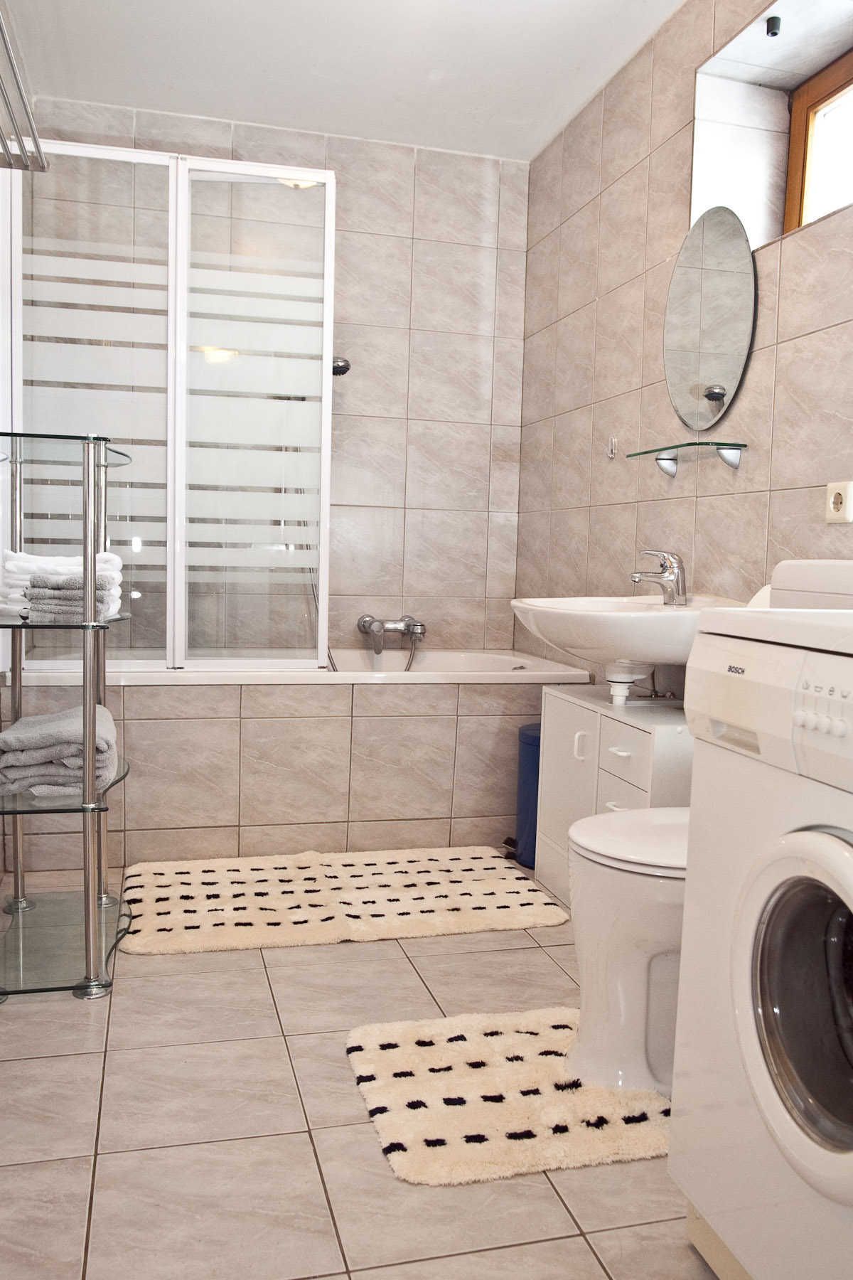 +das Badezimmer ist mit Badewanne, Dusche, Waschbecken und Toilette Waschmaschine ausgestattet, Föhn ist auch vorhanden