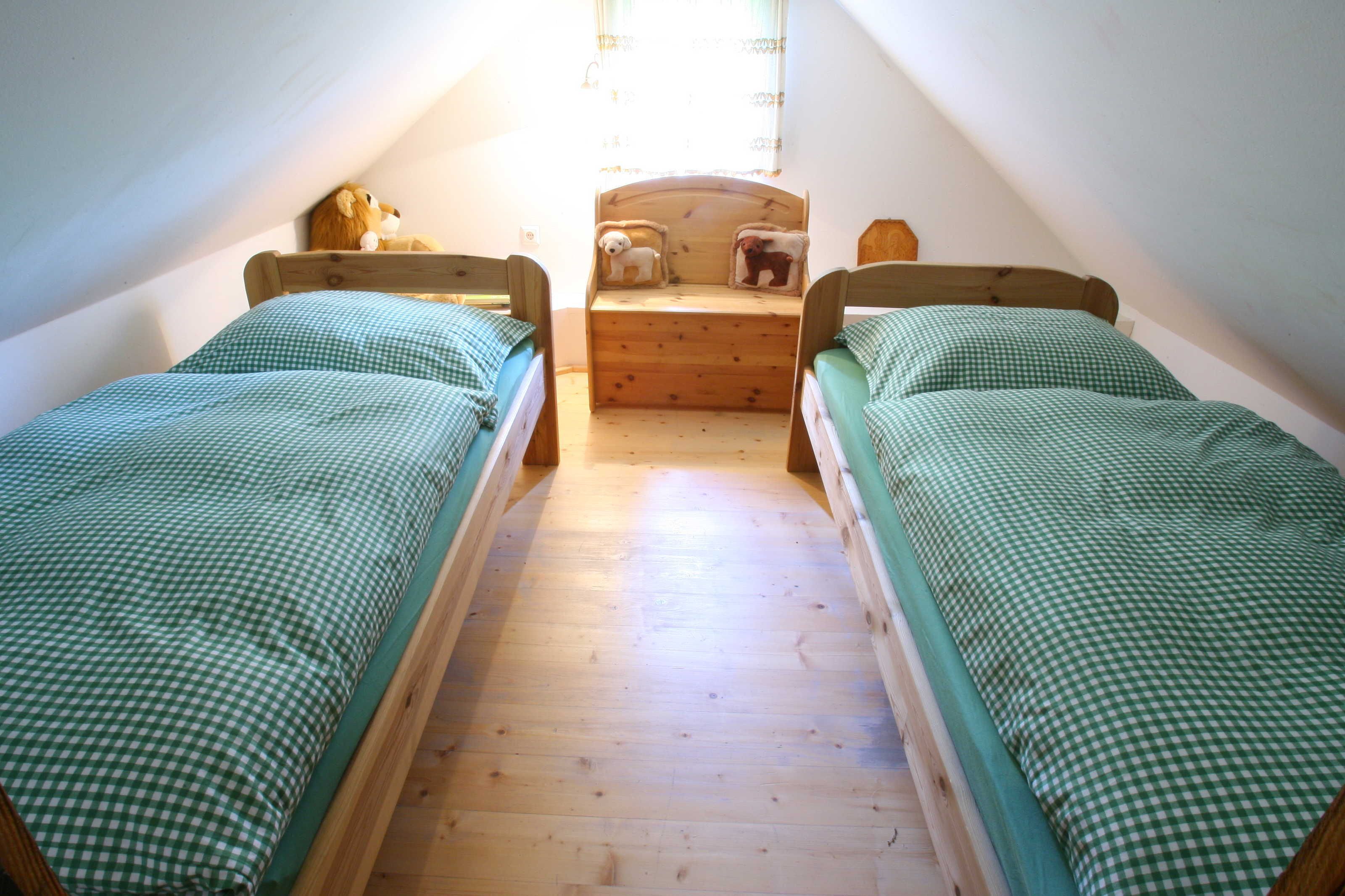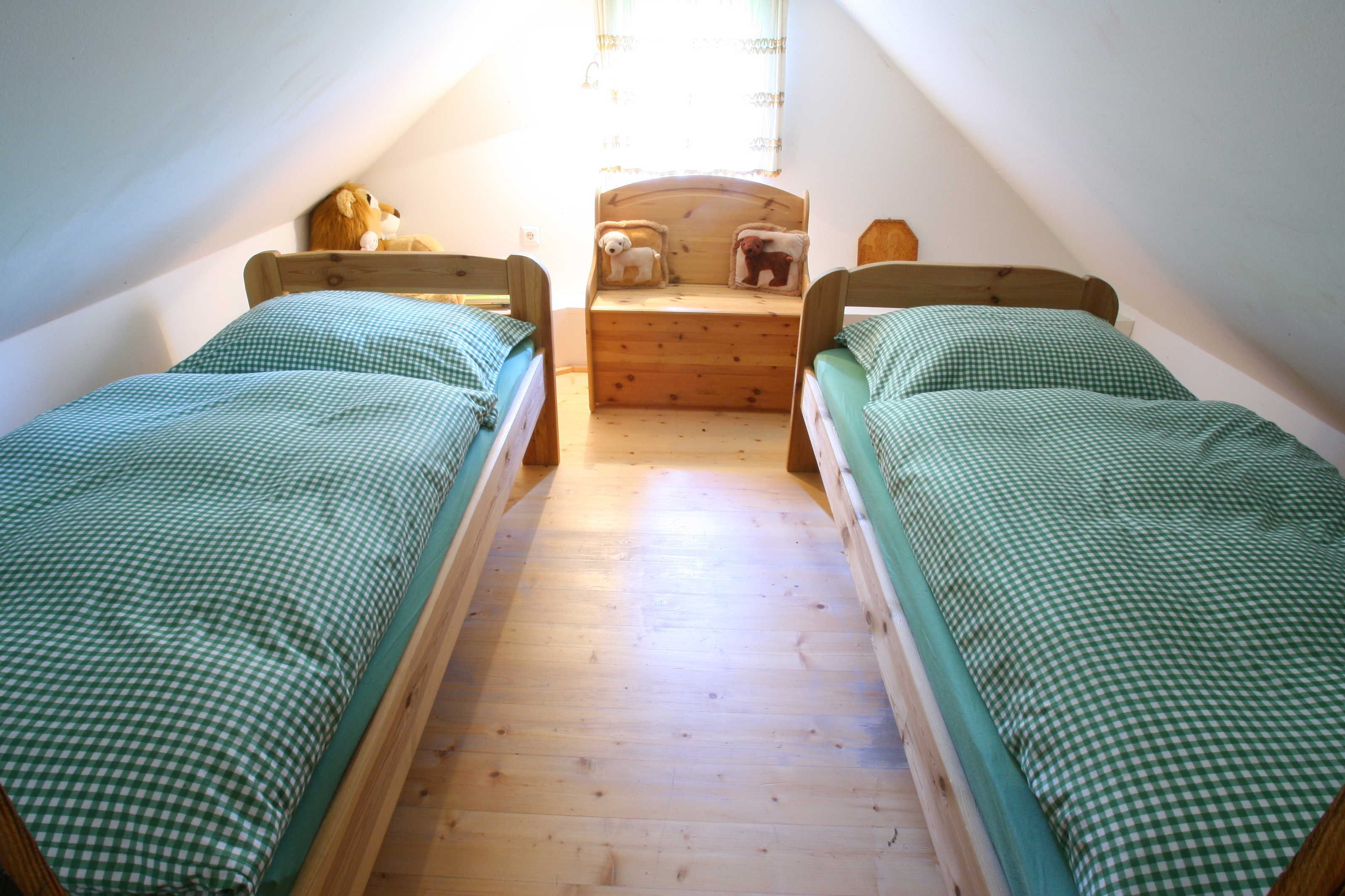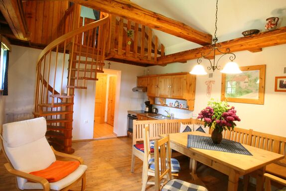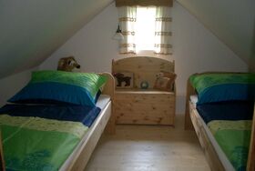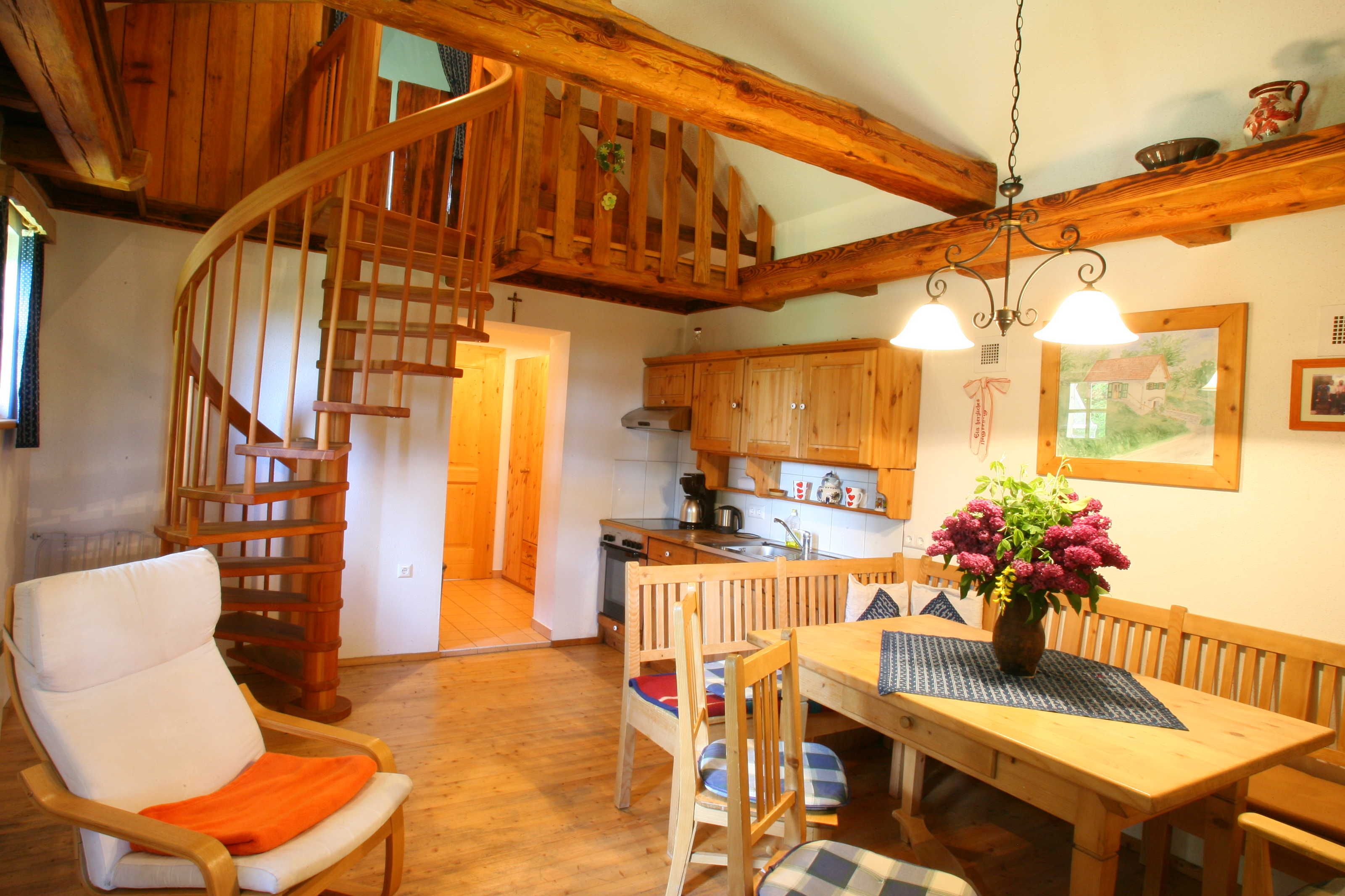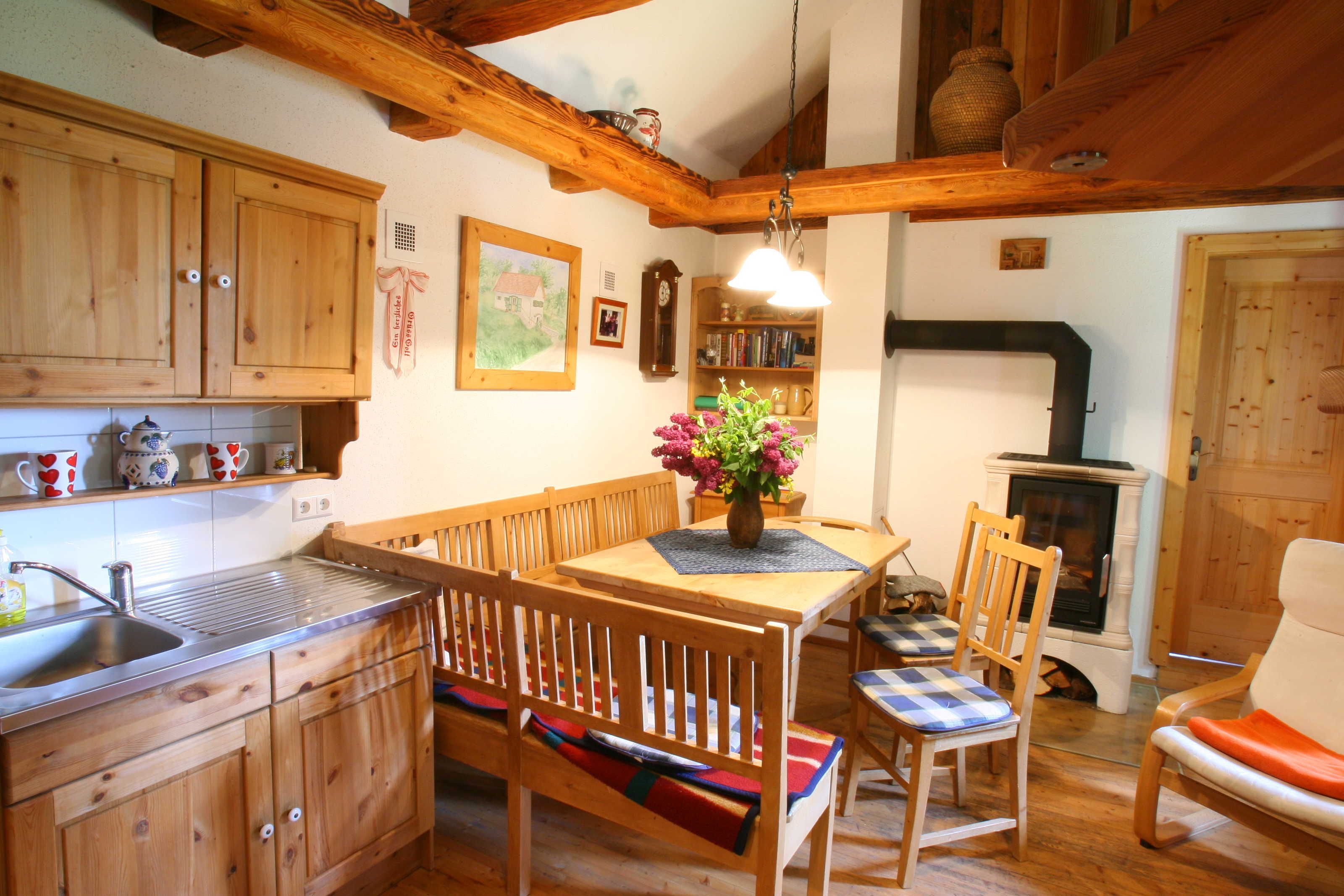 Einrichtung: voll ausgestattete Wohnküche, Badezimmer mit Dusche u. Waschmaschine, WC (getrennt), 1 Doppelzimmer, 1 Schlafzimmer mit 2 Betten unterm Dach, TV vorhanden