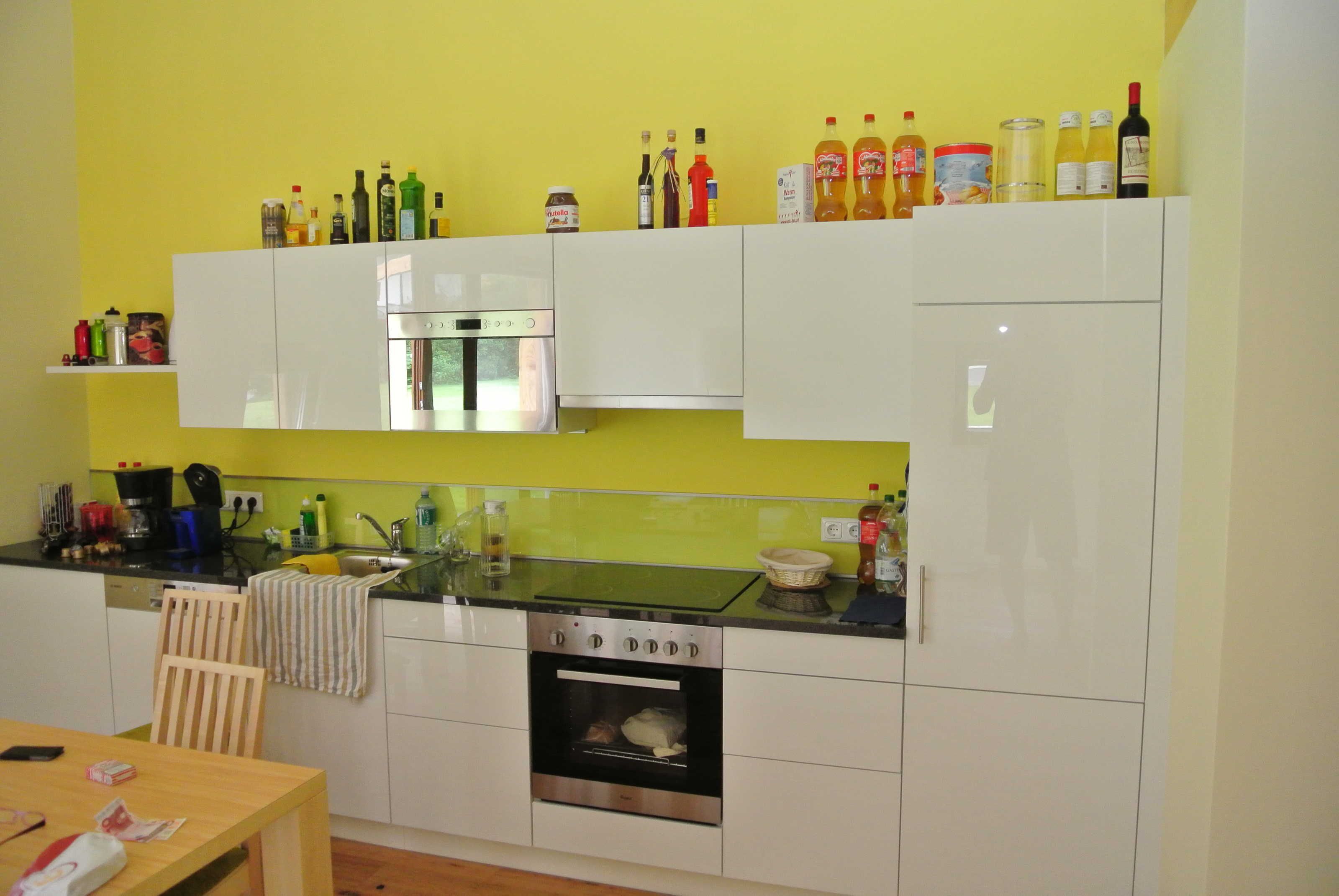 Küchenzeile: Herd, Backrohr, Mikrowelle, Wasserkocher, Kühlschrank mit Gefrierfach, Mixer, Kochgeschirr, Bratpfannen