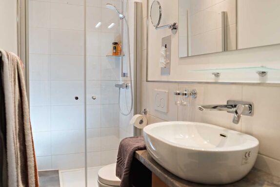 In unseren Komfort-DZ wie OMAS STUBB´ lässt es sich besonders ruhig und komfortabel Ruhen: Ein großzügiger, tagesheller Dusch/WC-Bereich, jede Menge Schrankraum mit großem Spiegel und das kuschelige Doppelbett mit variabel verstellbaren Lattenrosten und Komfortmatratzen. Eine Schreibgelegenhit gibt es auch und zudem einen großen sonnenverwöhnten Balkon, der sich zur Innenhof-Terrasse hin öffnet.