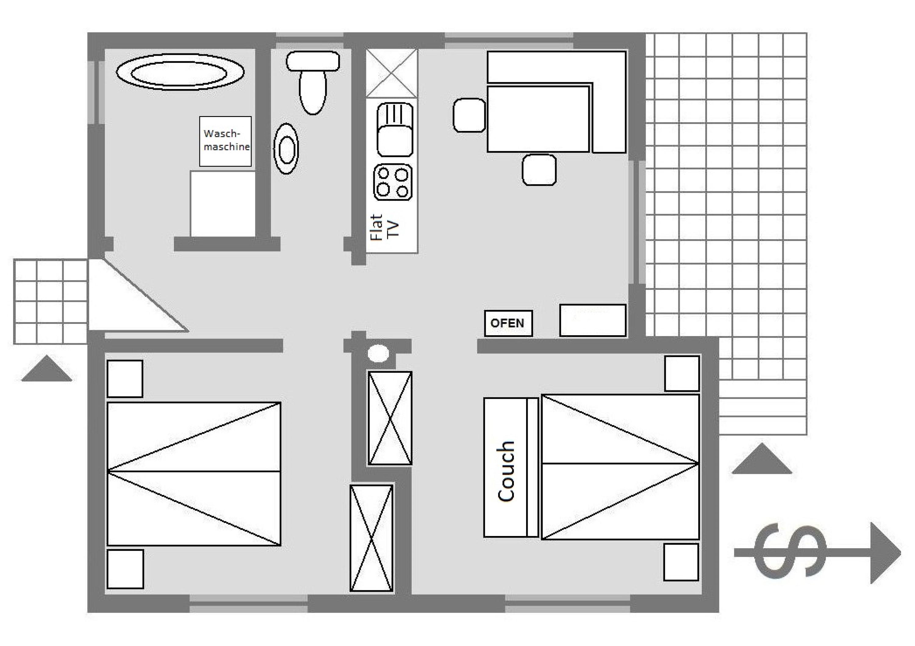 Es besteht aus zwei Doppelzimmern, eines davon mit Ausziehcouch, Vorraum, Dusche, separatem WC, Wohnküche, 9m² Terrasse und einem Autounterstellplatz.
