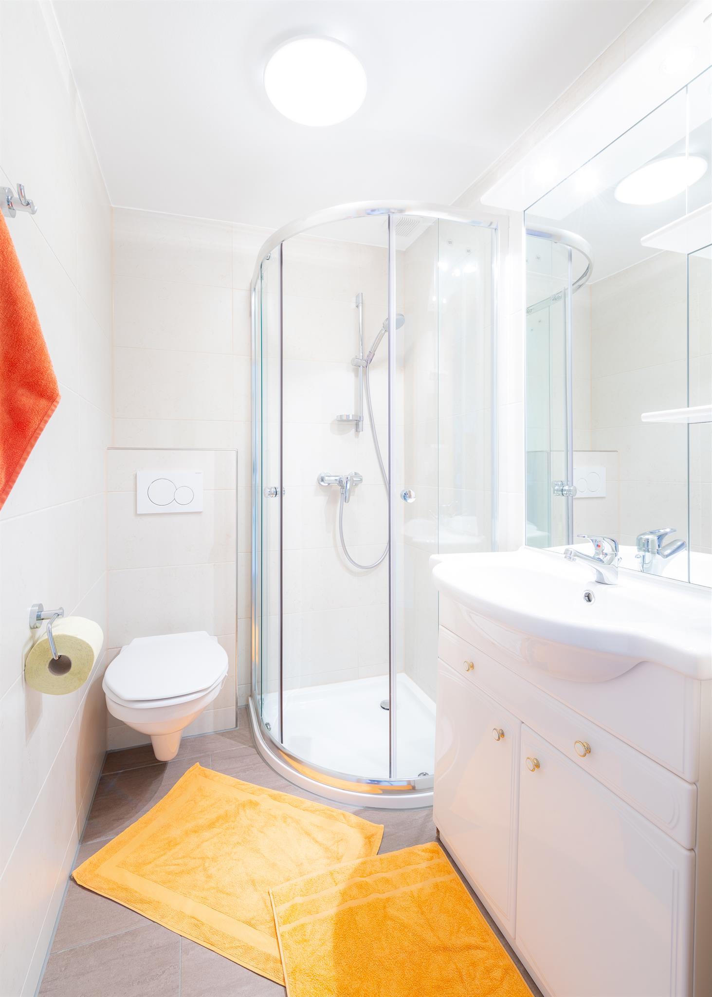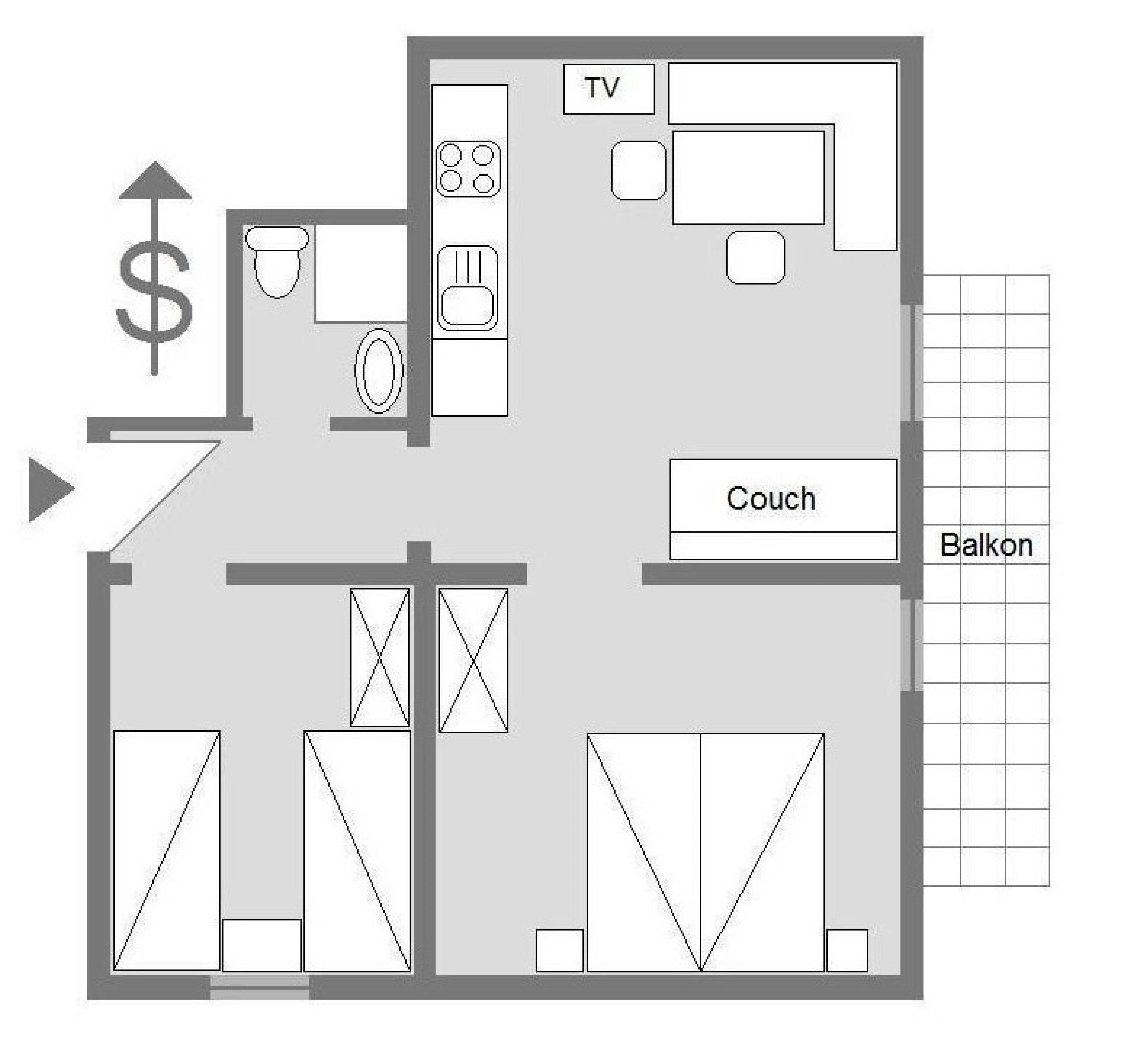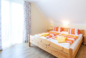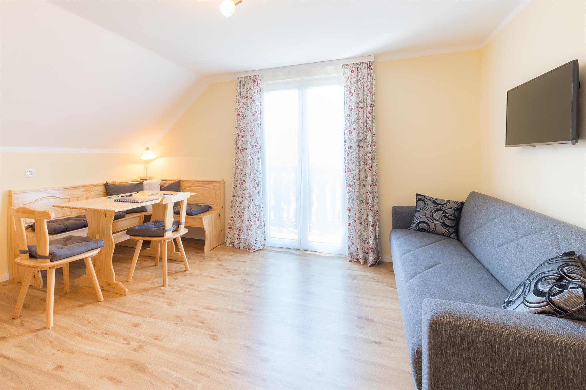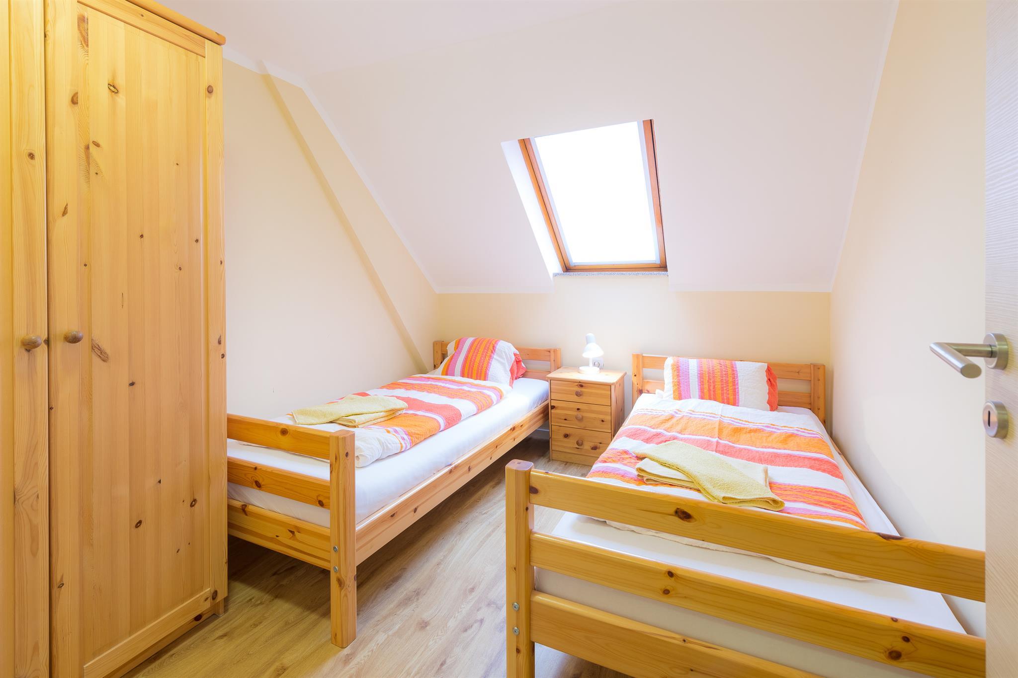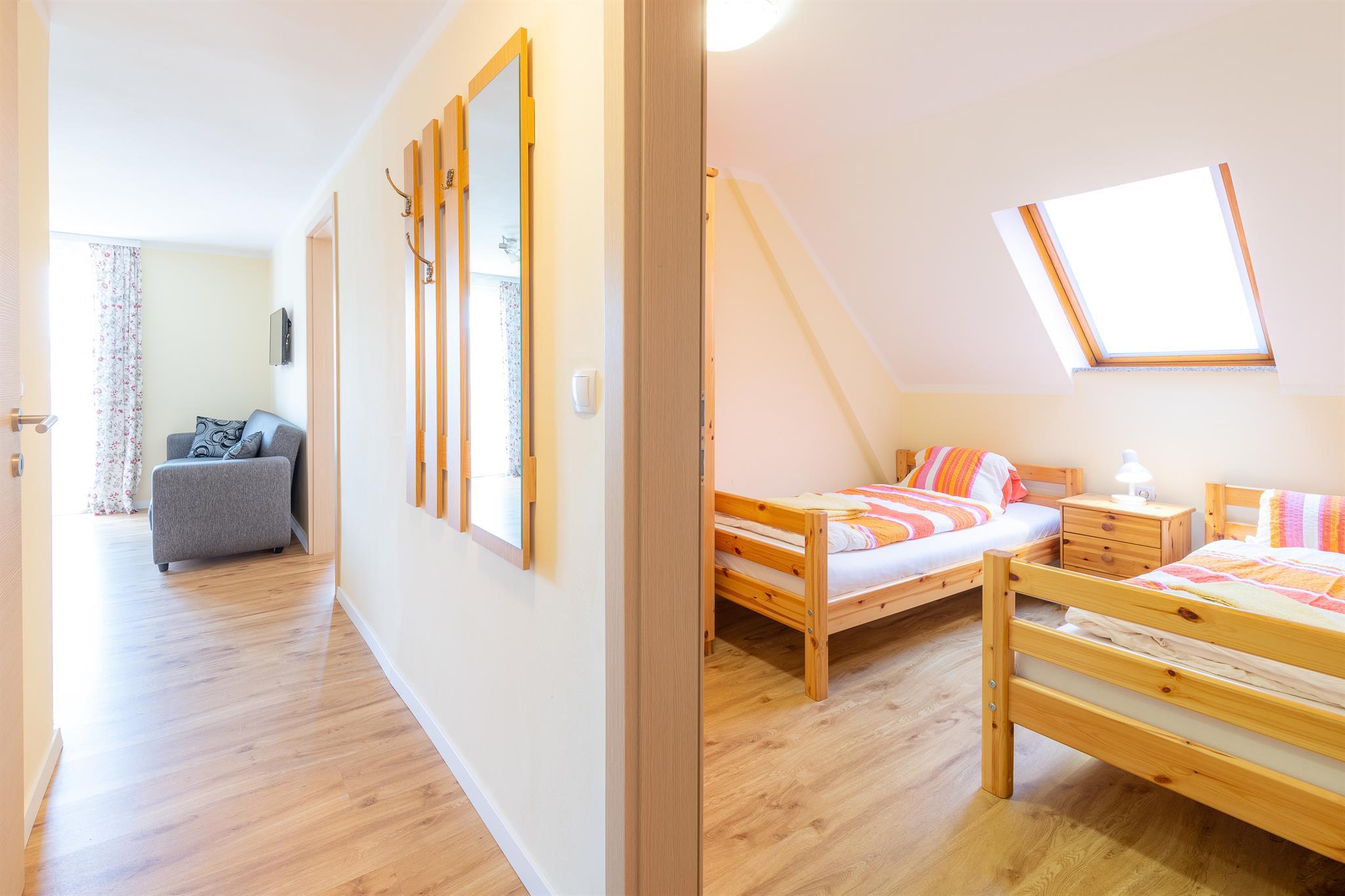 Sie befindet sich im zweiten Stockwerk und verfügt über ein Doppelzimmer, ein Zimmer mit 2 getrennten Betten, neues Bad, Vorzimmer, Wohnküche, kleinen Balkon und einem Autounterstellplatz.