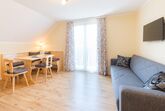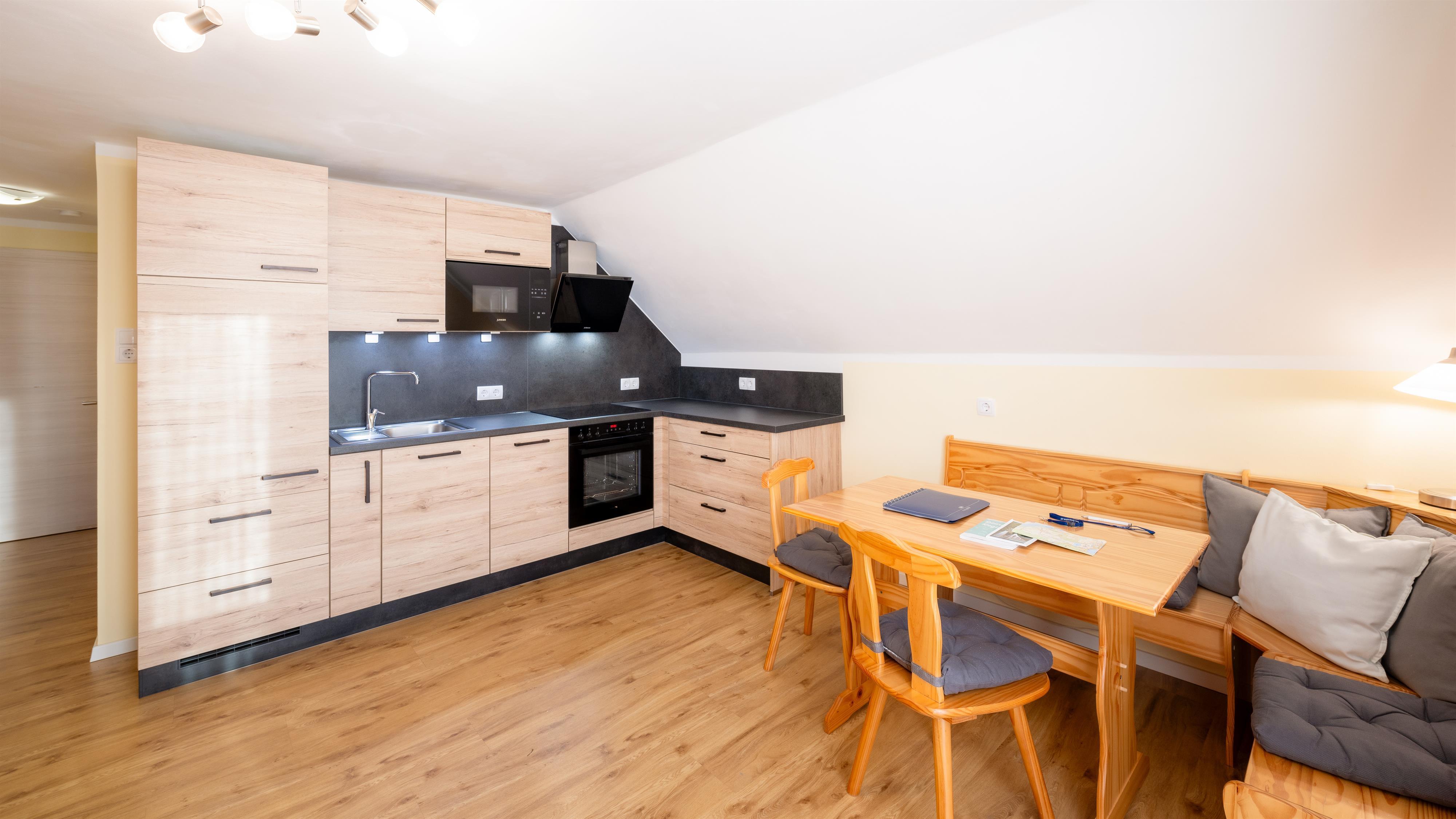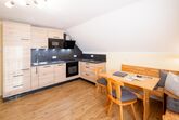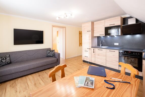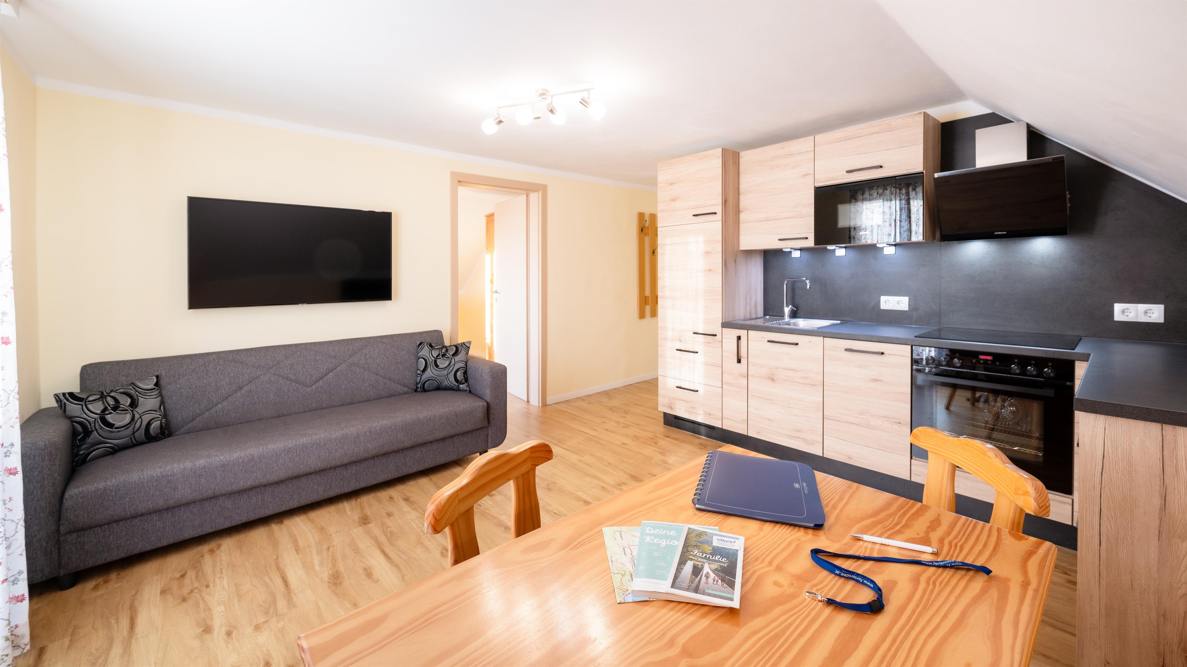 In der Wohnküche finden Sie eine Sitzecke, Ausziehcouch, Flat.-TV und eine komplett ausgestattete Küche, mit Backofen, Herd, Kühlschrank, Besteck, Geschirr und einer Kaffeemaschine.