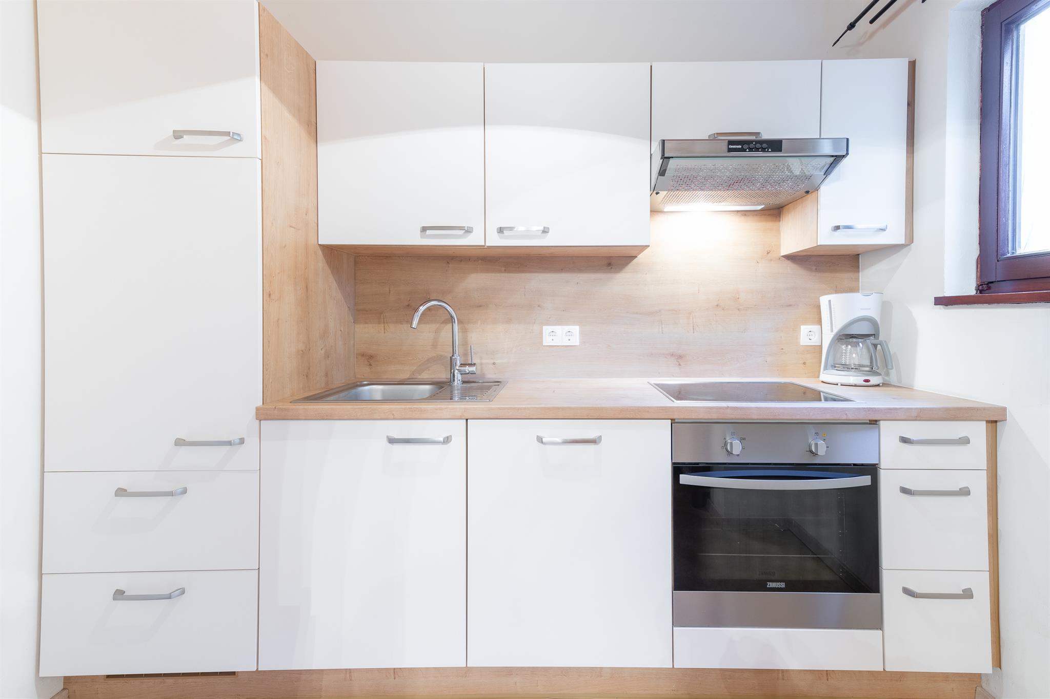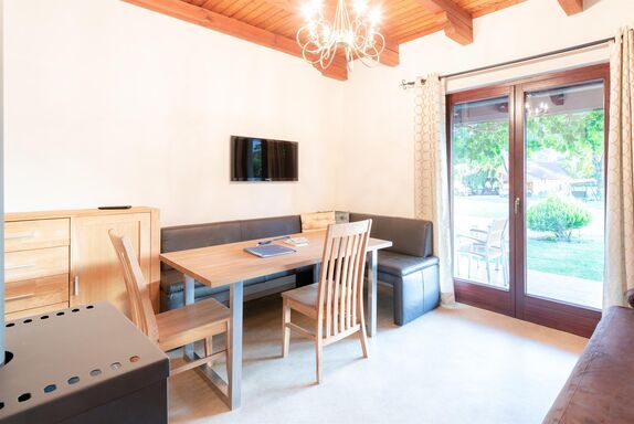 In der Wohnküche finden Sie eine Sitzecke, Ausziehcouch, Flat-TV, Schwedenofen und eine komplett ausgestattete Küche mit Geschirrspüler, Backofen, Herd, Kühlschrank, Besteck, Geschirr und einer Kaffeemaschine.
