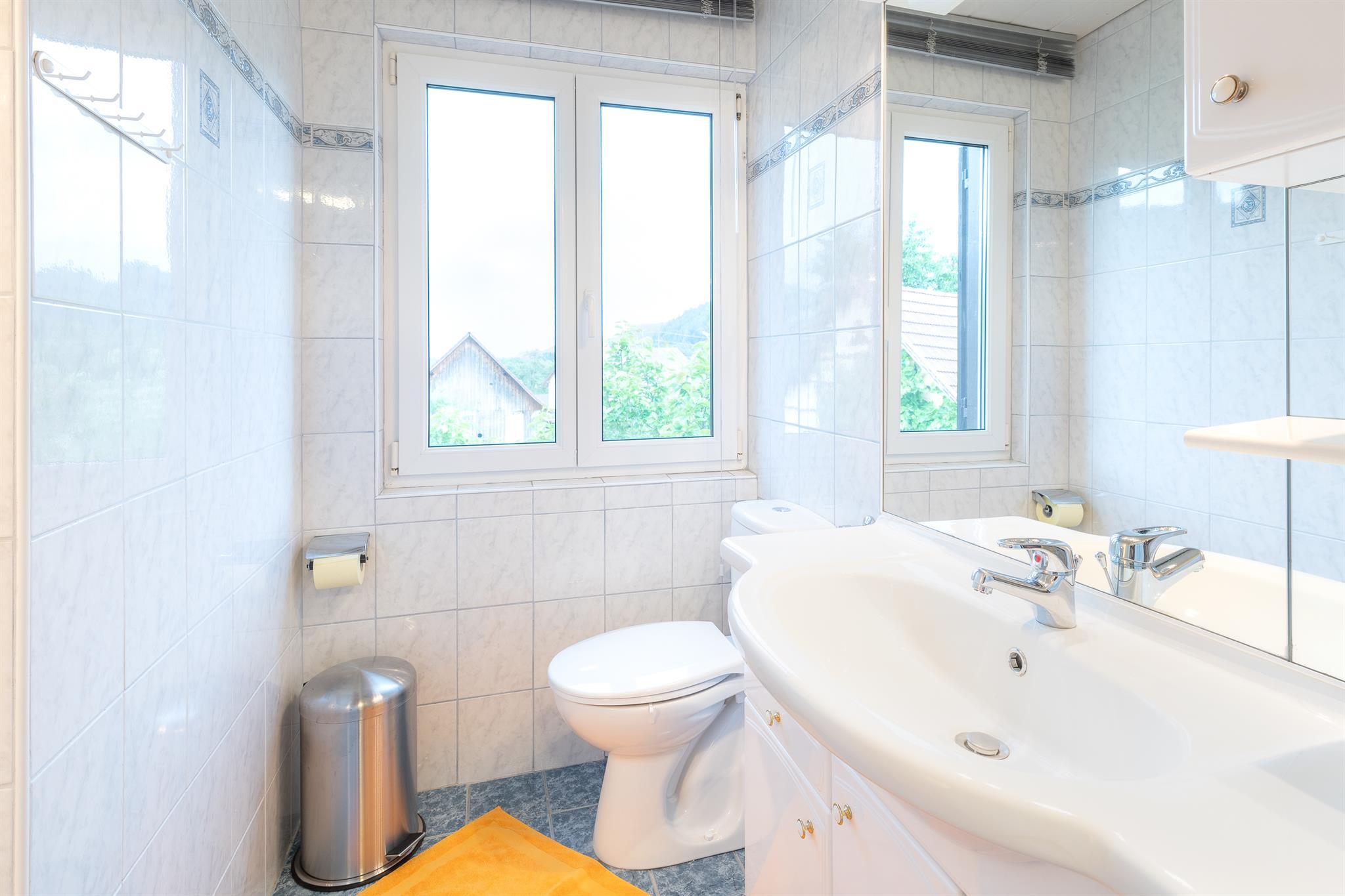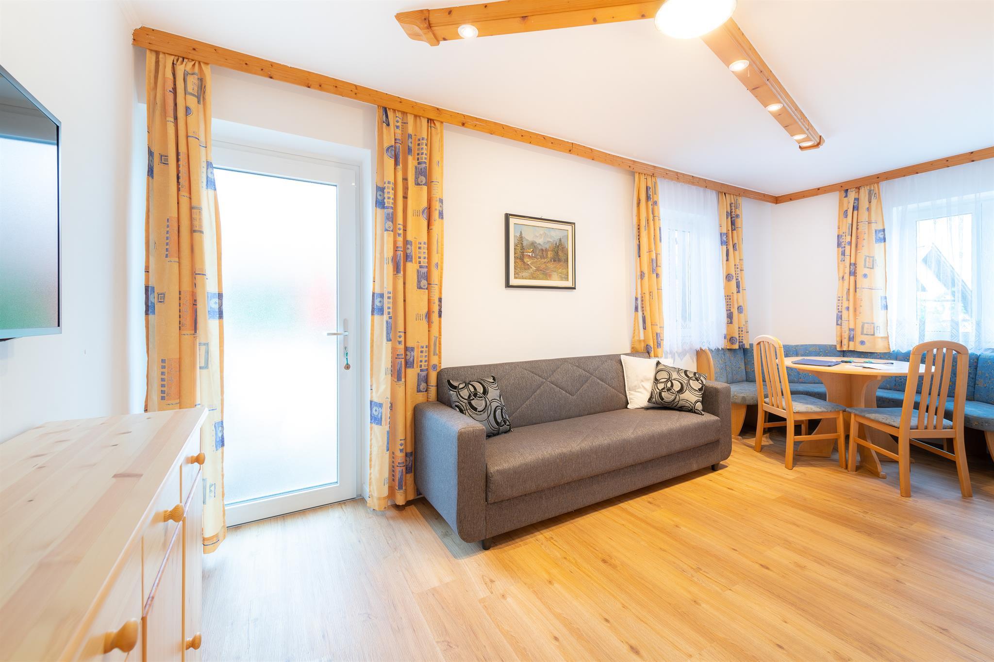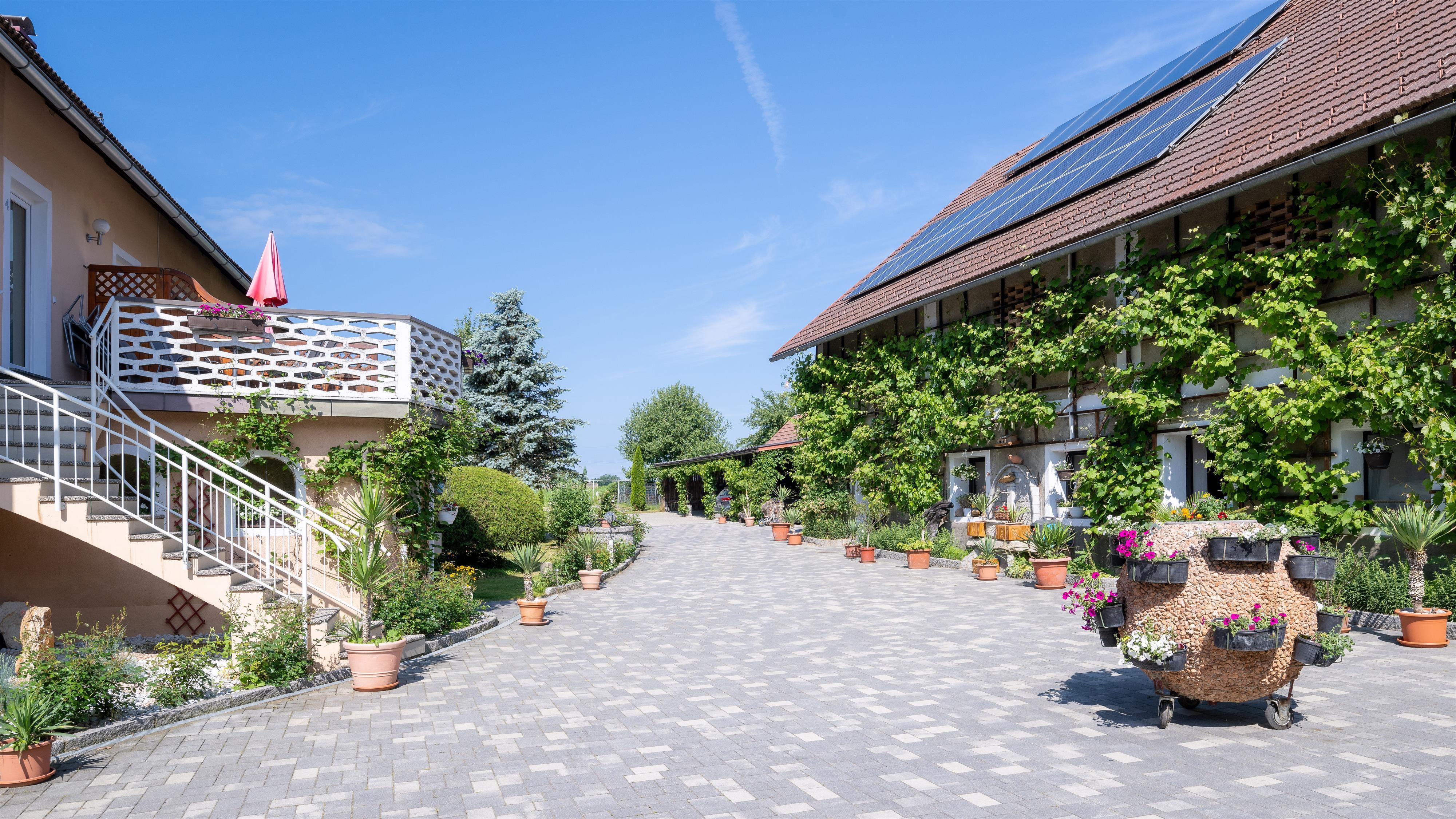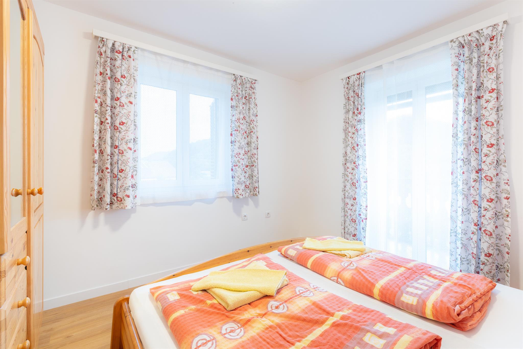 Sie befindet sich im ersten Stockwerk vom Hauptgebäude und verfügt über zwei Doppelzimmern, Bad, Vorzimmer, Wohnküche, großen Balkon, kleinen Balkon und einem Autounterstellplatz.