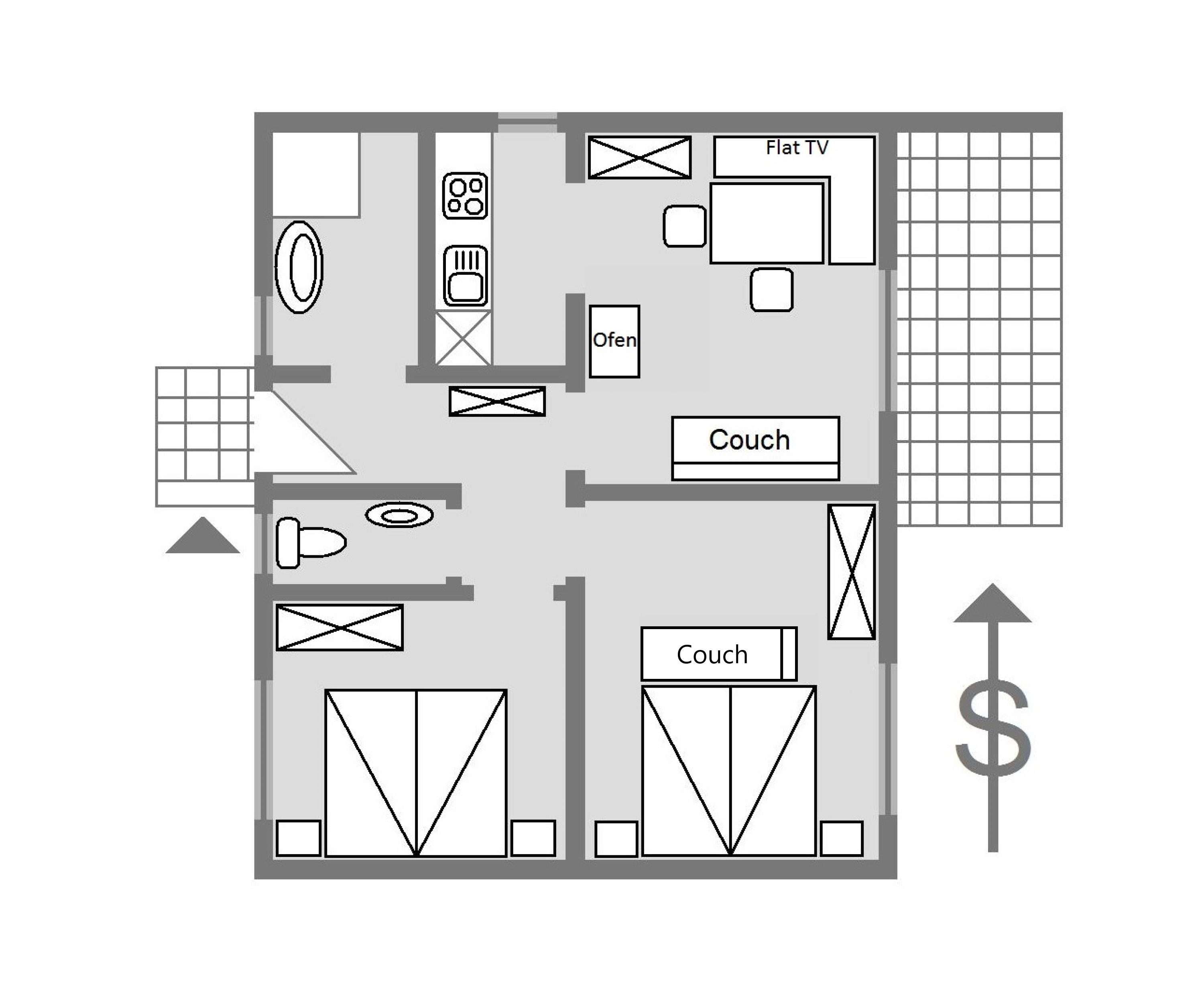 Es besteht aus zwei Doppelzimmern, Vorraum, Dusche, separatem WC, Wohnküche, 9m² Terrasse und einem Autounterstellplatz.