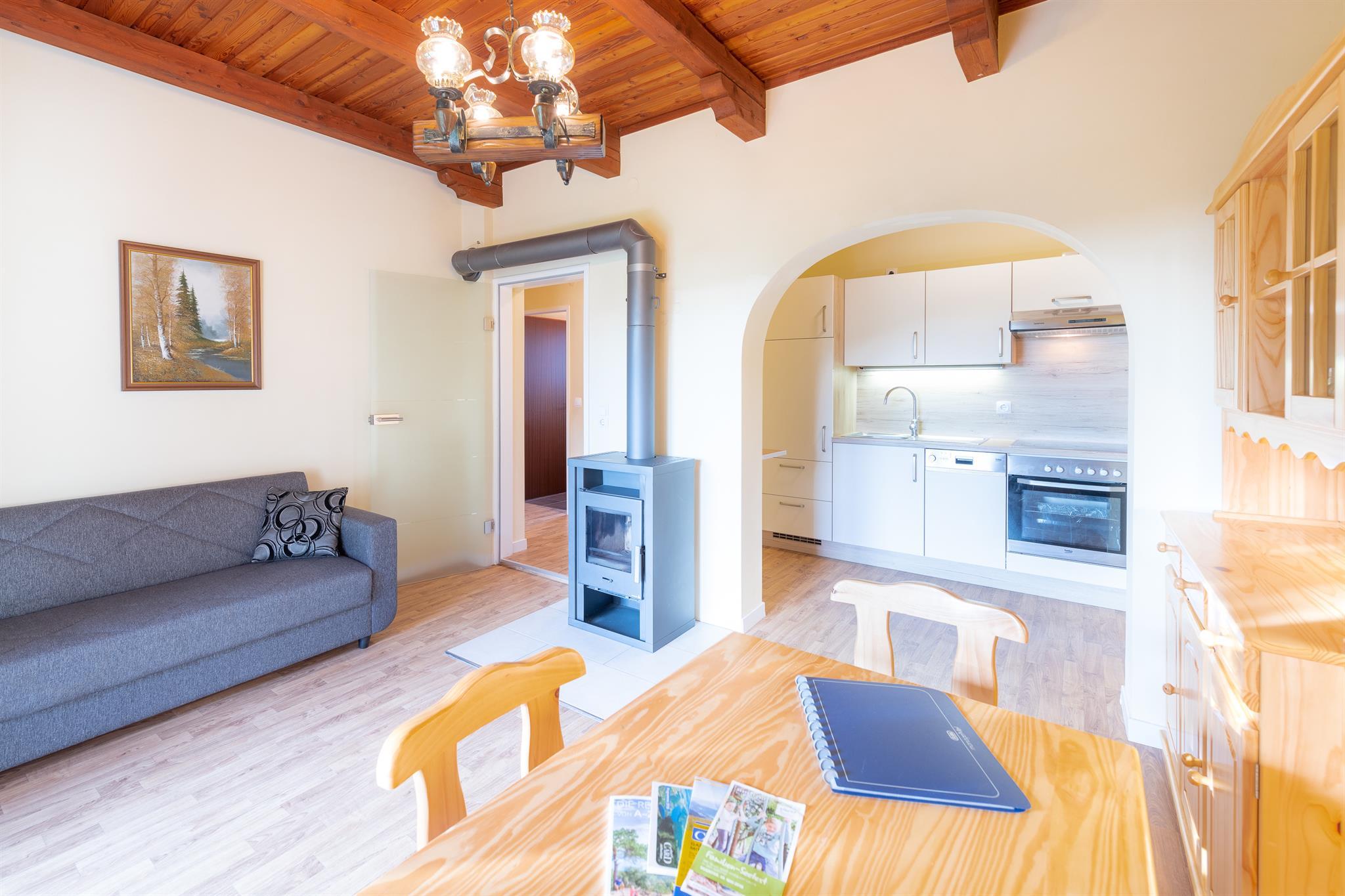 In der Wohnküche finden Sie eine Sitzecke, Ausziehcouch, Flat-TV, Schwedenofen und eine komplett ausgestattete Küche mit Geschirrspüler, Backofen, Herd, Kühlschrank, Besteck, Geschirr und einer Kaffeemaschine.