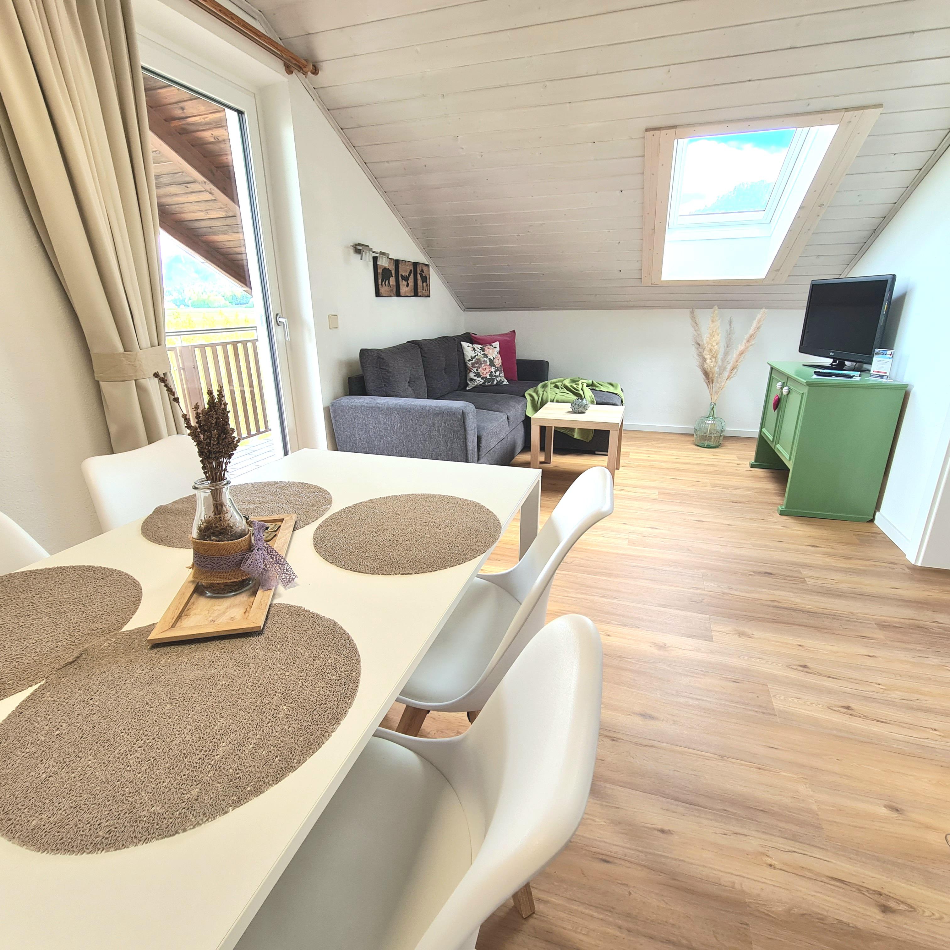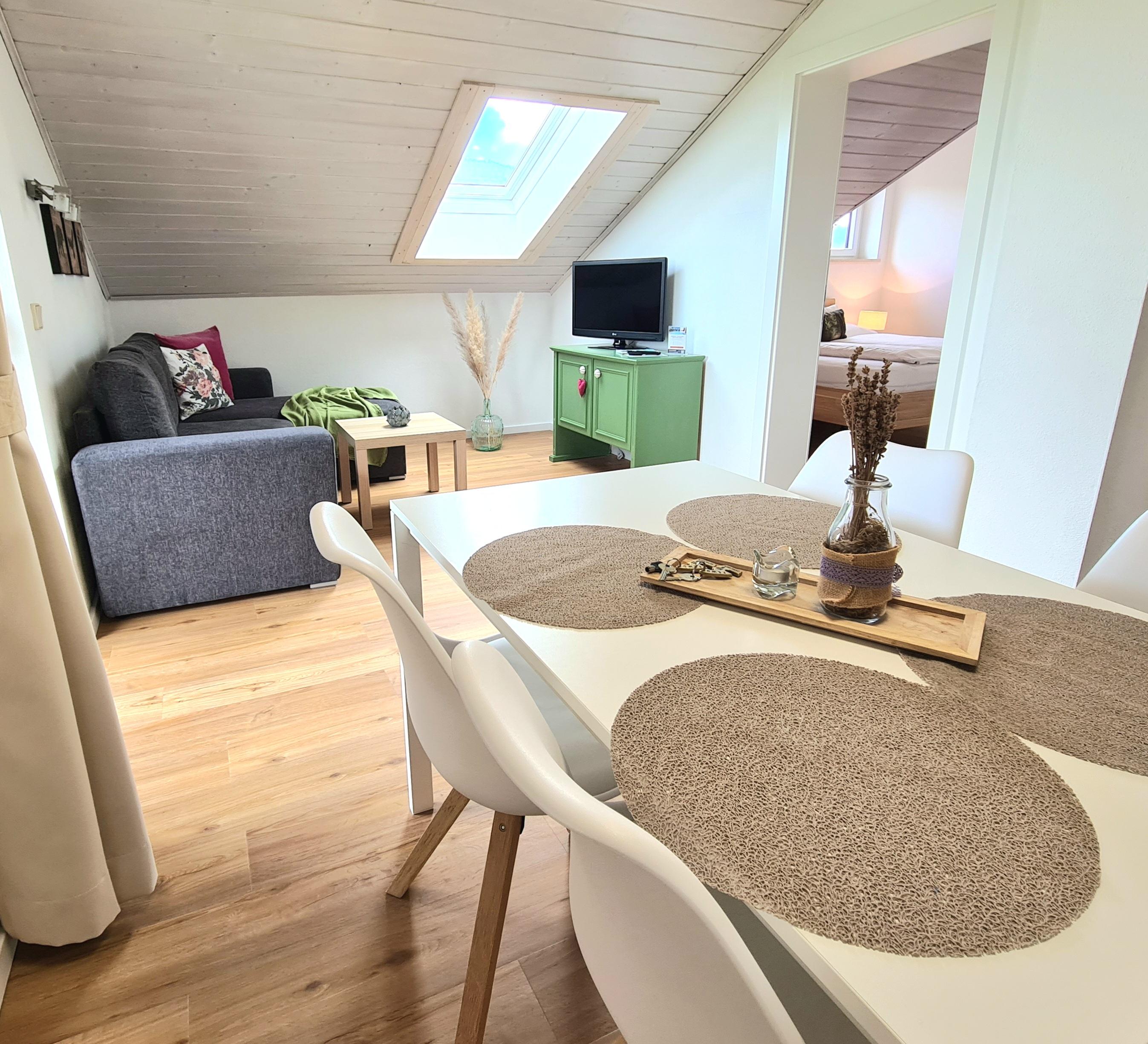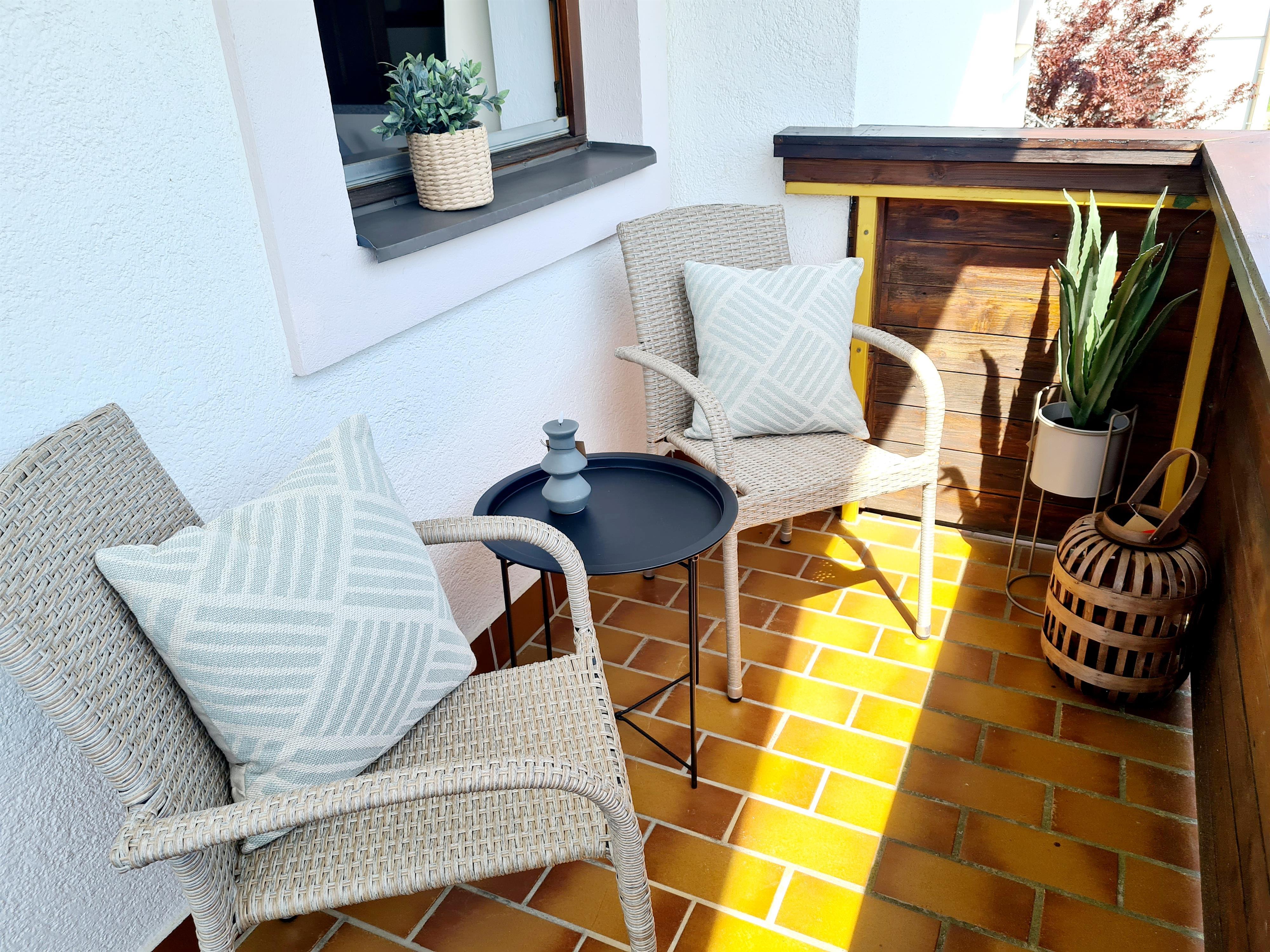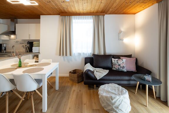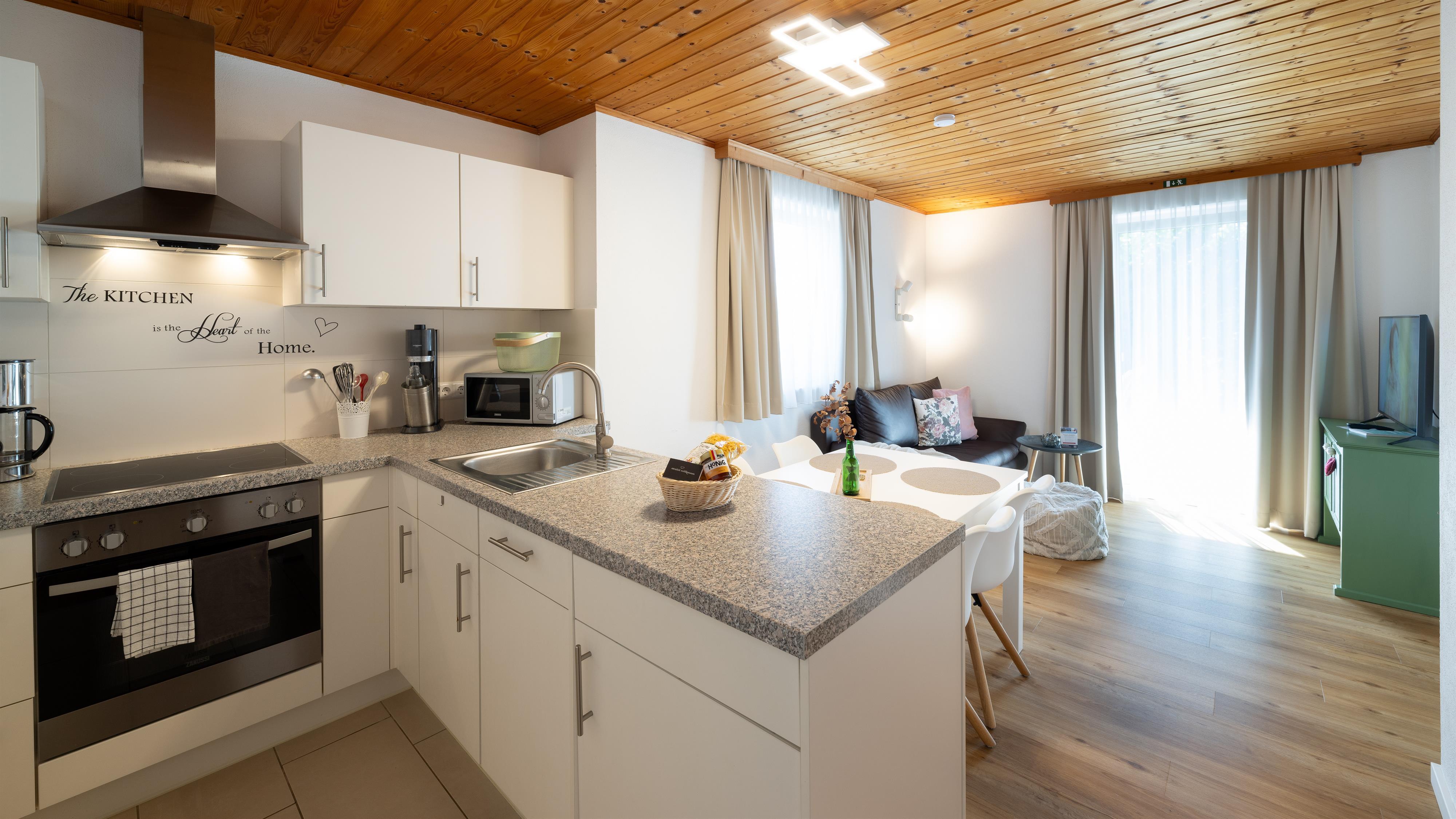 Die Wohnungen bestehen aus einem Vorraum, einem Schlafraum, Dusche/WC,Fön, Wohnzimmer mit ausziehbarer Couch (max. 2 Kinder oder 1 Erwachsener), Esstisch, LCD-TV mit Musikkanal, Internet über W-LAN, komplett ausgestatteter Küche mit Mikrowelle, Geschirrspüler, Backofen, Kaffeemaschine uvm. sowie einem großen Balkon mit Terrassenmöbel. Bett- u. Tischwäsche, Geschirr- u. Handtücher werden bereitgestellt. Auf Wunsch Kinderbett (Gitterbett) und Hochstuhl. Waschservice gegen Gebühr im Haus.